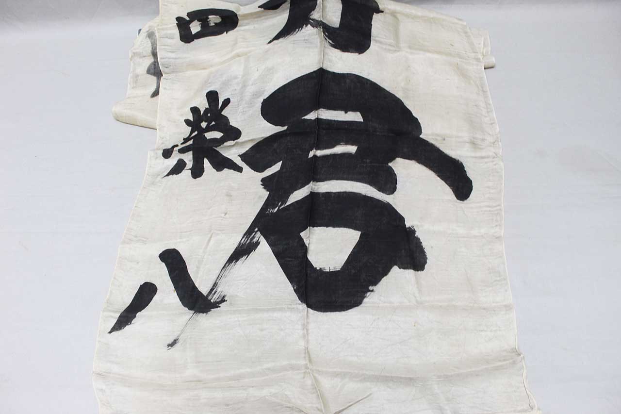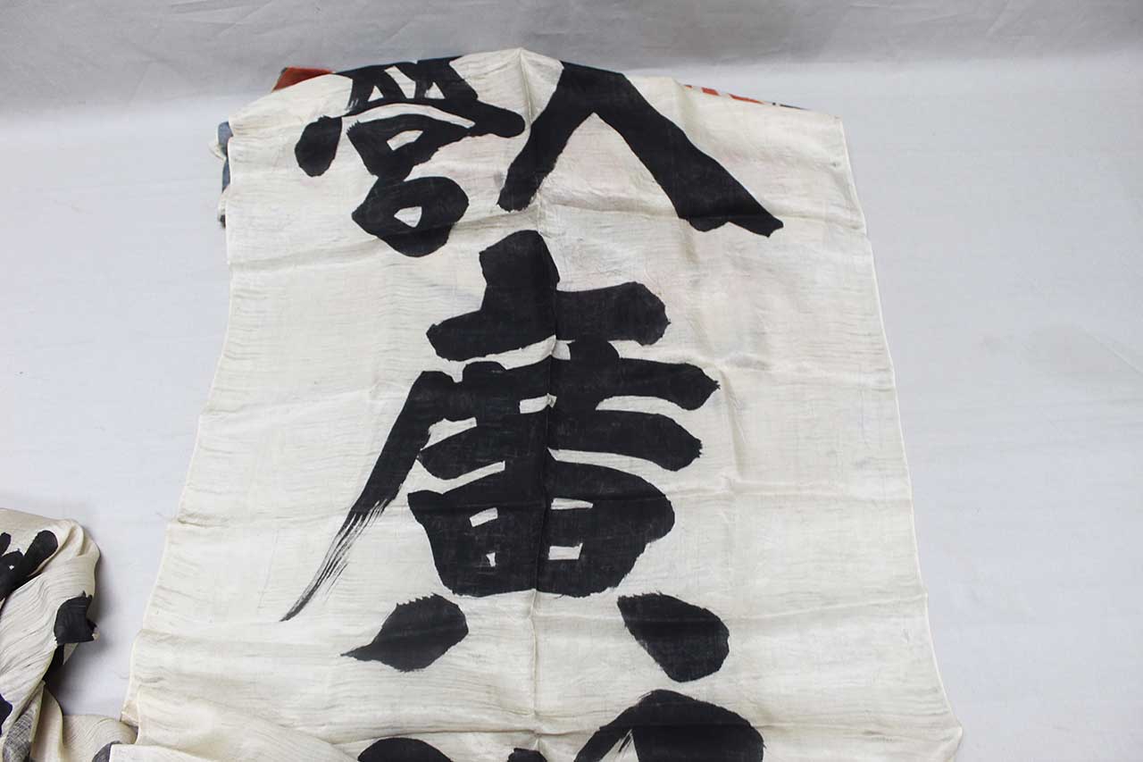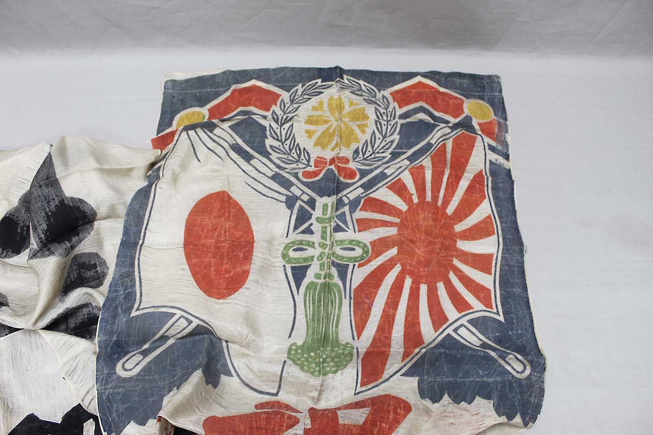 Imperial Japanese Good Luck Banner. Has the design of the Japanese National Flag and Japanese Rising Sun Flag at the top of the banner. Japanese banner celebrating and wishing luck to soldier or sailor off to do battle. Size approximately 26 inches wide x 10ft 9 inches. Most likely 1940s (ww2) era. Worn condition.