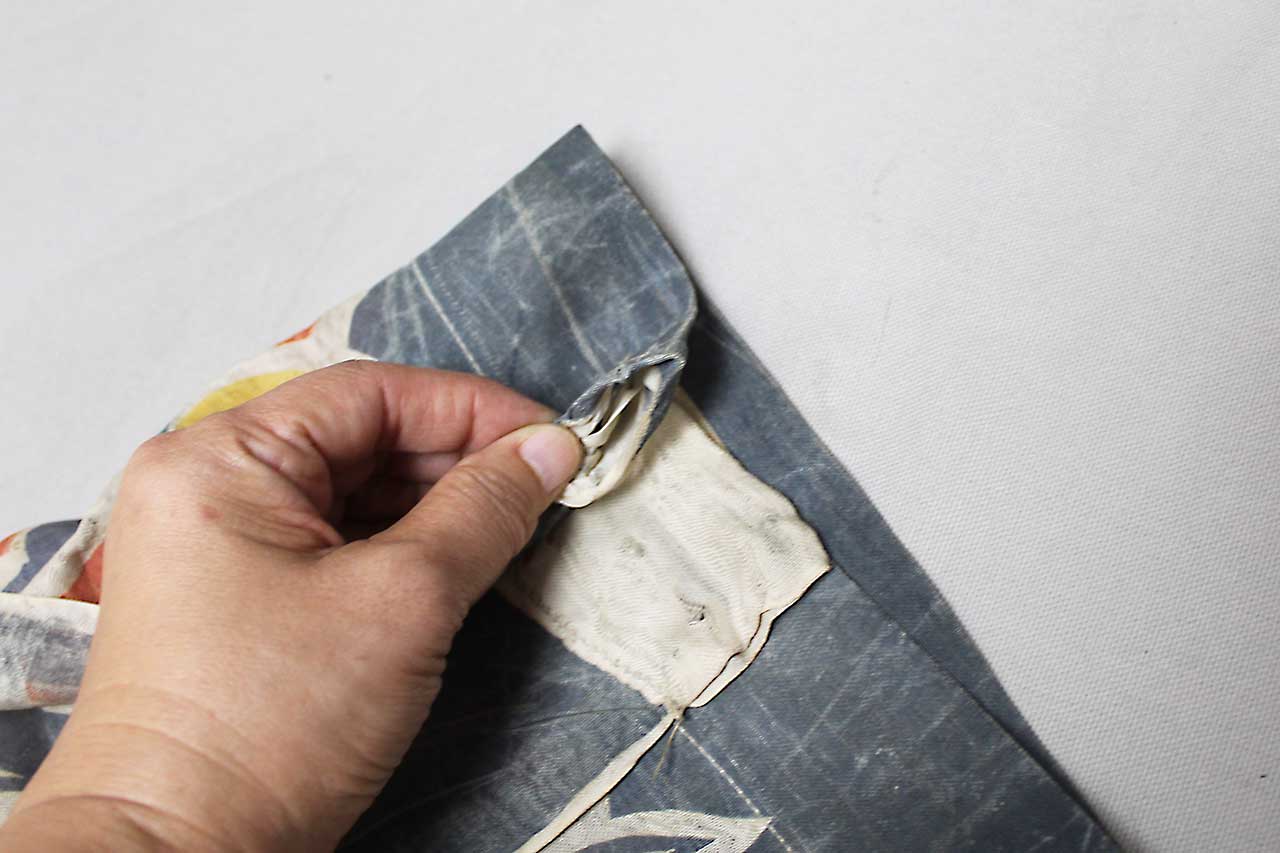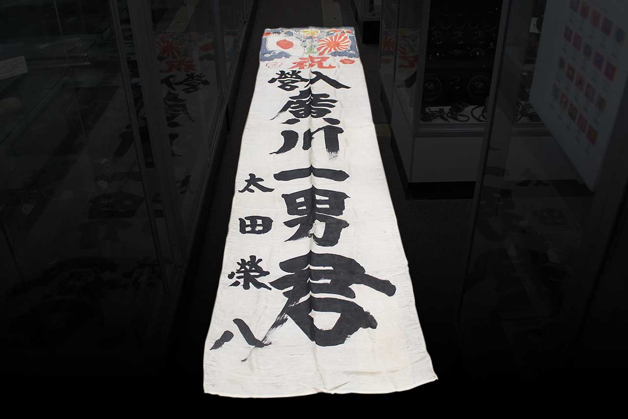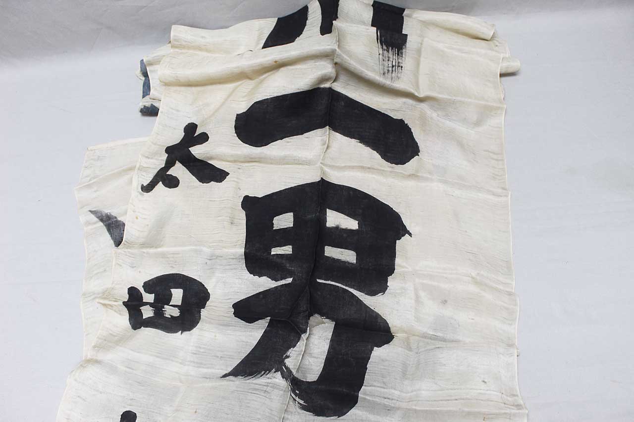 Imperial Japanese Good Luck Banner. Has the design of the Japanese National Flag and Japanese Rising Sun Flag at the top of the banner. Japanese banner celebrating and wishing luck to soldier or sailor off to do battle. Size approximately 26 inches wide x 10ft 9 inches. Most likely 1940s (ww2) era. Worn condition.