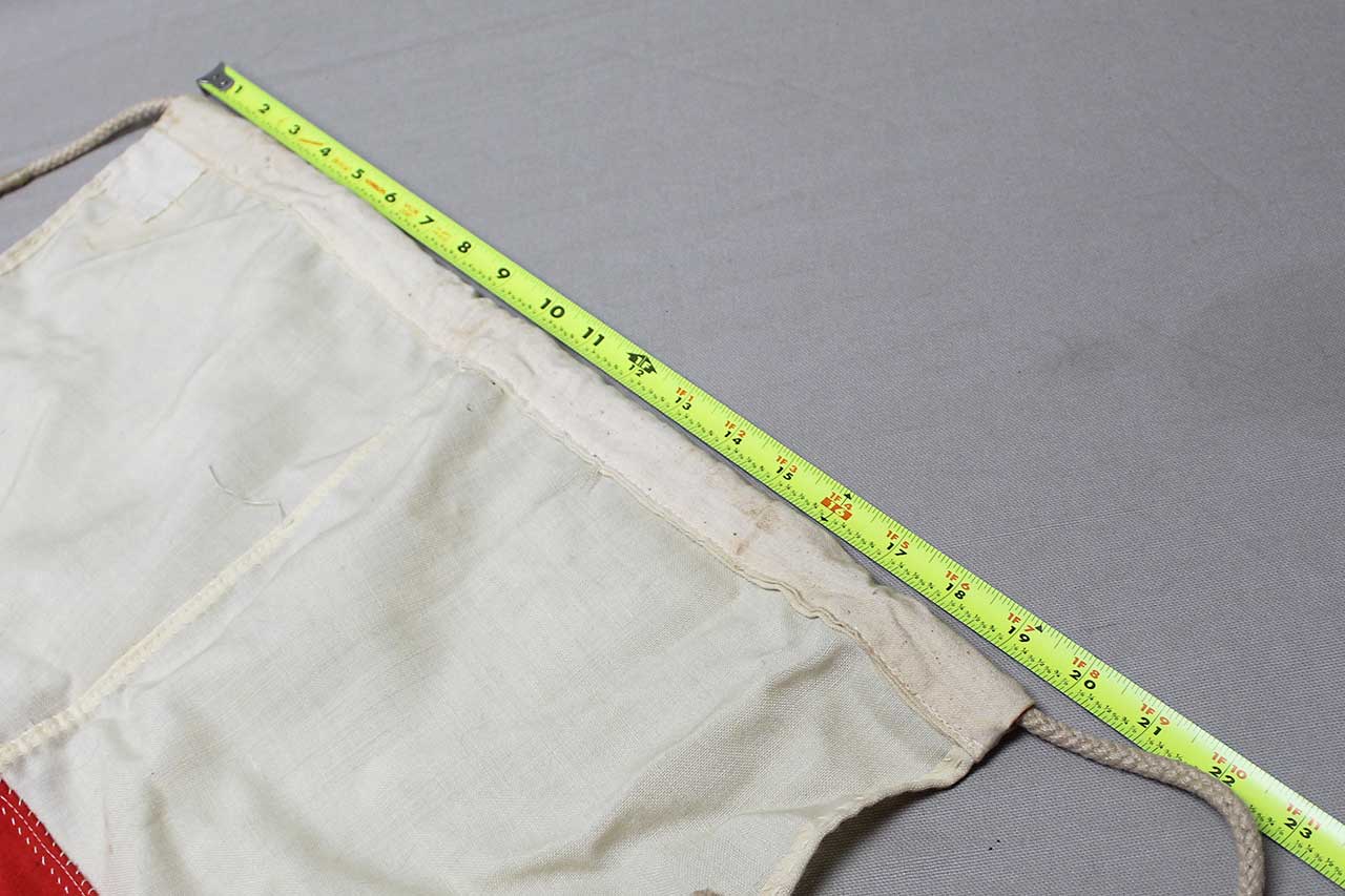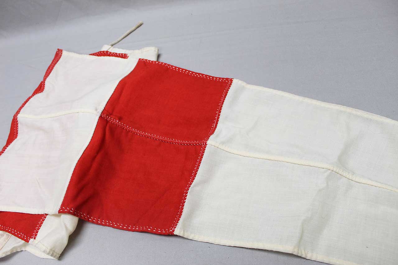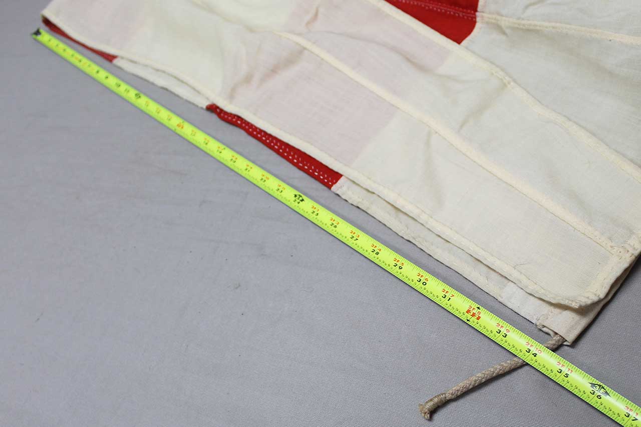 WW2 Japanese Navy signal flag (code and answering pendant). Japanese tag in the corner of the flag and ropes on top and bottom. Scattered small holes and wear. Size approximately 68 inches long by 19 inches in height. Worn condition.