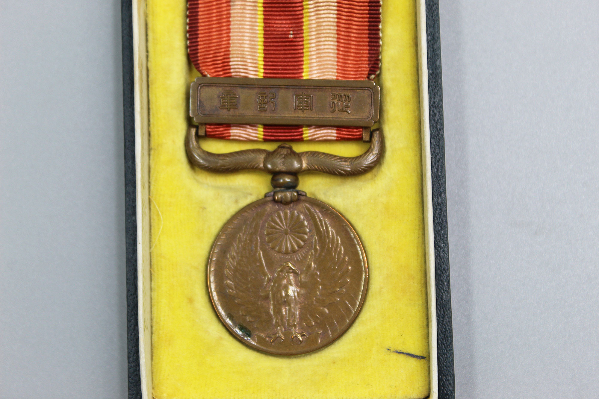 Japanese 1931-34 Manchurian Incident War Medal in case. Medal has the original ribbon with hook and eye attachment. On the bar is written “Military Medal of Honor” reading from right to left. Medal is in hard-shelled box of issue with recessed portion for the medal and golden kanji on top of case. Worn and used condition.