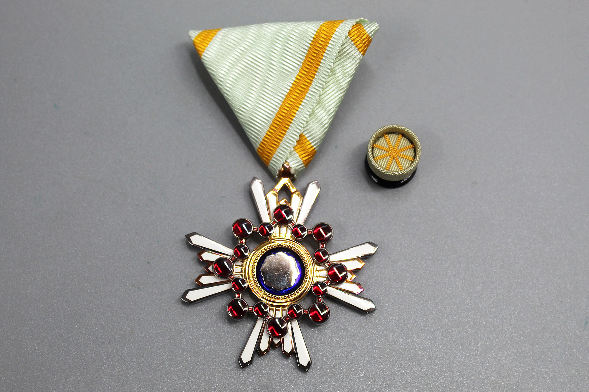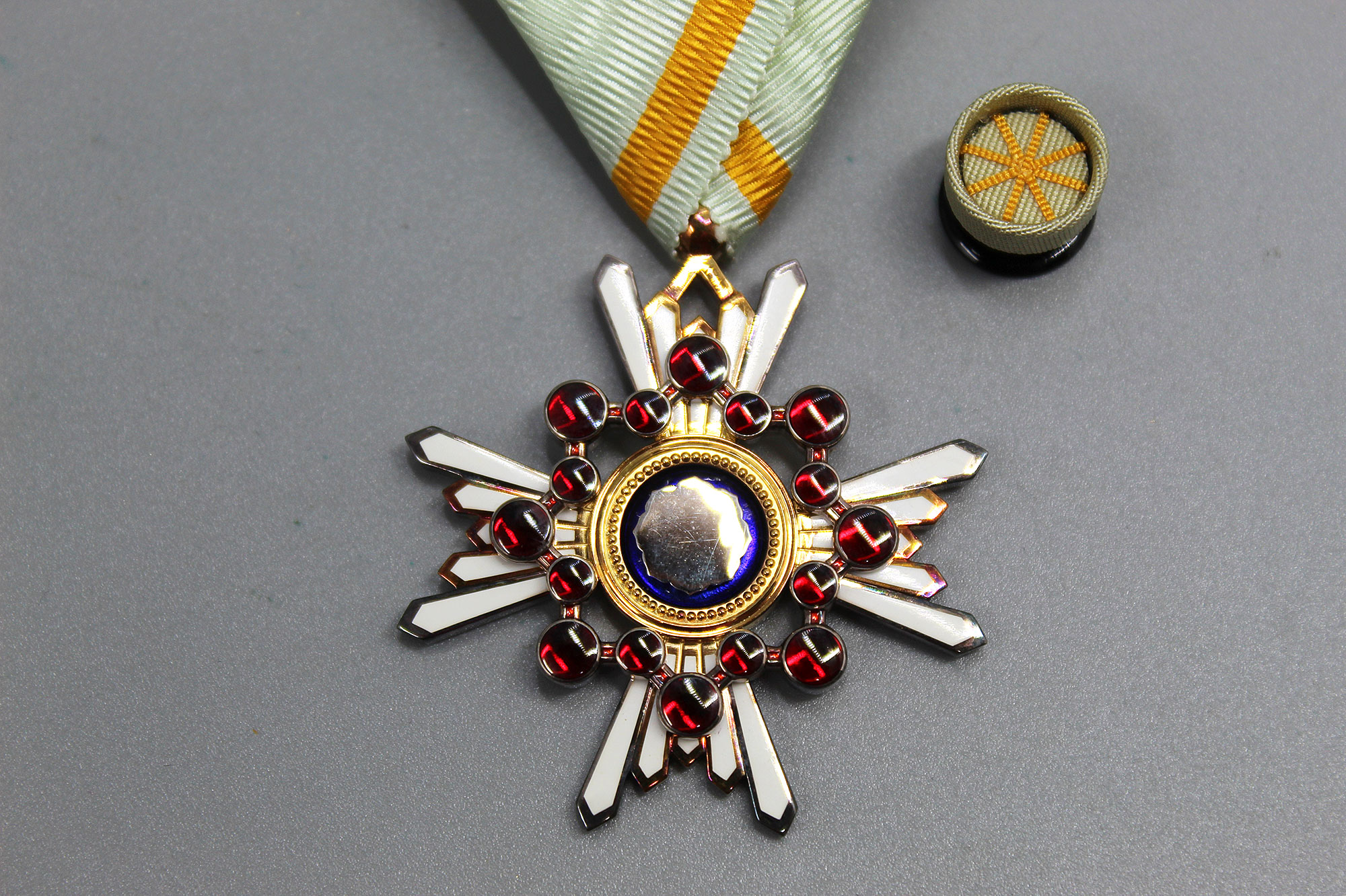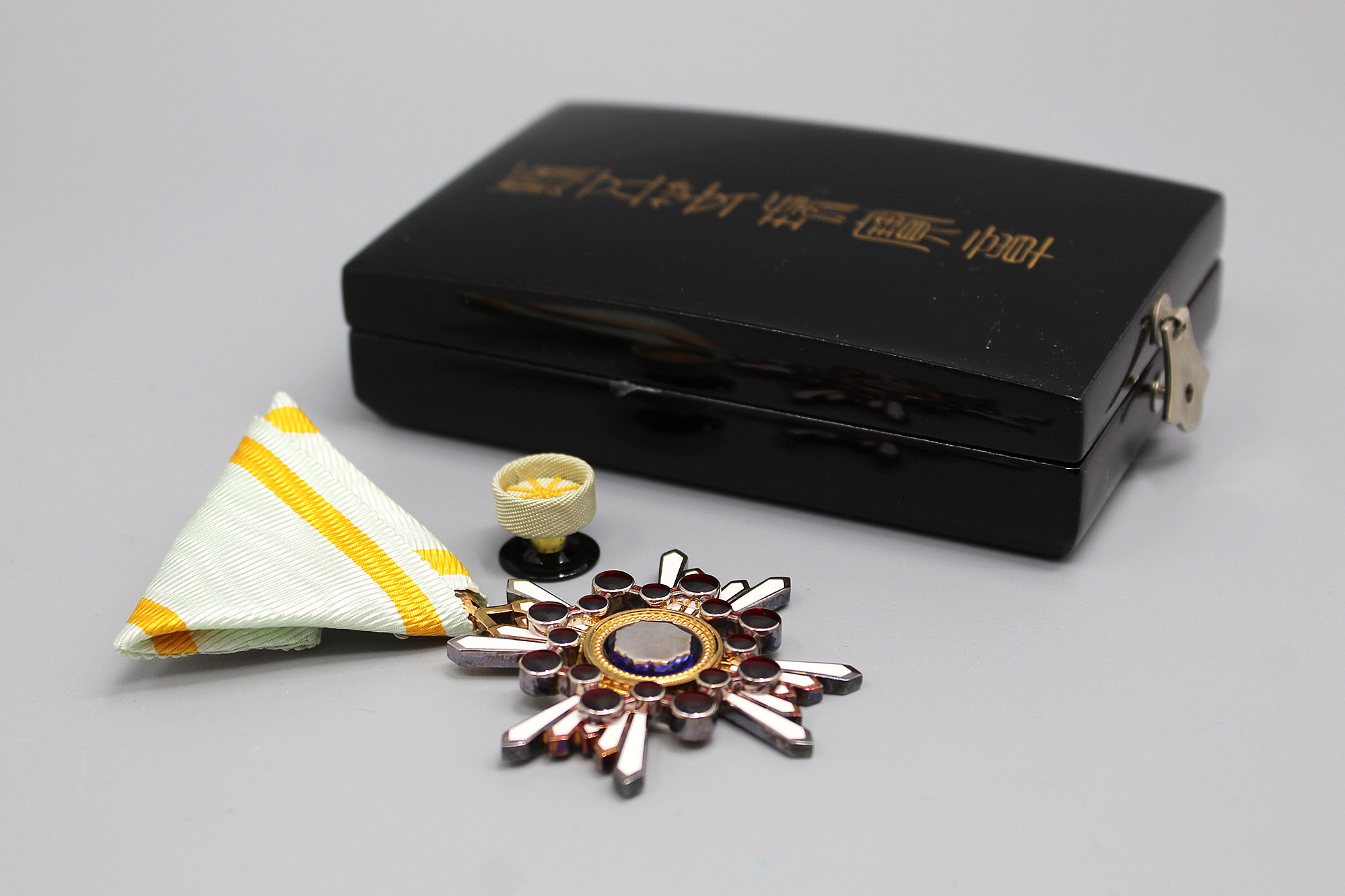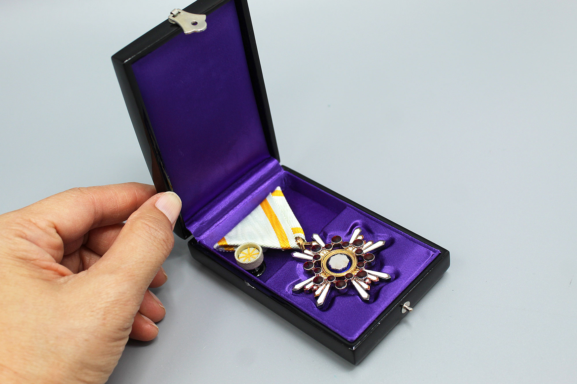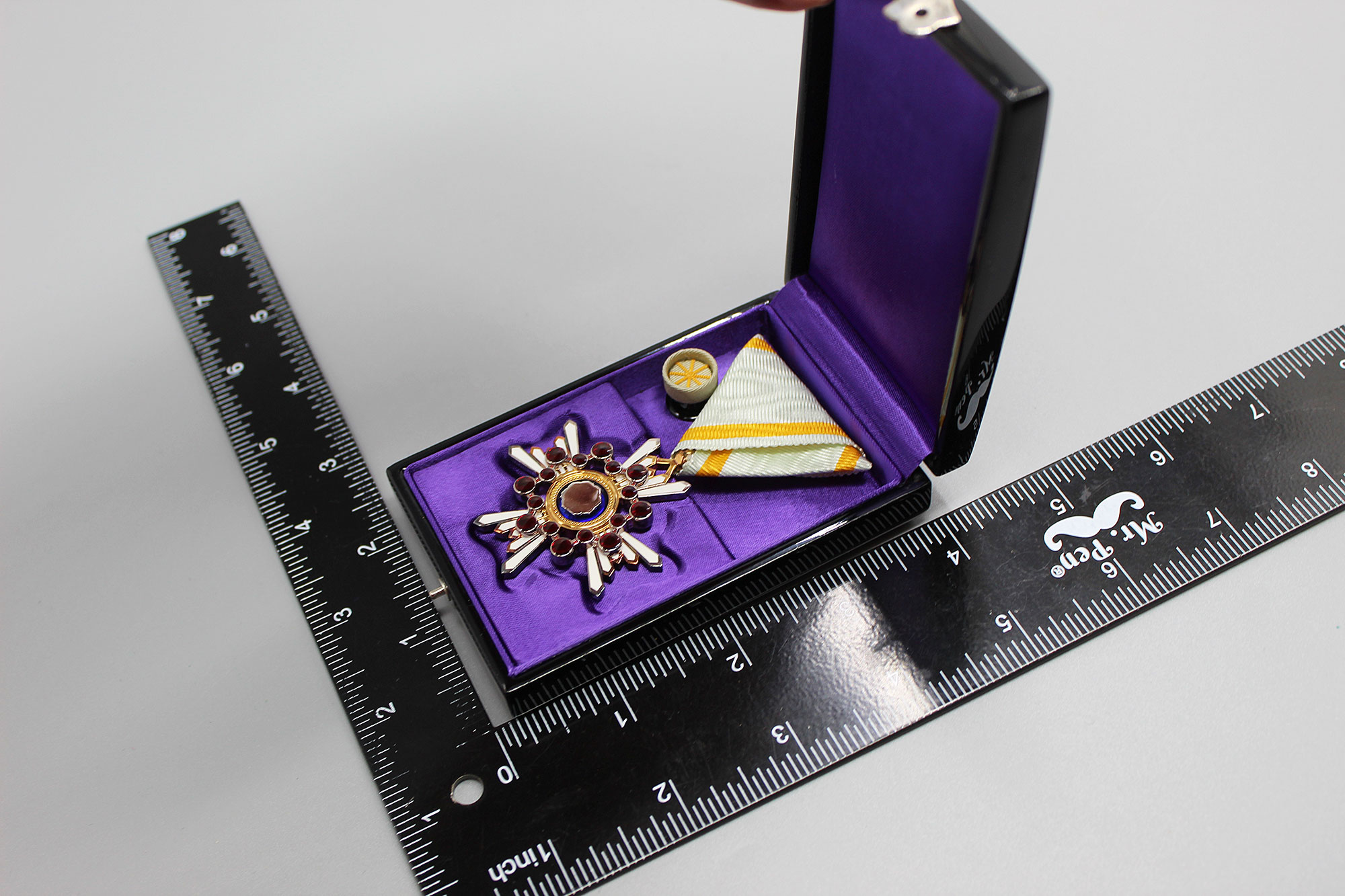 ADDITIONAL INFORMATION: The Order of the Sacred Treasure was established in January of 1888 by Emperor Meiji as the Order of Meiji. Originally awarded in eight classes (from 8th to 1st, in ascending order of importance), since 2003 it has been awarded in six classes, the lowest two medals being abolished that year. The most widely conferred Japanese order, it is awarded to those who have made distinguished achievements in research fields, business industries, healthcare, social work, state/local government fields or the improvement of life for handicapped/impaired persons.