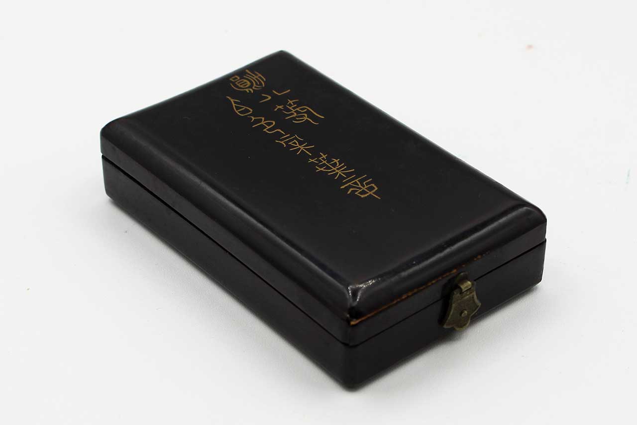 Japanese Rising Sun 8th class in black lacquered wood case. I believe this one is from approximately 1930-1950s era. Worn condition.