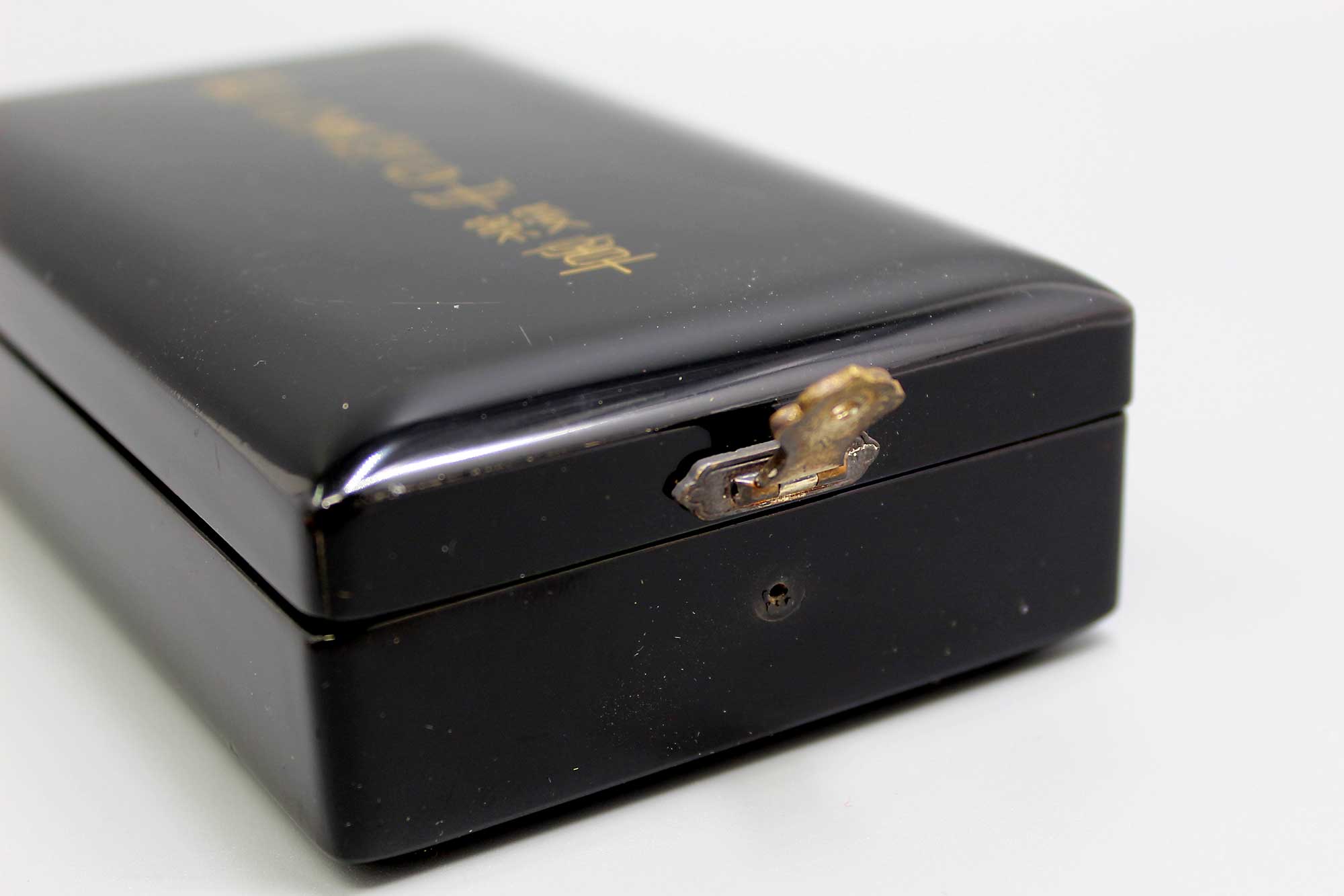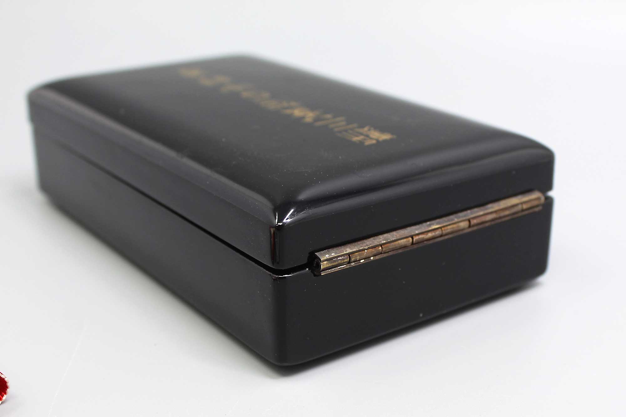 Japanese Order of the Rising Sun 3rd Class in black lacquered wood case with neck ribbon. I believe this one is from approximately 1930-1950s era. Worn condition with some edge chipping to the black lacquered case and lock knob also missing on lower portion of case.
