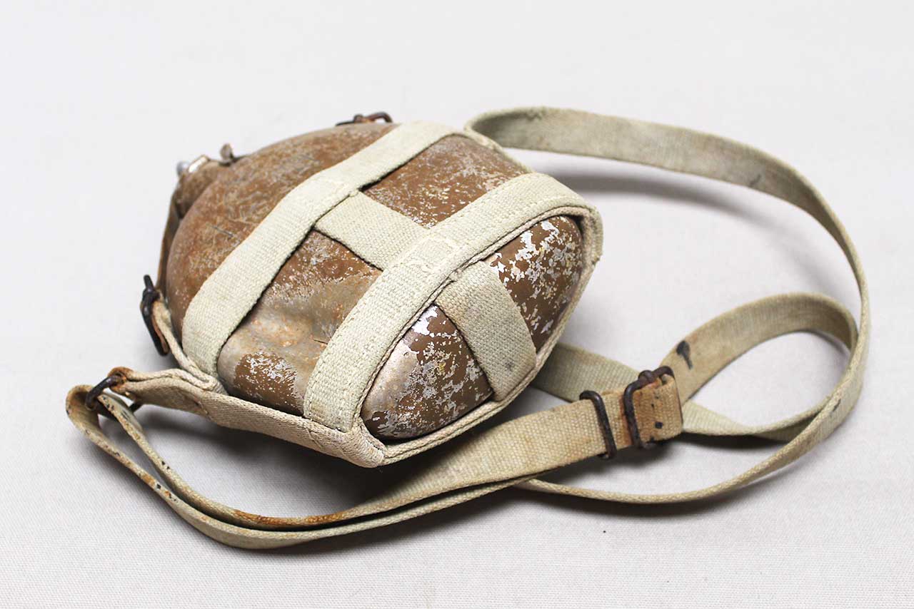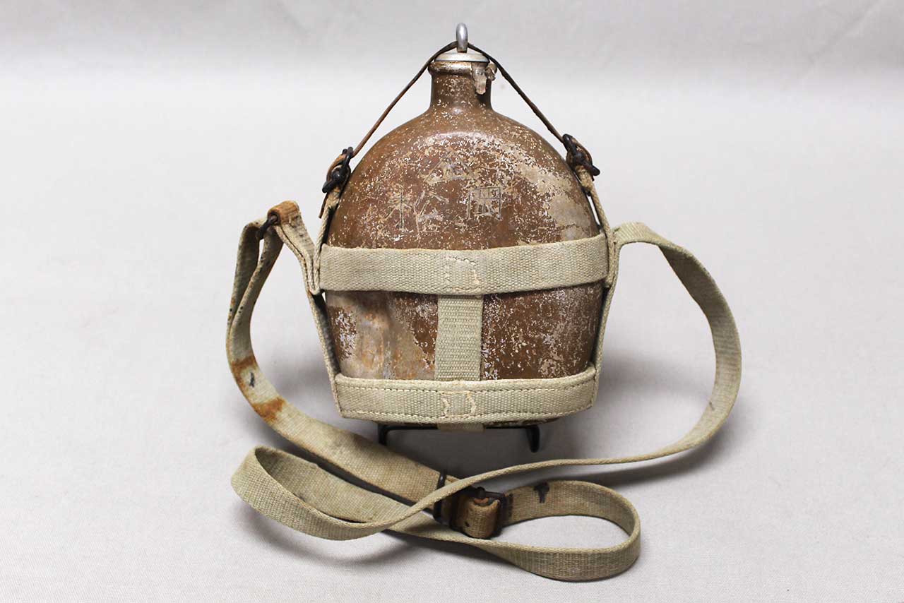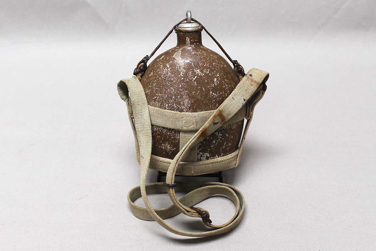 WW2 Imperial Japanese Army (IJA) Type 94 Canteen with strap. Worn condition. Painted aluminum canteen (some paint loss as typical) with stopper and web carry harness, also, has battle damage hit to lower portion of canteen and Kanji etched into canteen. Very heavily worn condition.