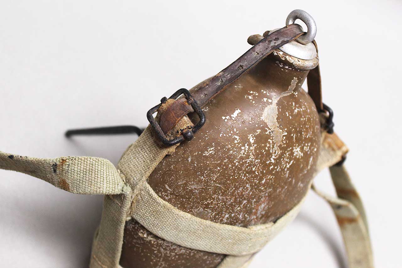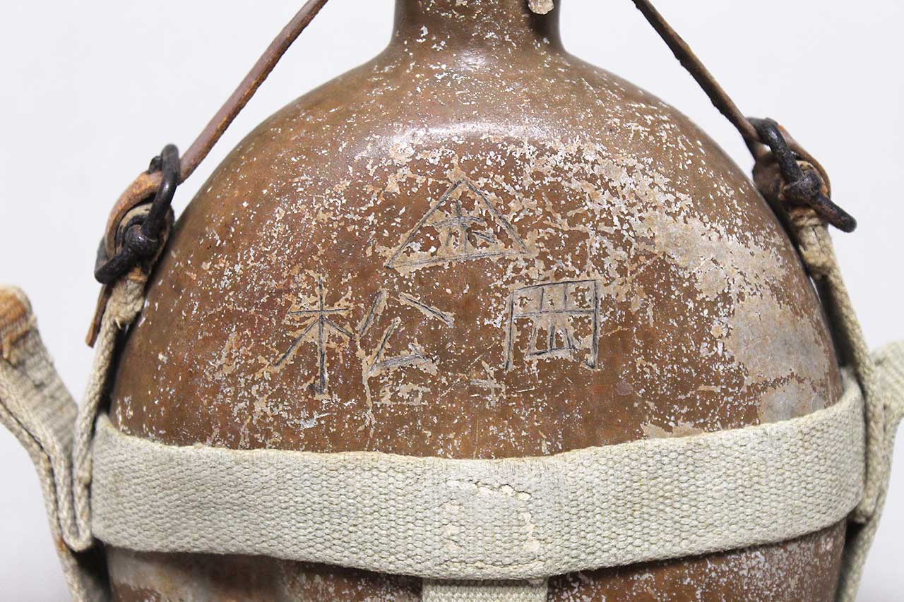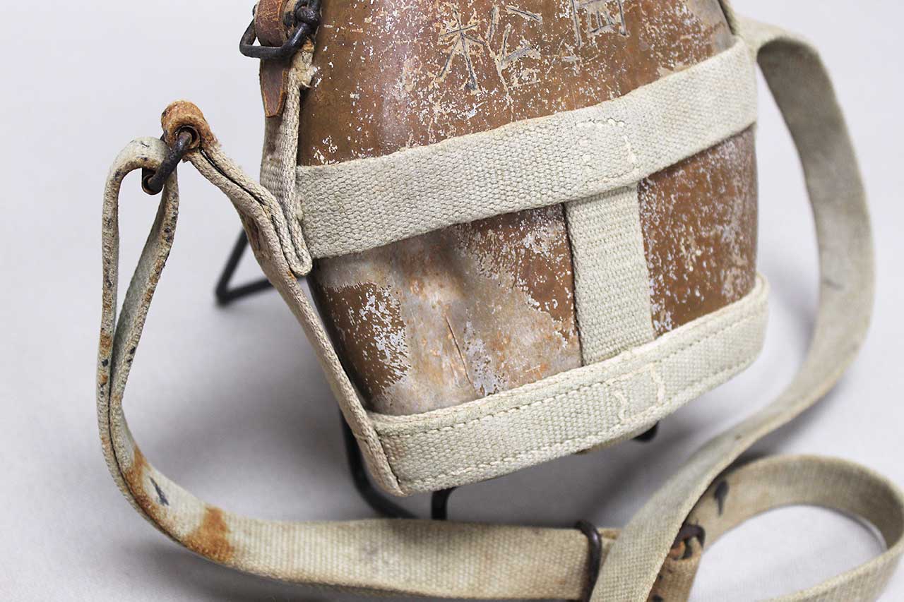 WW2 Imperial Japanese Army (IJA) Type 94 Canteen with strap. Worn condition. Painted aluminum canteen (some paint loss as typical) with stopper and web carry harness, also, has battle damage hit to lower portion of canteen and Kanji etched into canteen. Very heavily worn condition.
