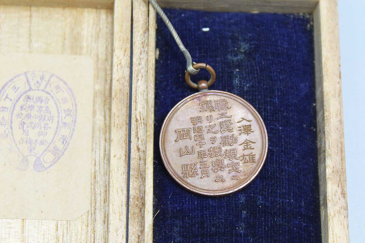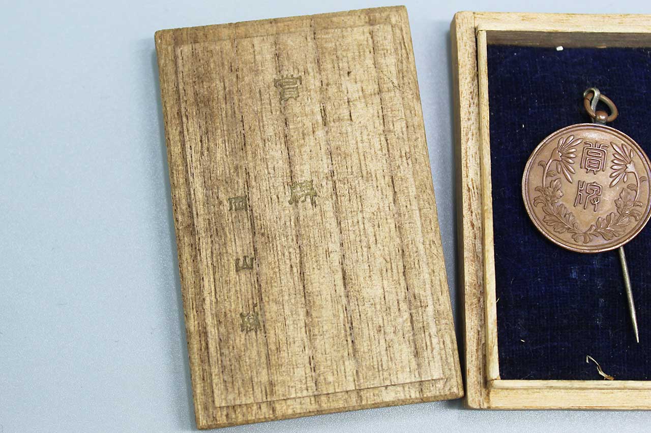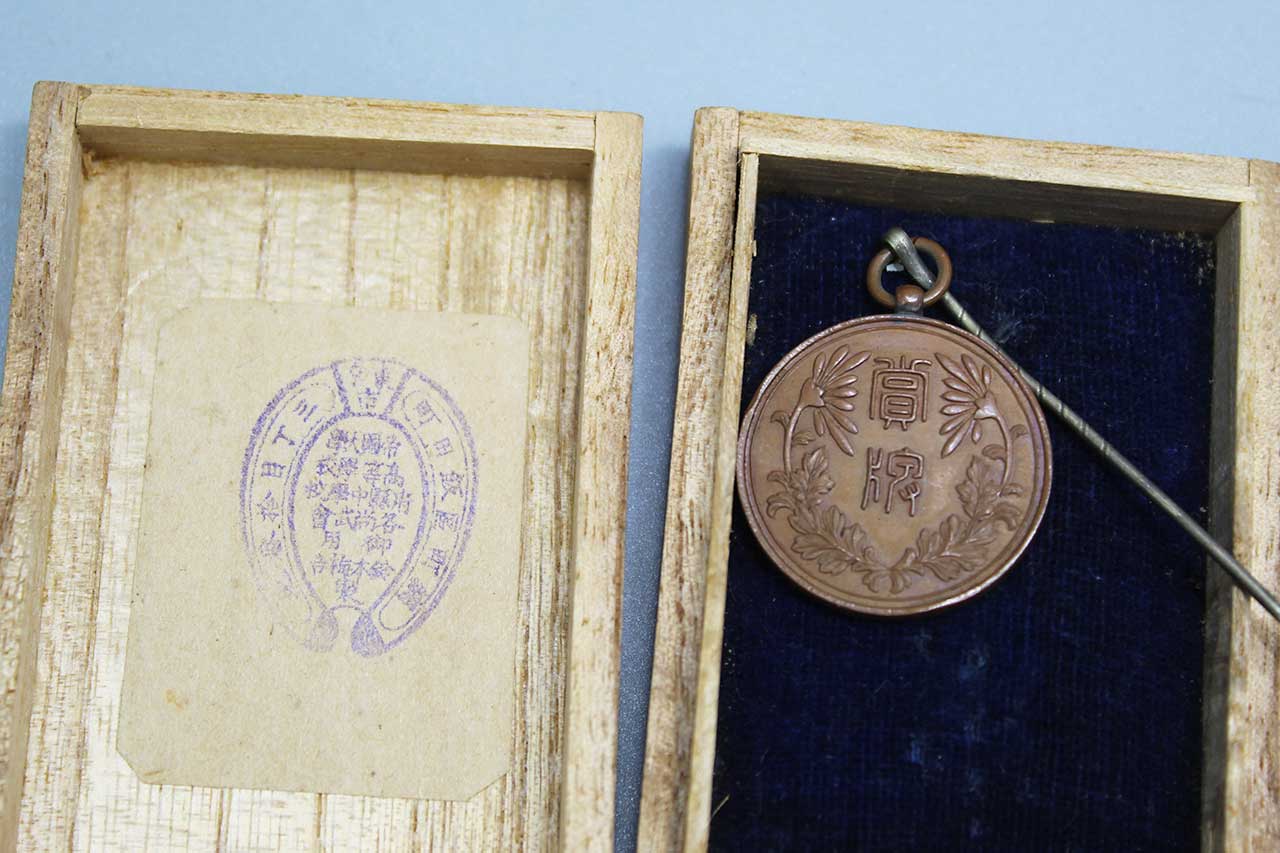 Imperial Japanese Small Pin in small wooden box. Worn condition.
