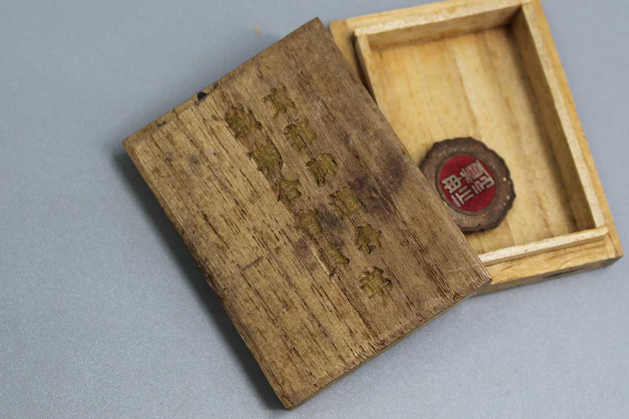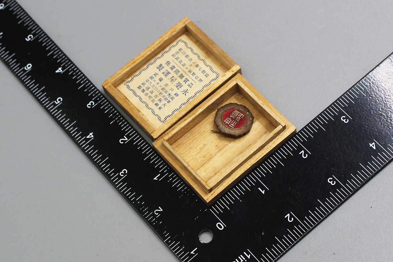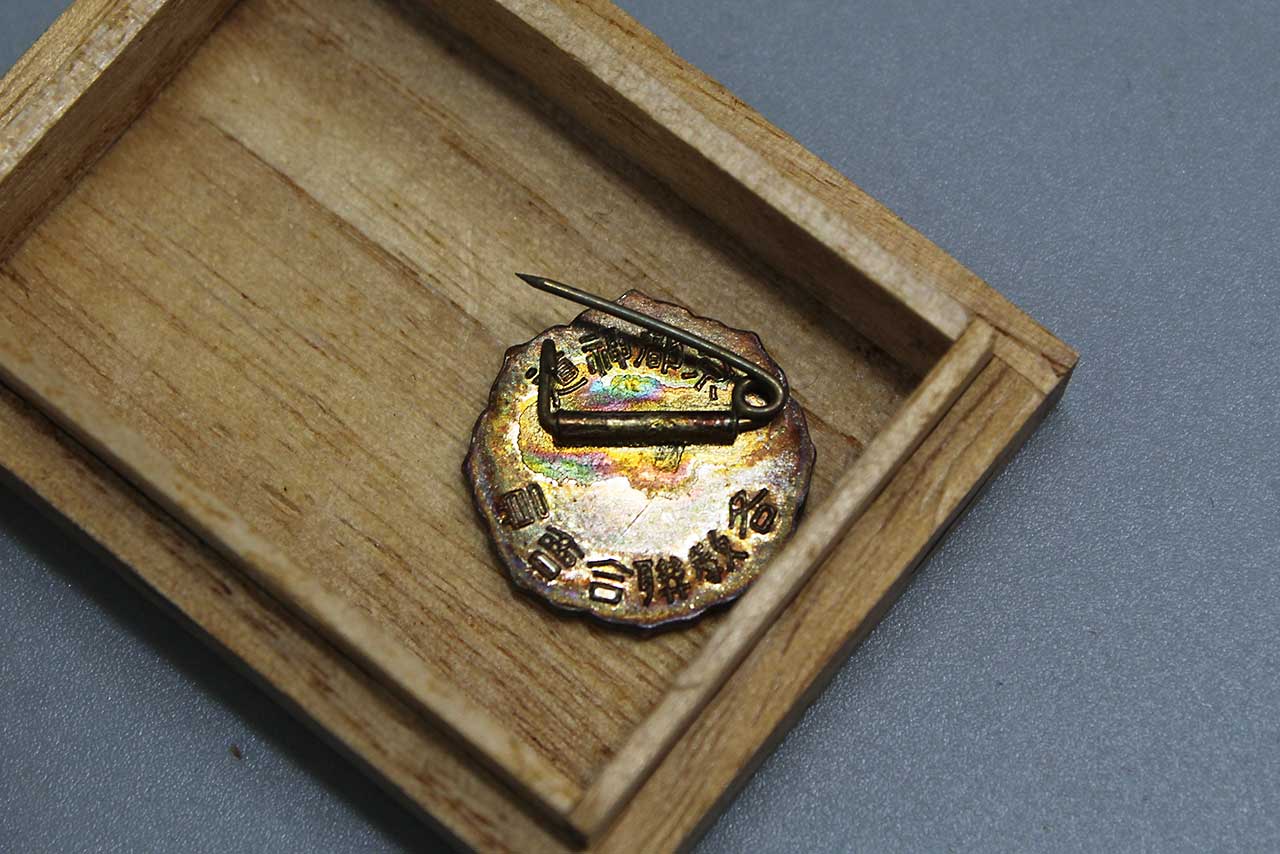 Imperial Japanese Small Pin in small wooden box. Worn condition.