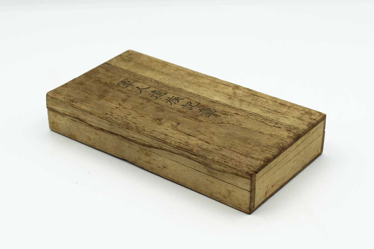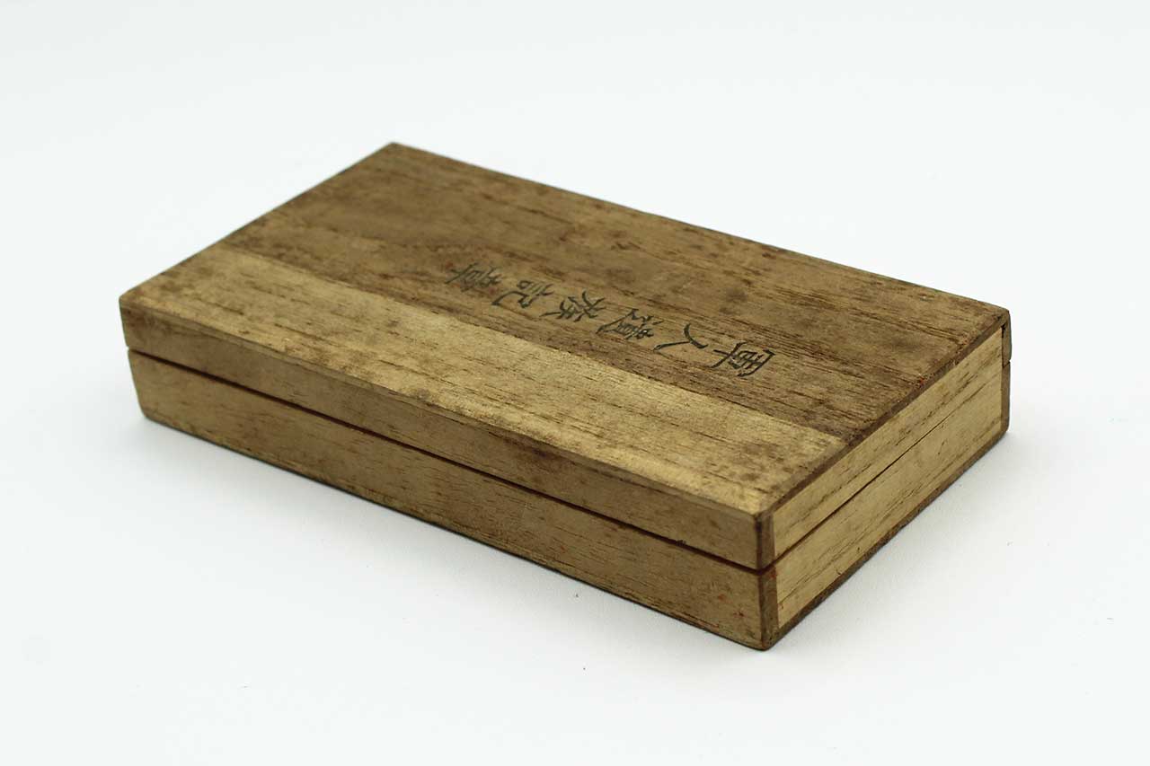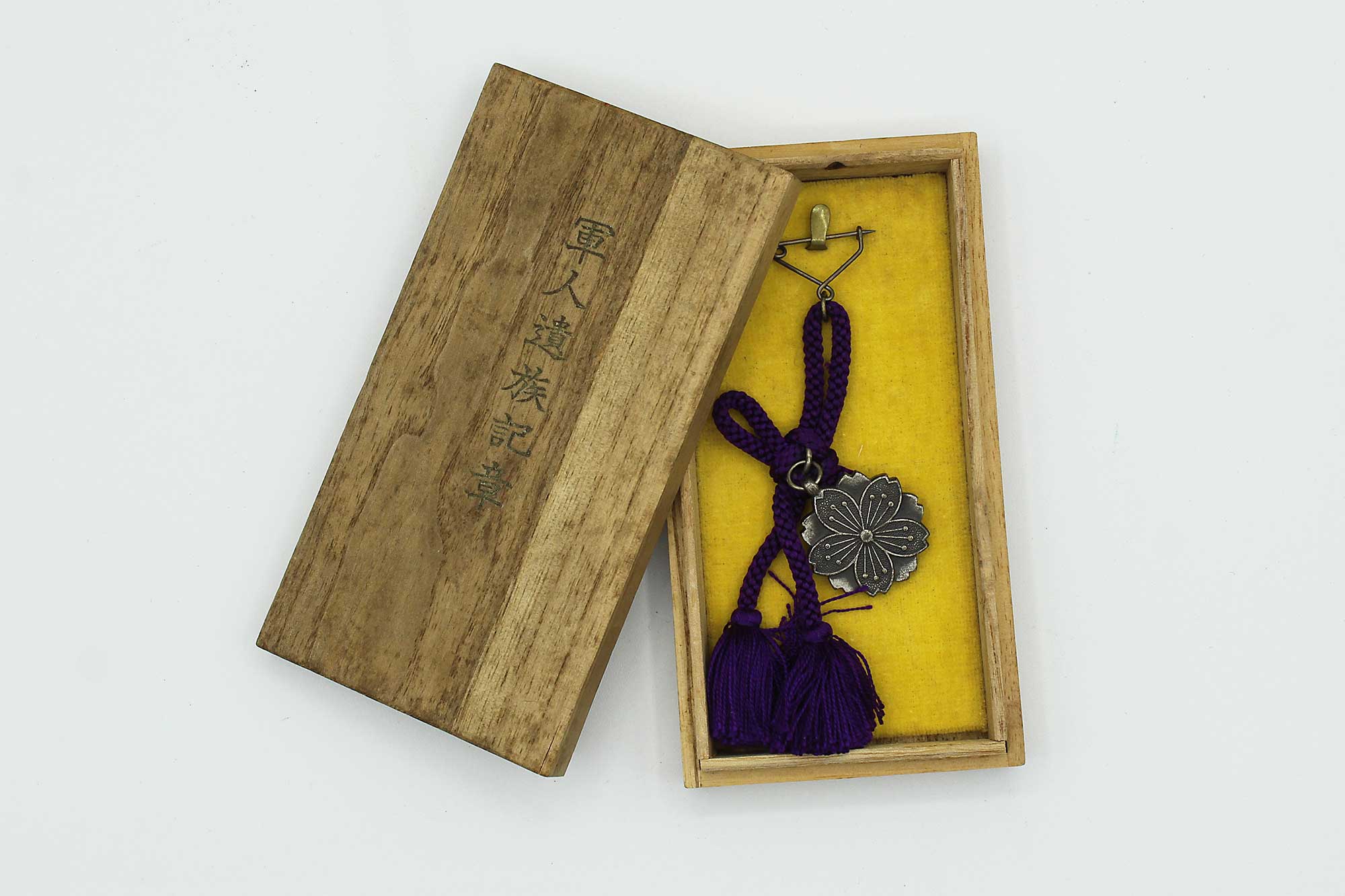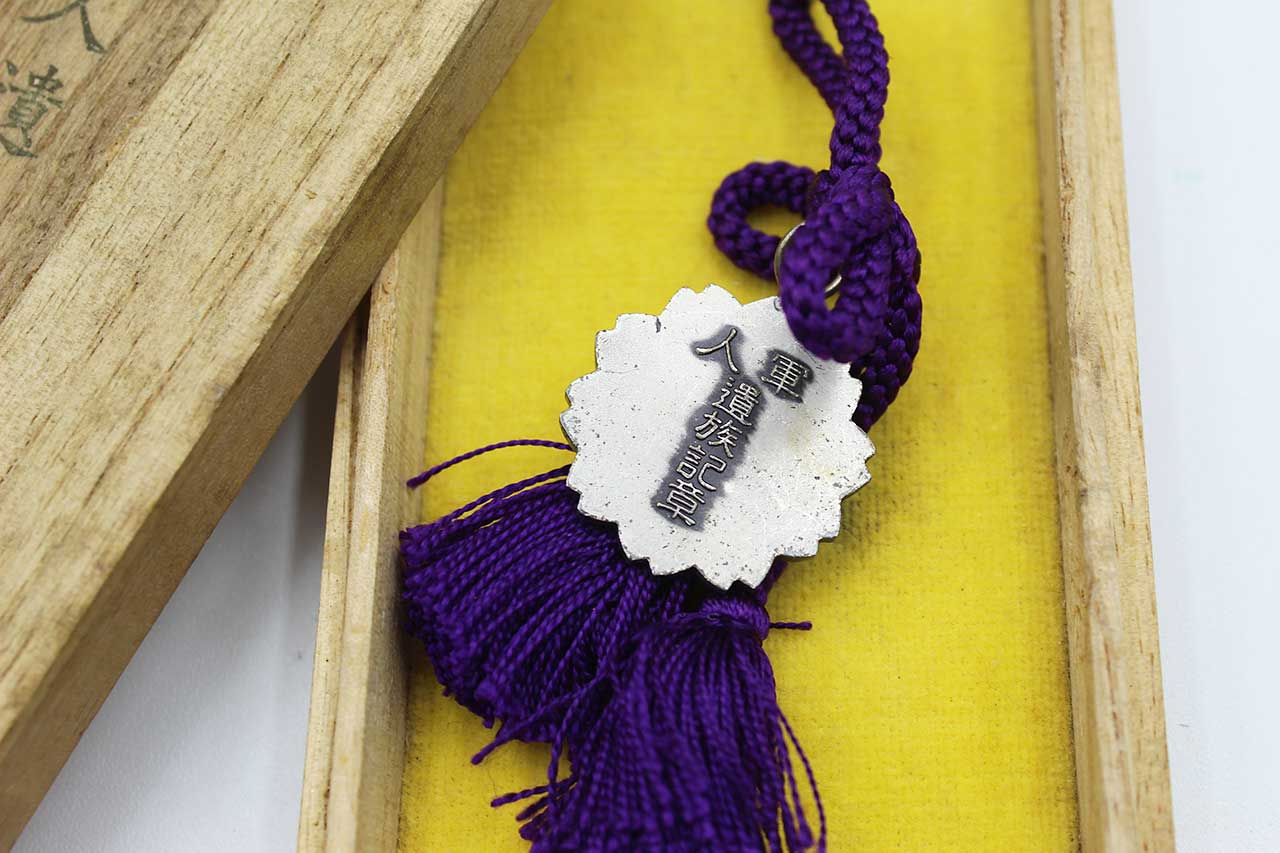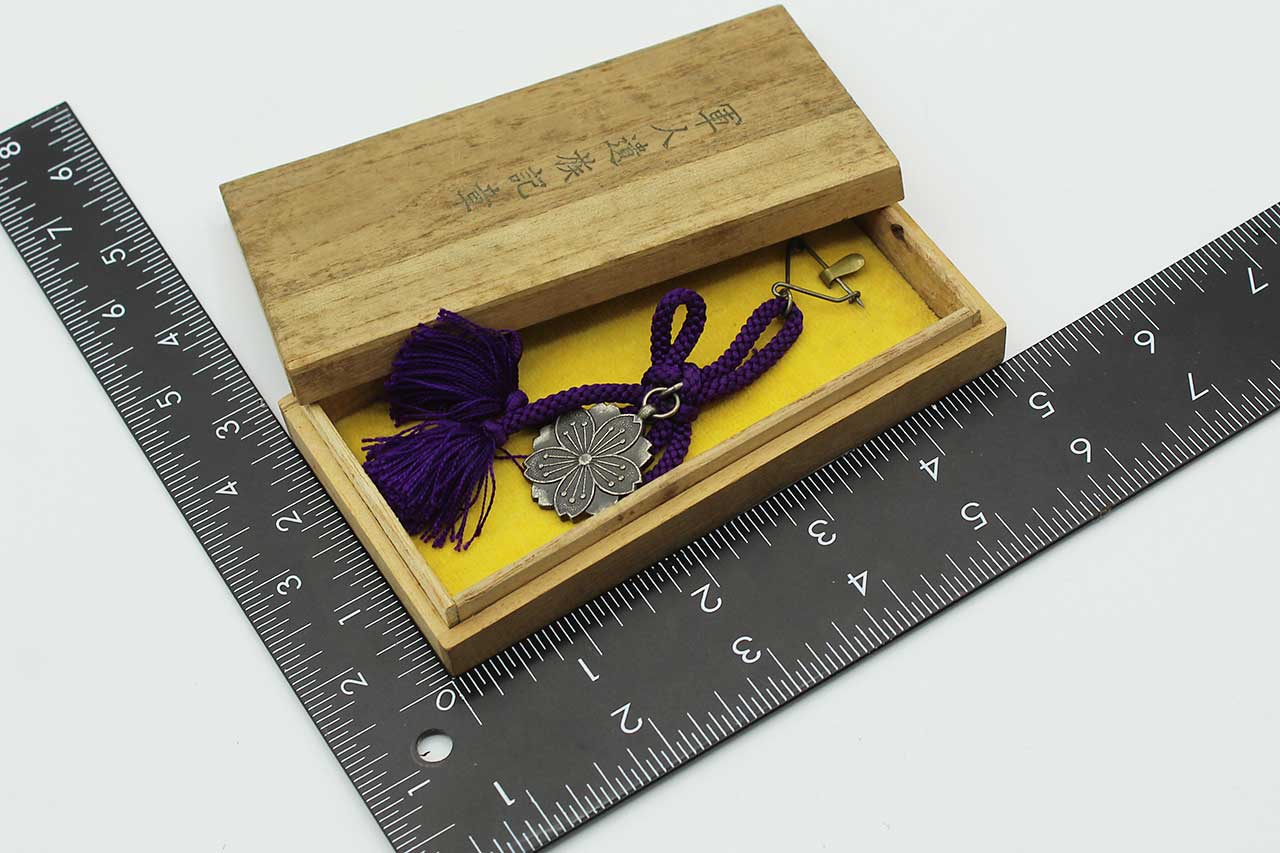 Japanese KIA Combat Badge (Bereavement badge) with purple cord in wood presentation box. Most likely 1930s-1950s era. Worn condition.