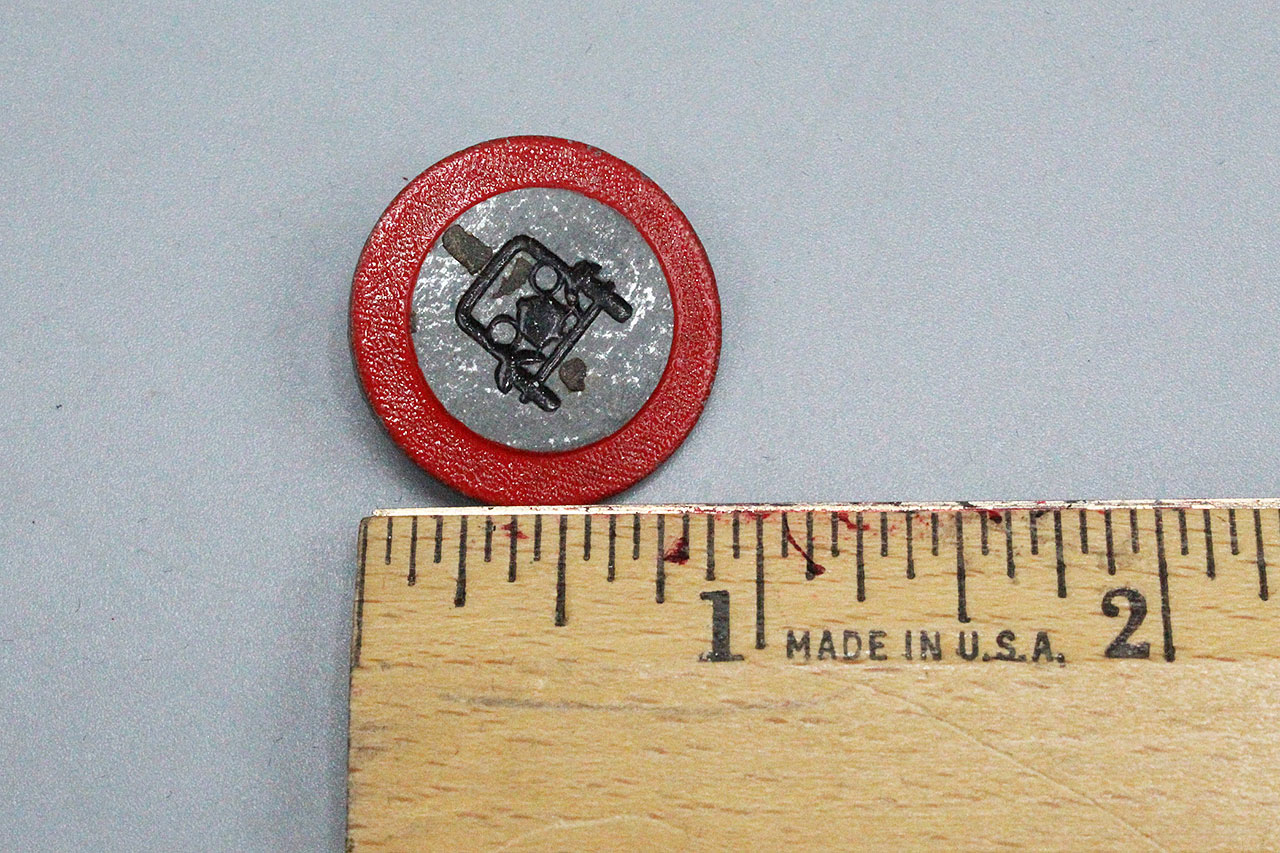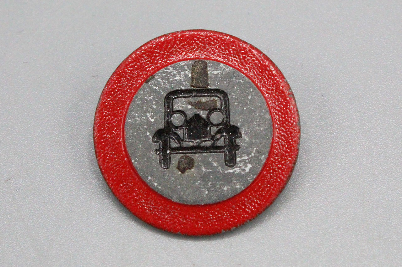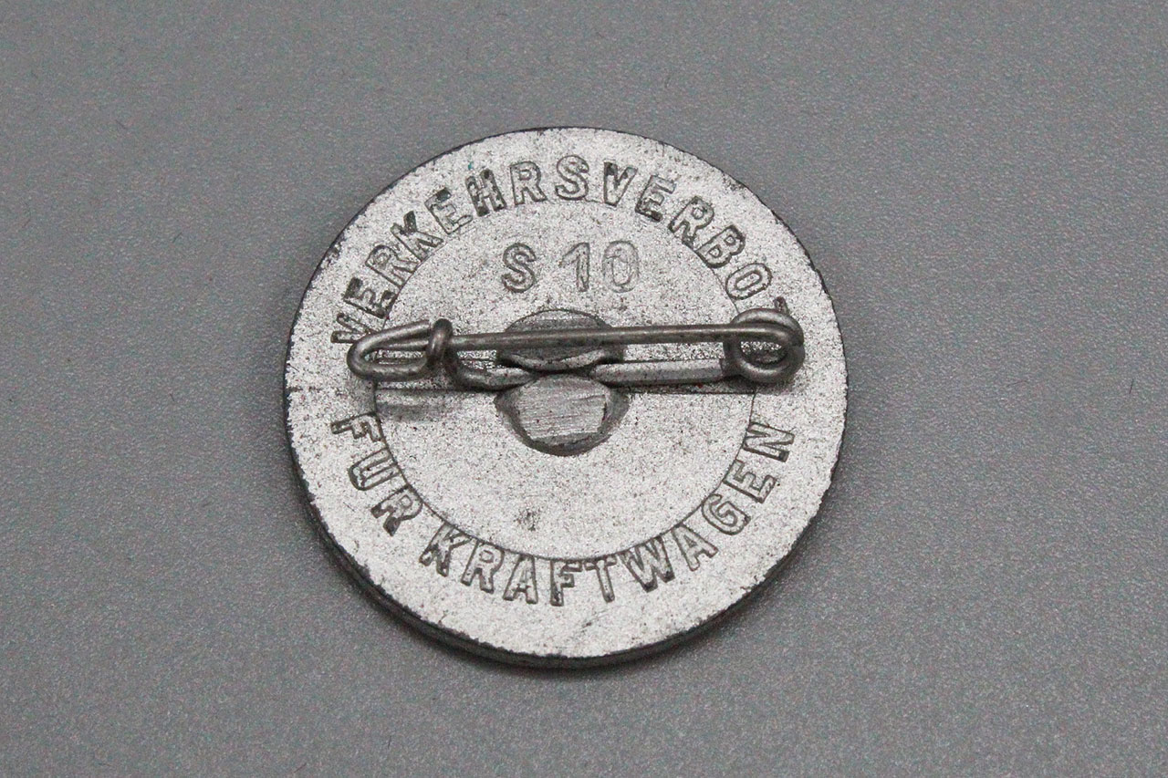 WW2 German Traffic Series Tinnie. Car on front of tinnie and marked on back Fur Kraftwagen Verkehrsverbo (Traffic ban for motor vehicles) S10. Safety style pin system on back.