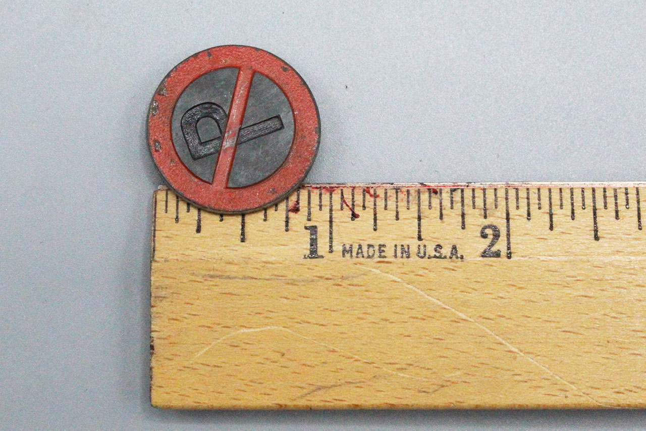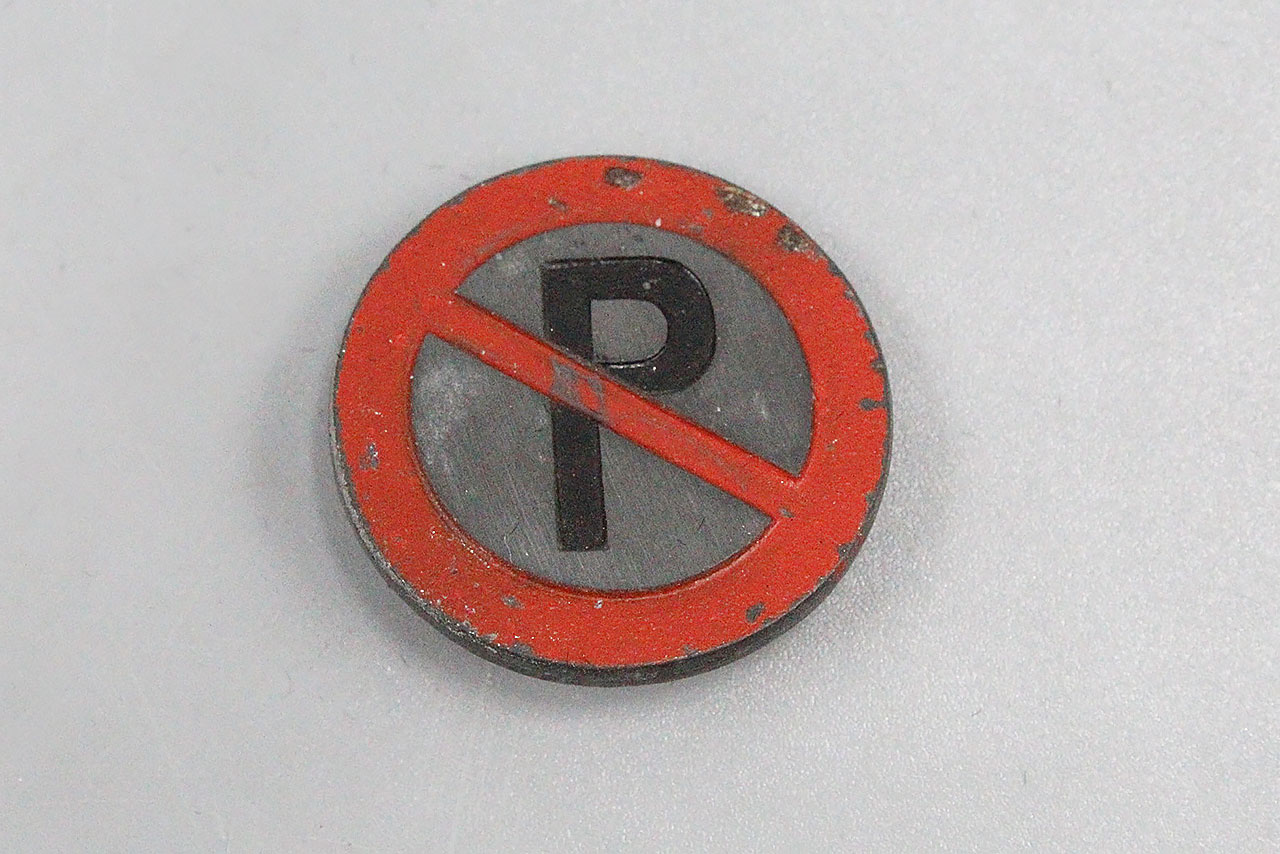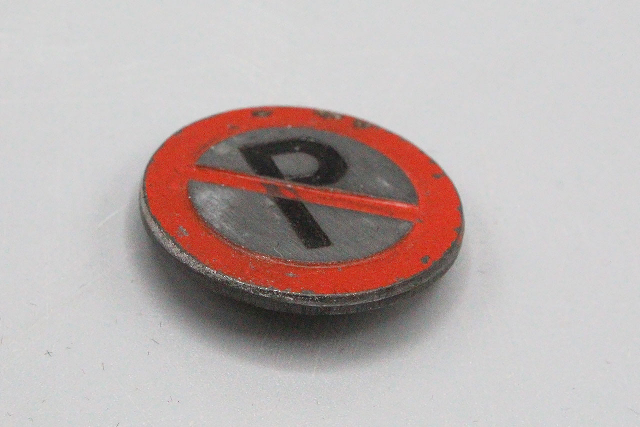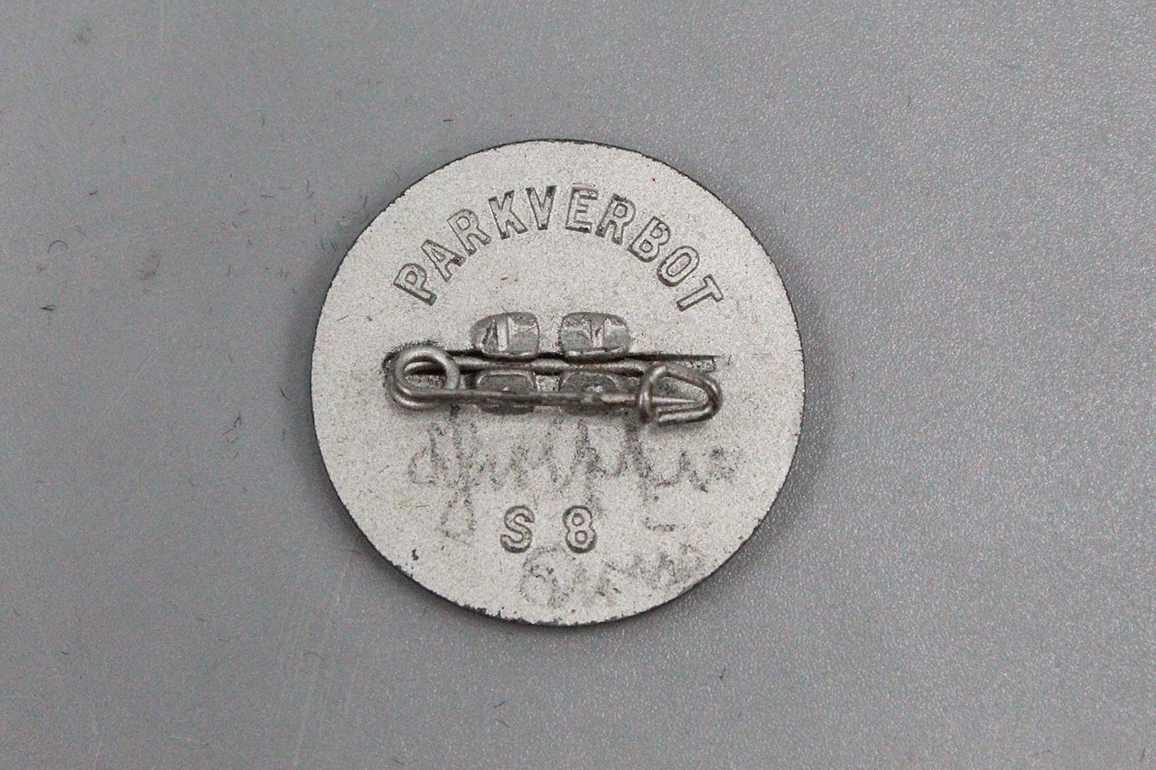 WW2 German Traffic Series Tinnie. No Parking symbol on front of tinnie and marked on back Parkverbot (No Parking) S8. Safety style pin system on back. Also, looks like individual wrote their name on back of pin as well.