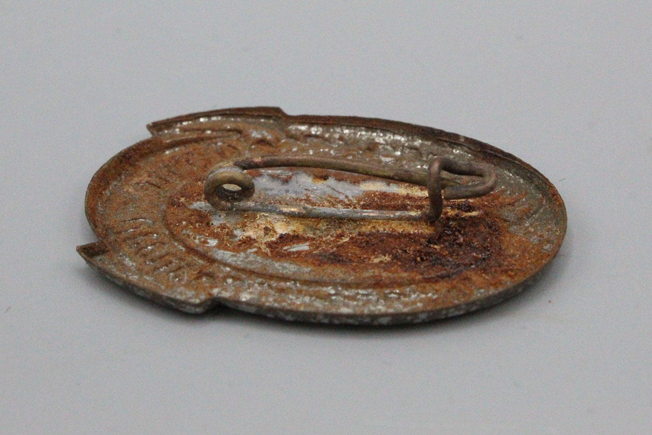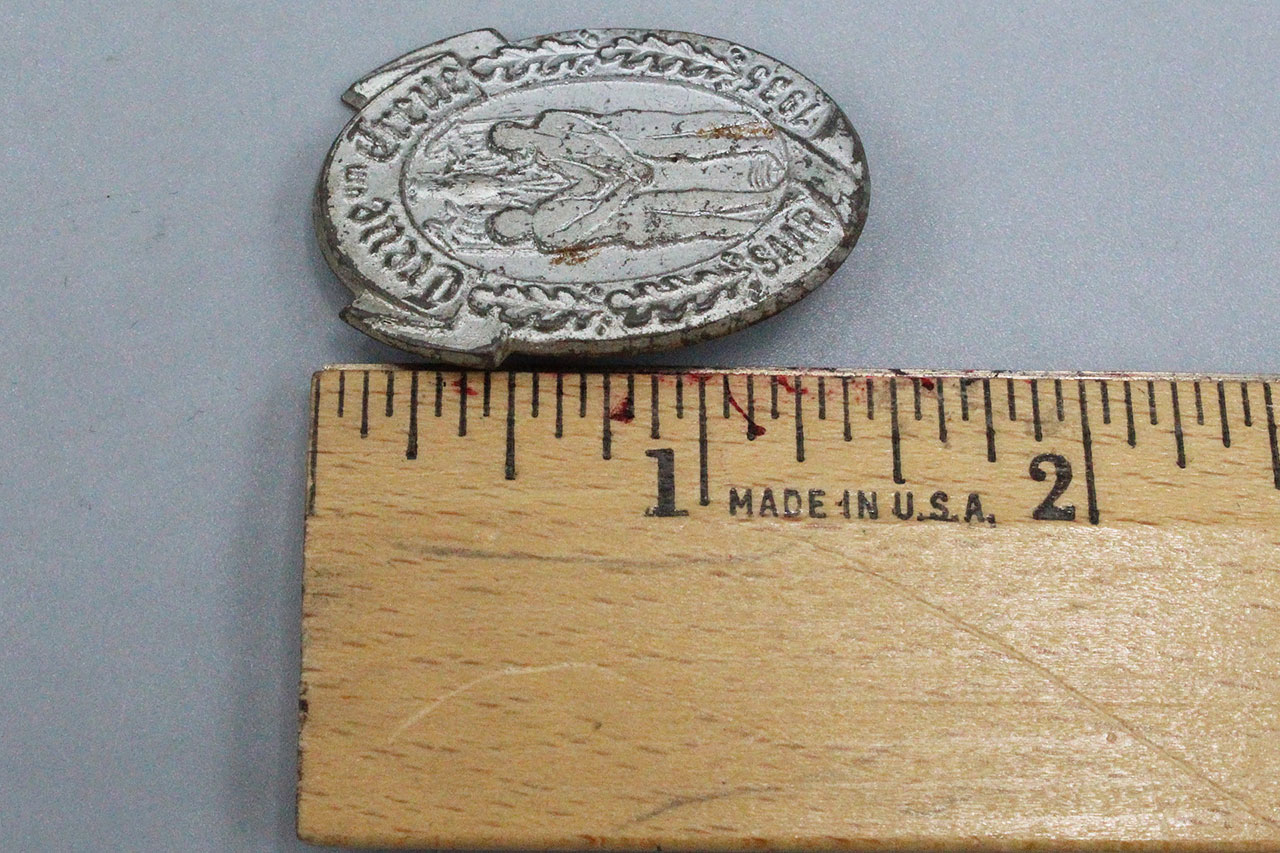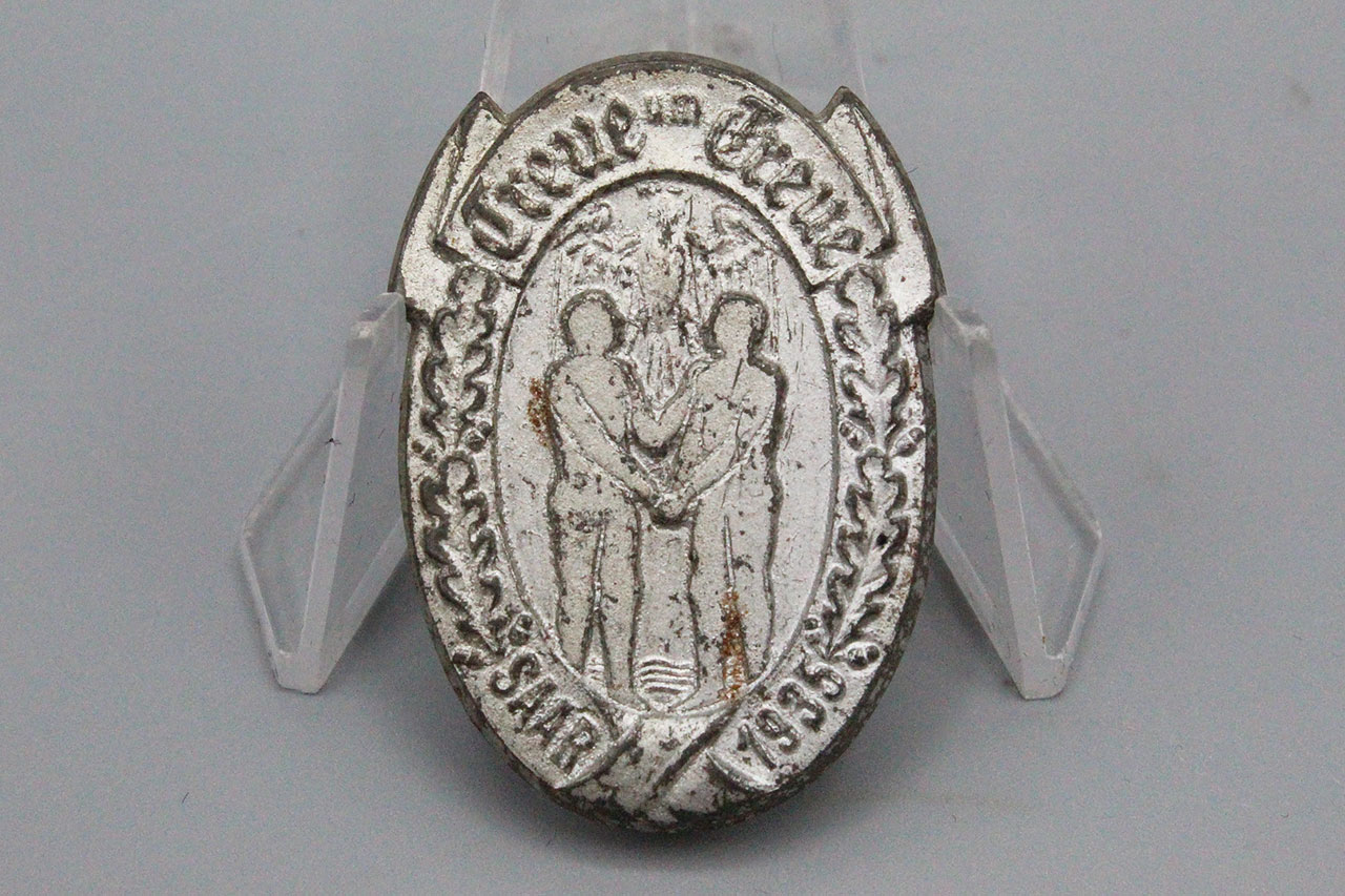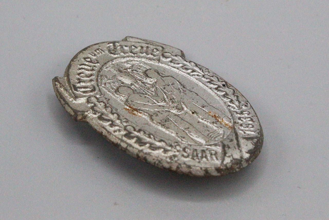 WW2 German Treue um Treue SAAR 1935 tinnie. Die stamped tinnie with safety style pin system. Size approx 1 3/8 inches in height.