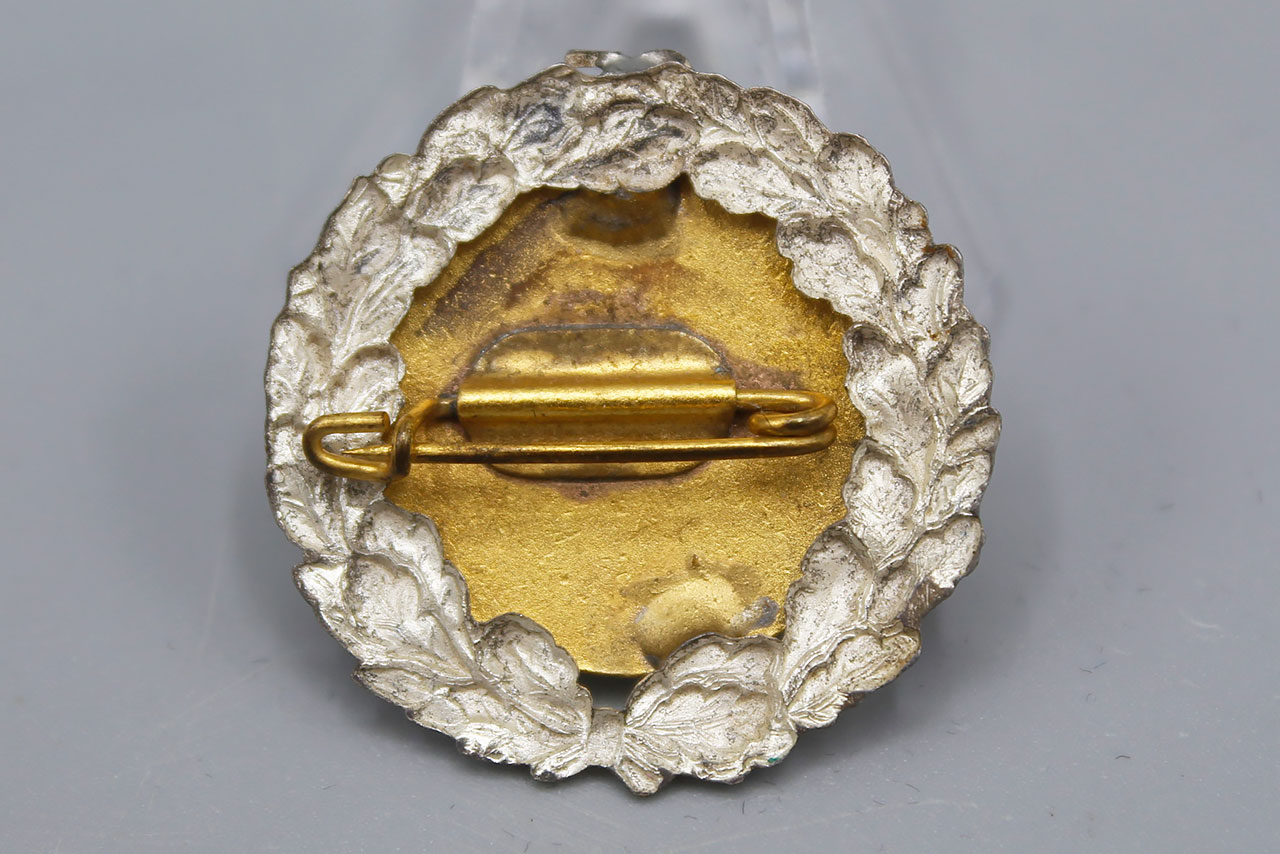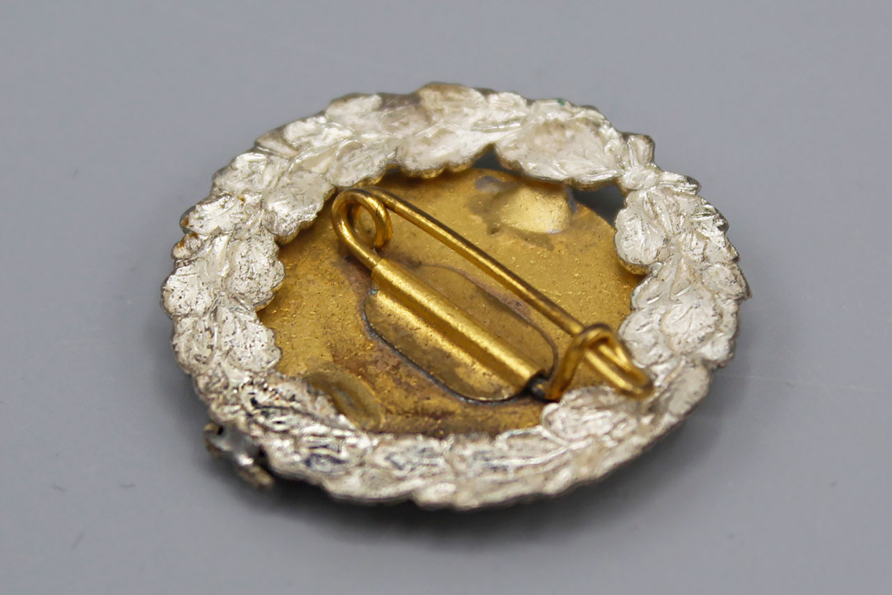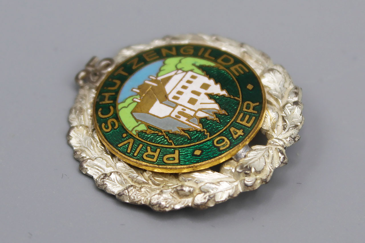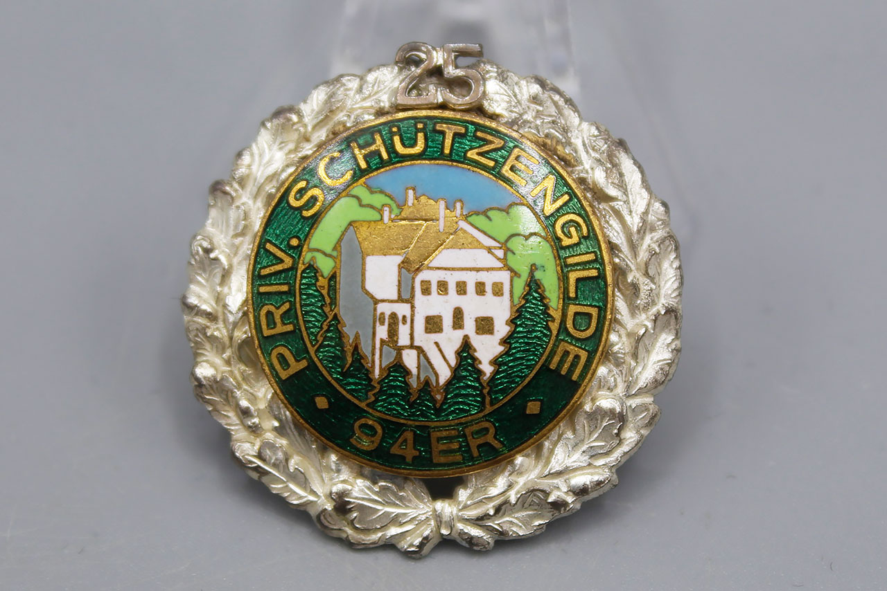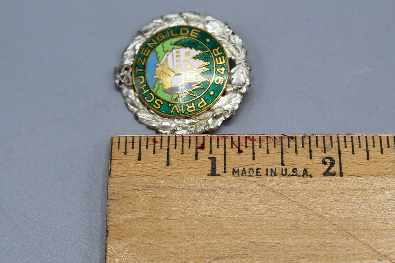 German Enameled Pin with wording 94ER Priv. Schutzengilde and number 25 on top of outer wreath. Height approx 1 1/4 inches. Pin back.