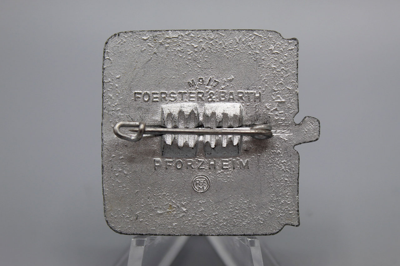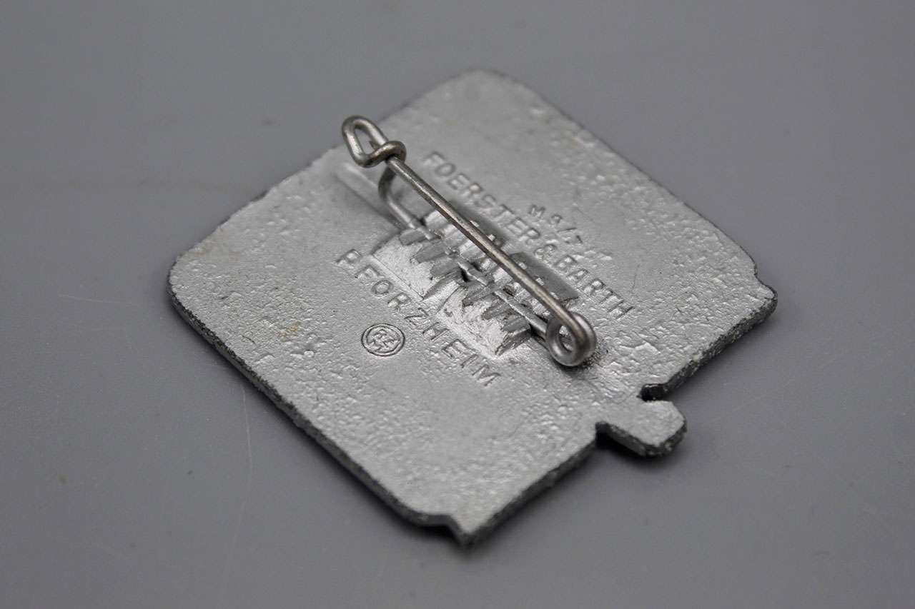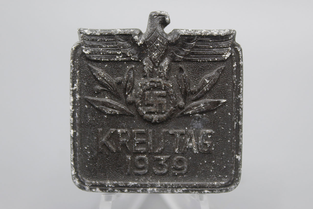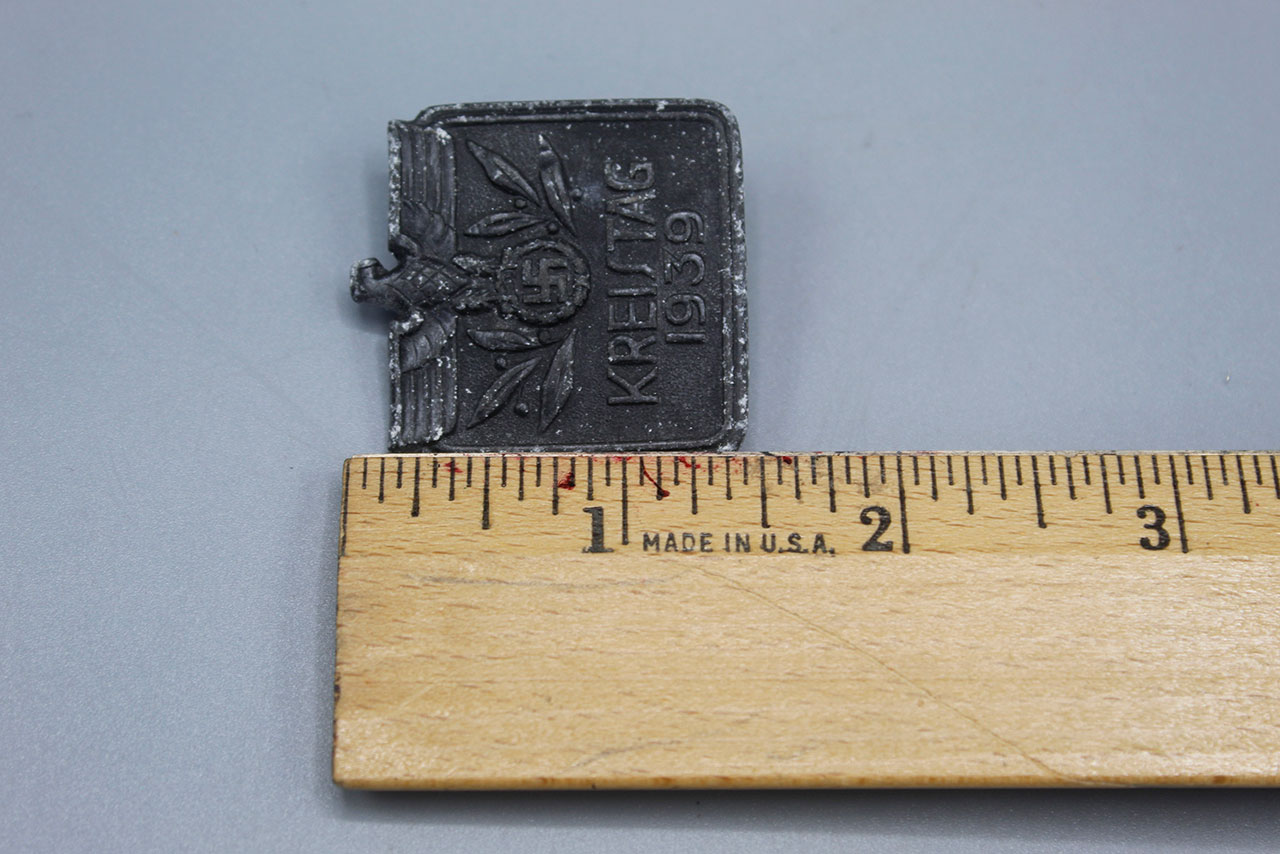 WW2 German Kreistag 1939 Tinnie. Zinc base tinnie with much corrosion. Marker marked on back Forester & Barth Pforzheim on back. Pin back.