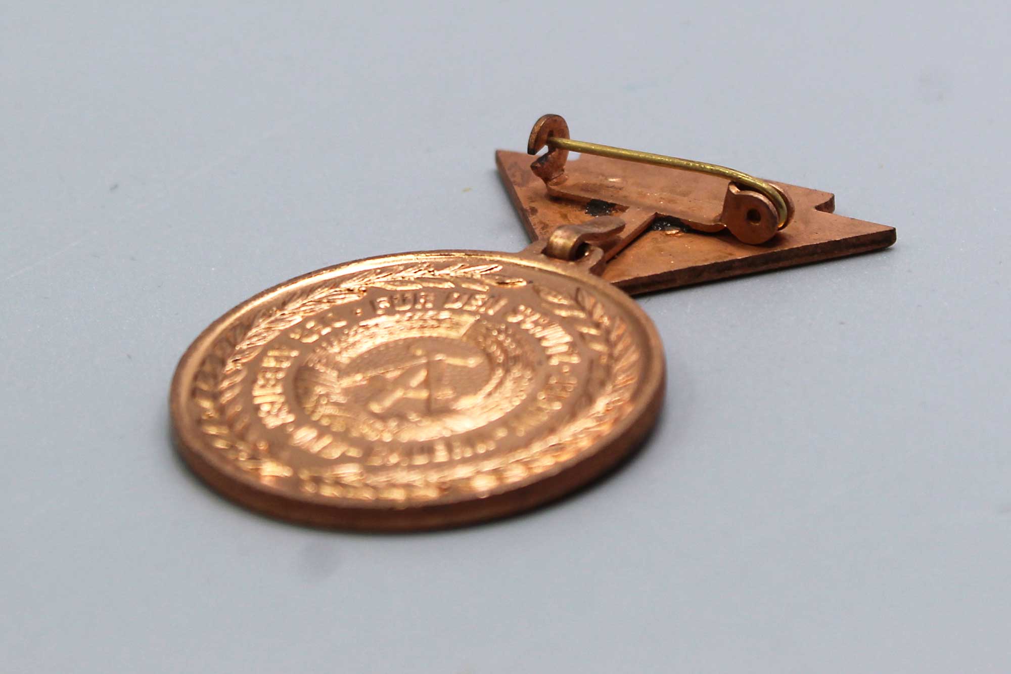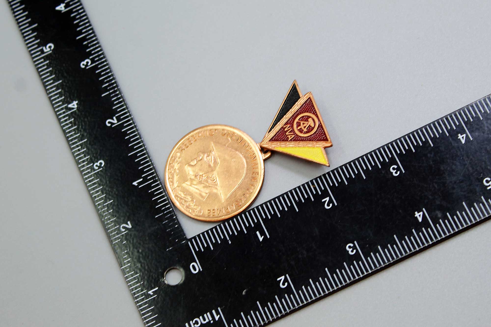 East German Military Badge. Pin back. NVA Reservist Service Badge for 10 years of service. Size approximately 2 3/8 inches x 1 1/2 inches. Worn condition.