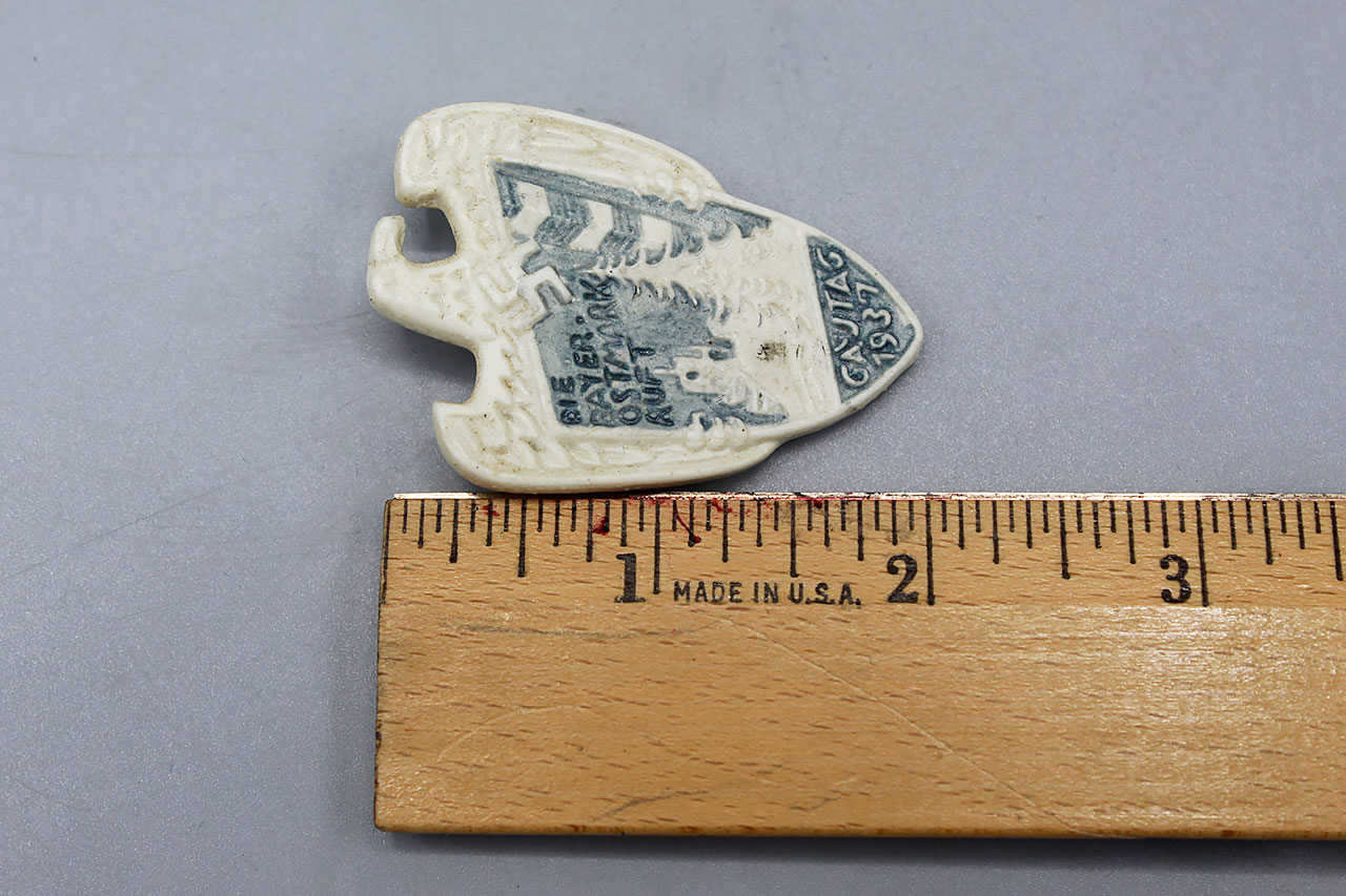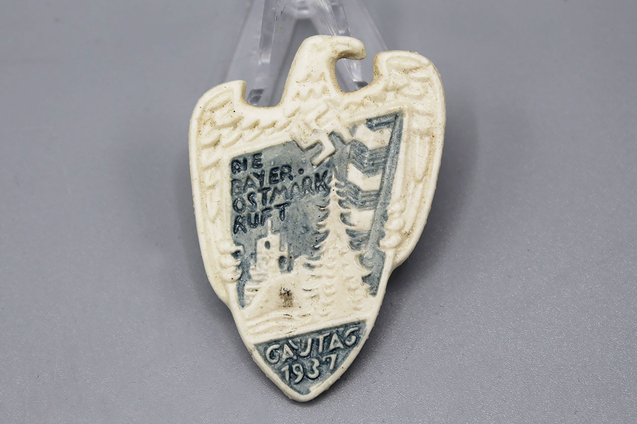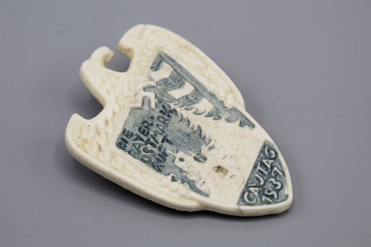 WW2 German Bavarian Gautag 1937 Ceramic Tinnie. Wording on front of tinnie is Bayer. Ostmark Ruft. Gautag 1937. Approximately 2 inches in height.
