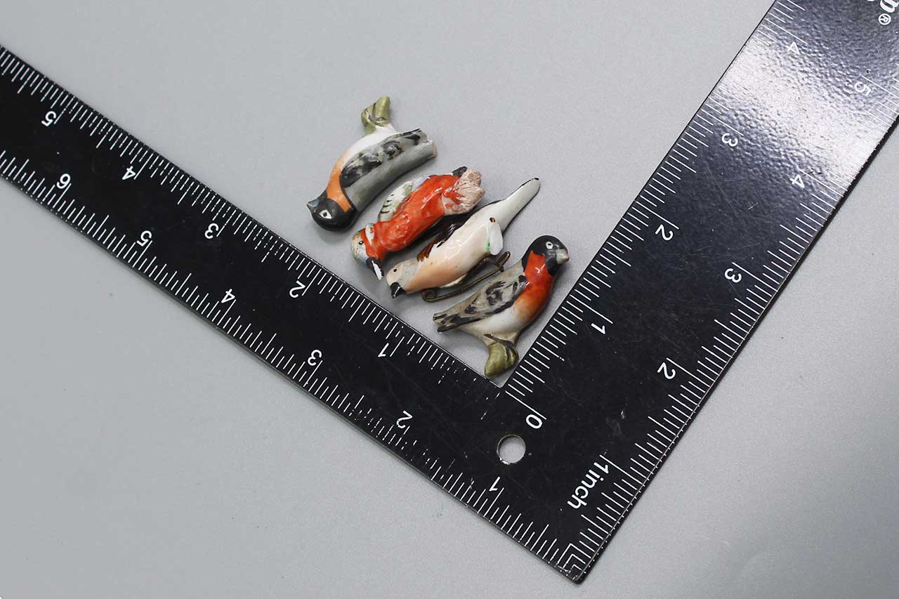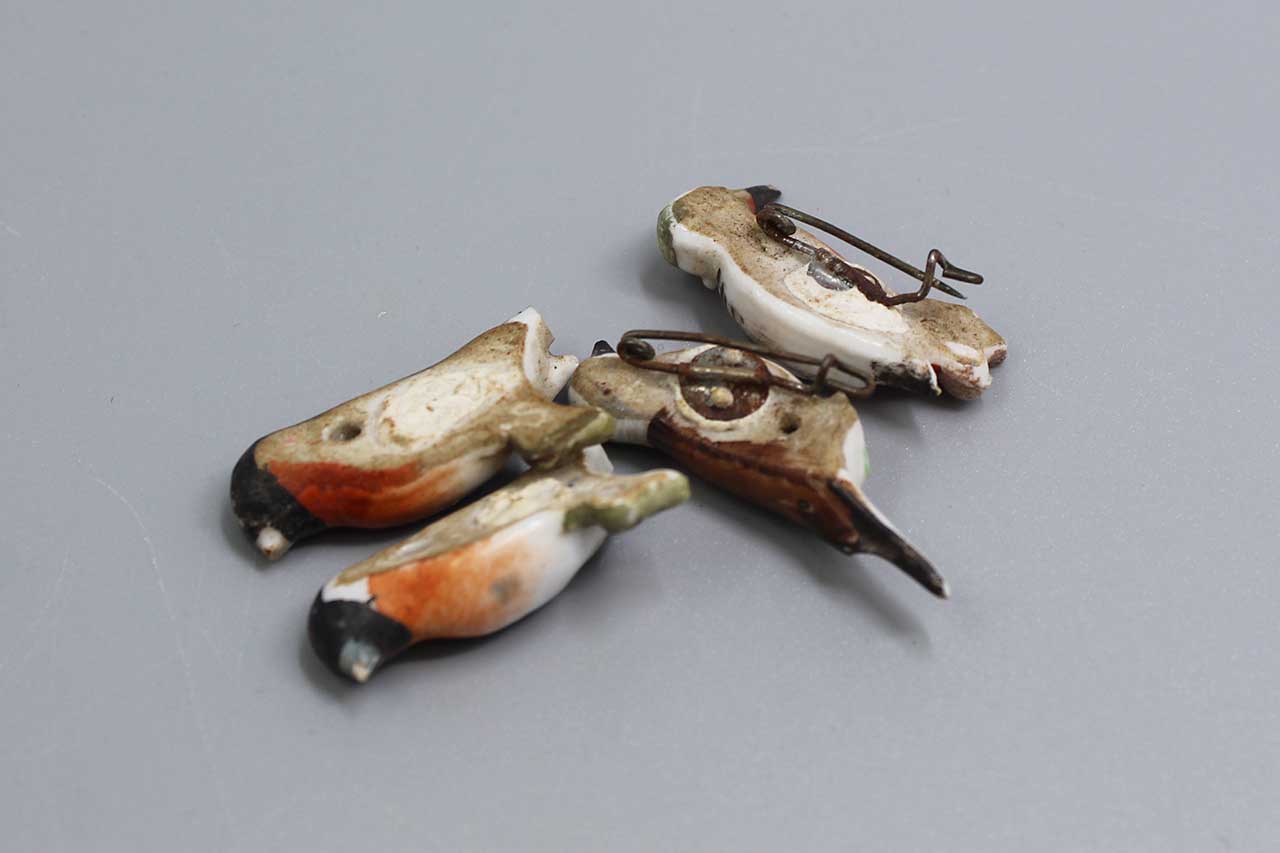 WW2 German Group of 4 Porcelain Bird WHW Tinnies. One of the many WHW (Winterhifswerk) series tinnies. These are pin back type tinnies, two of these tinnies are missing pins. This for the whole group of tinnies pictured. Worn condition.