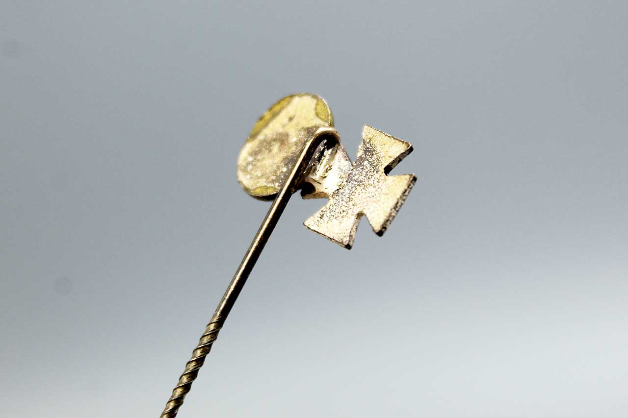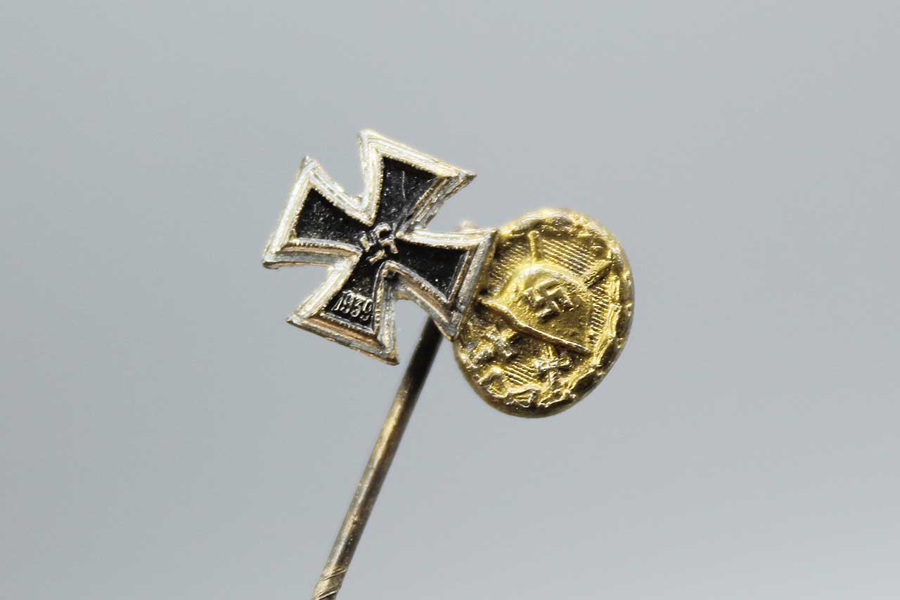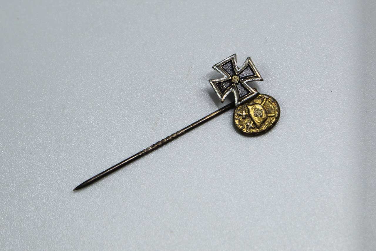 WW2 German stick pin. WW2 German Iron Cross and Wound Badge on stick pin. Worn condition.