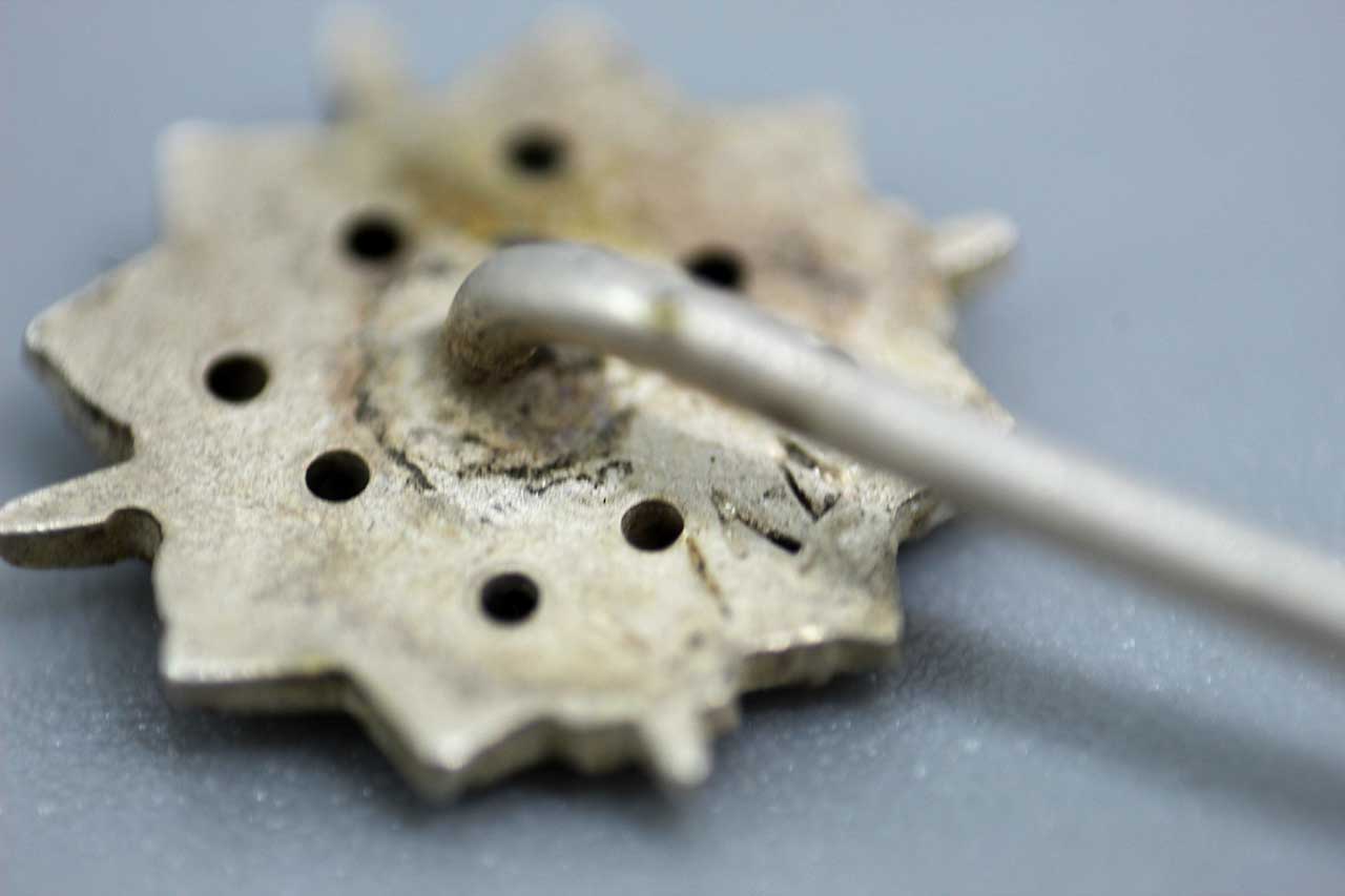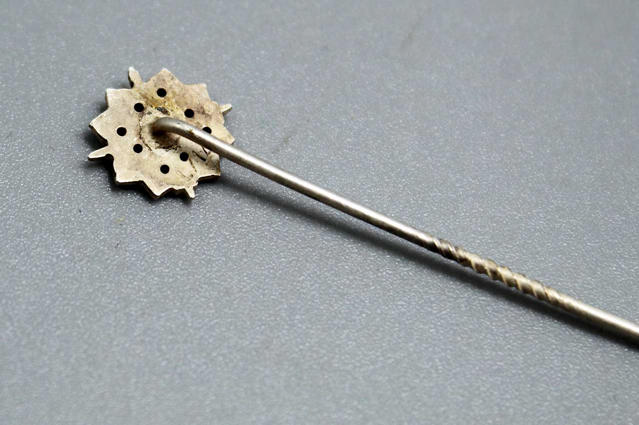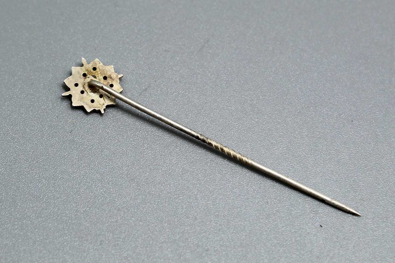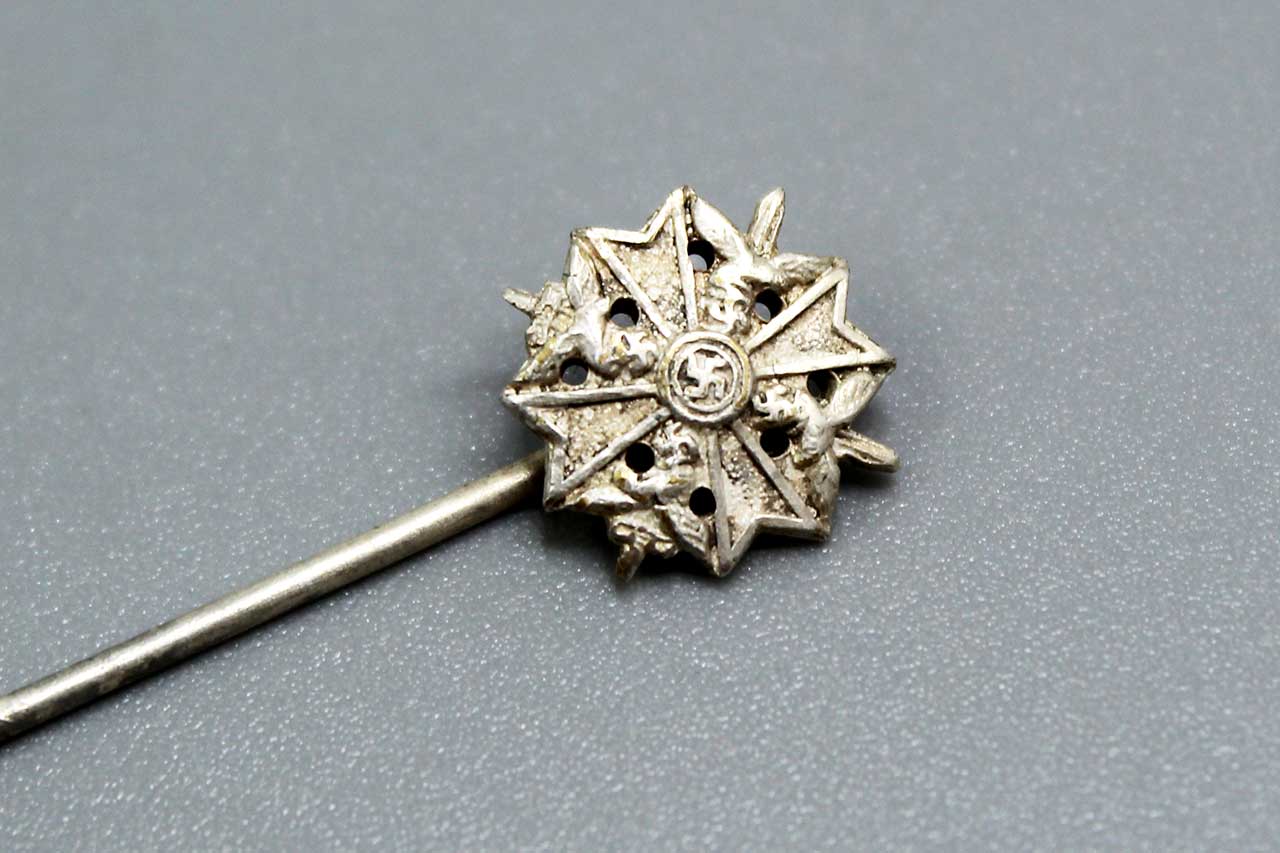 WW2 German Spanish Cross with Swords in Silver Stick Pin. Marker marked L/14 on back for the marker of Friedrich Orth. Worn condition.
