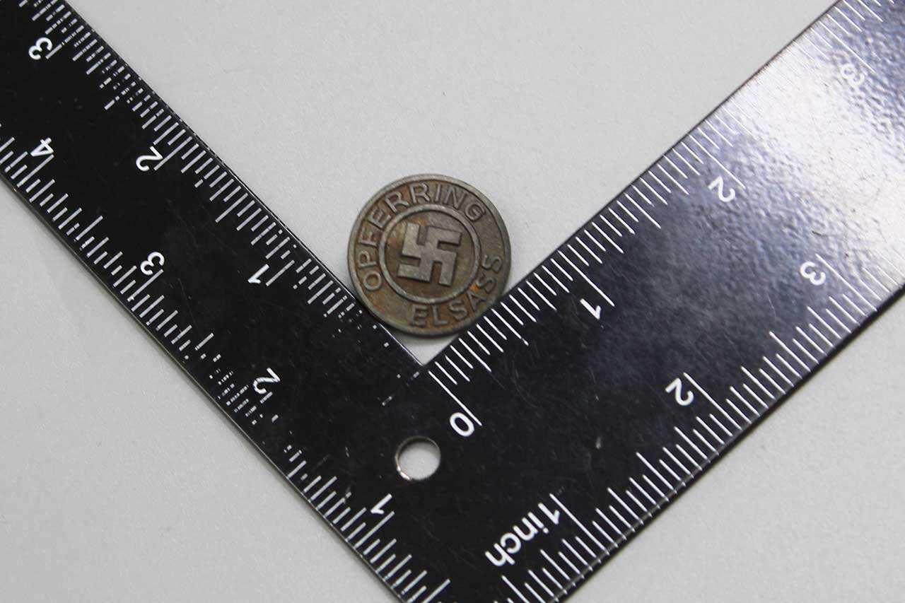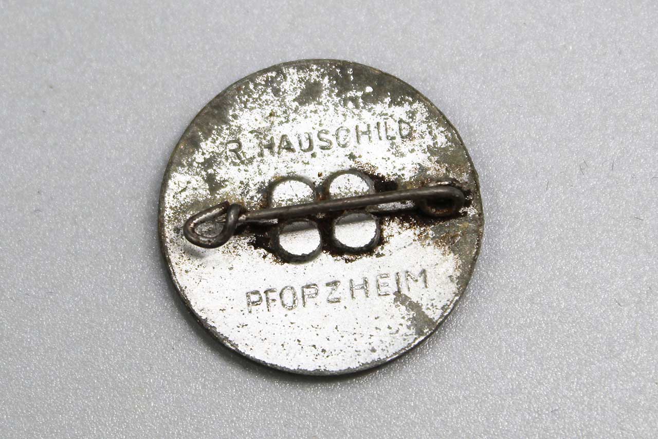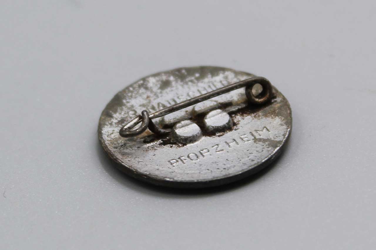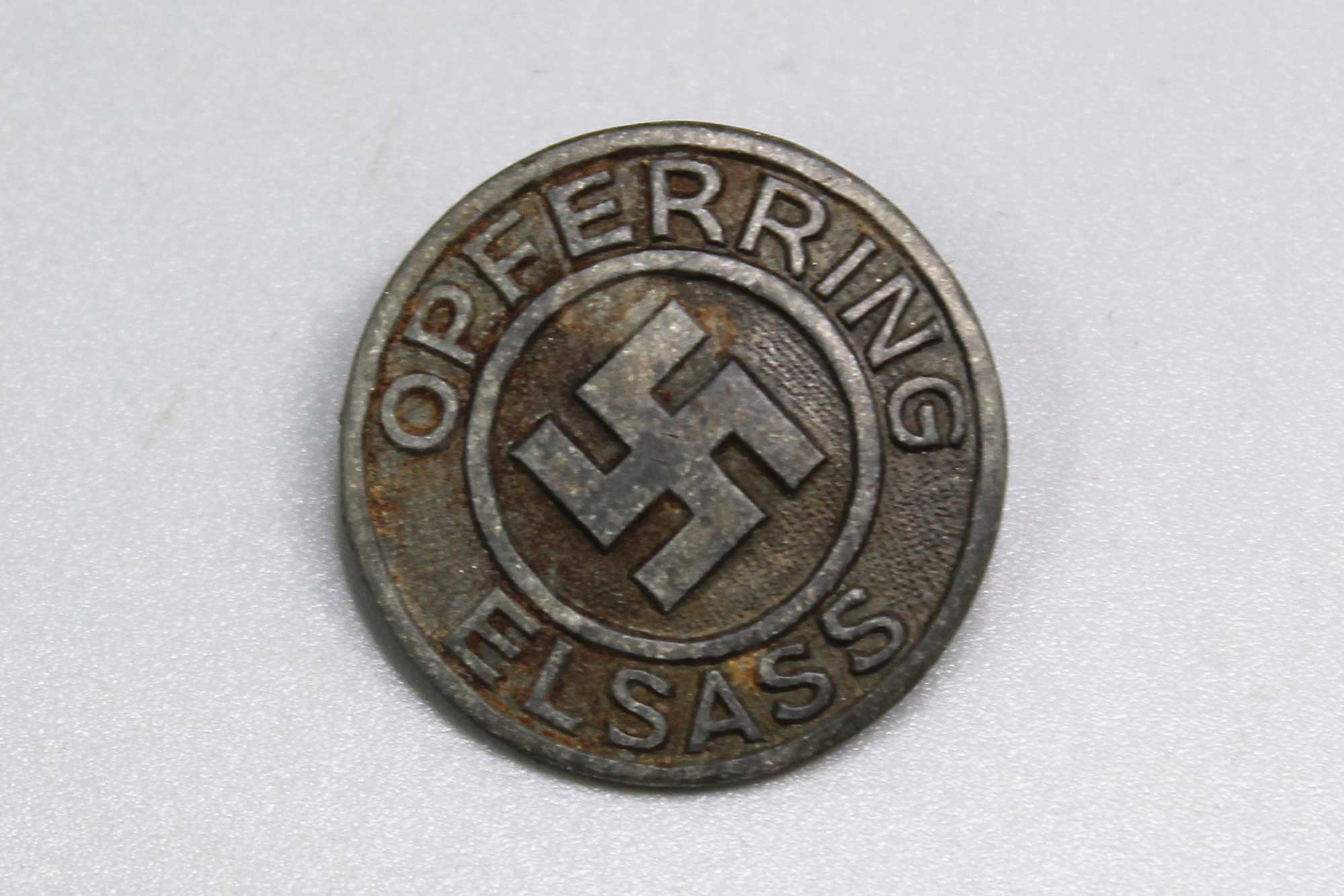 WW2 German Opferring Elsass pin. Die struck zinc based pin. Marker marked on back R.Hauschild Pforzhiem. Crimped in pin on back. Worn condition.