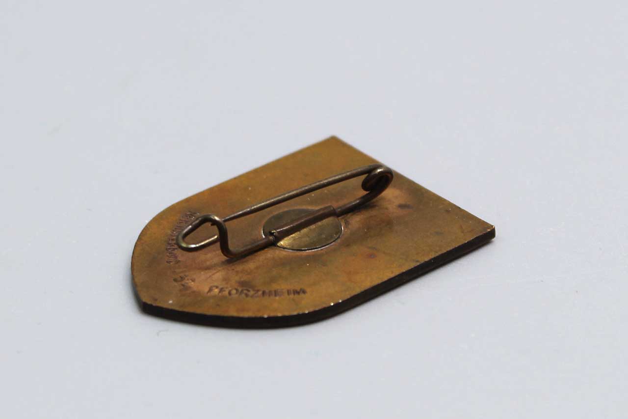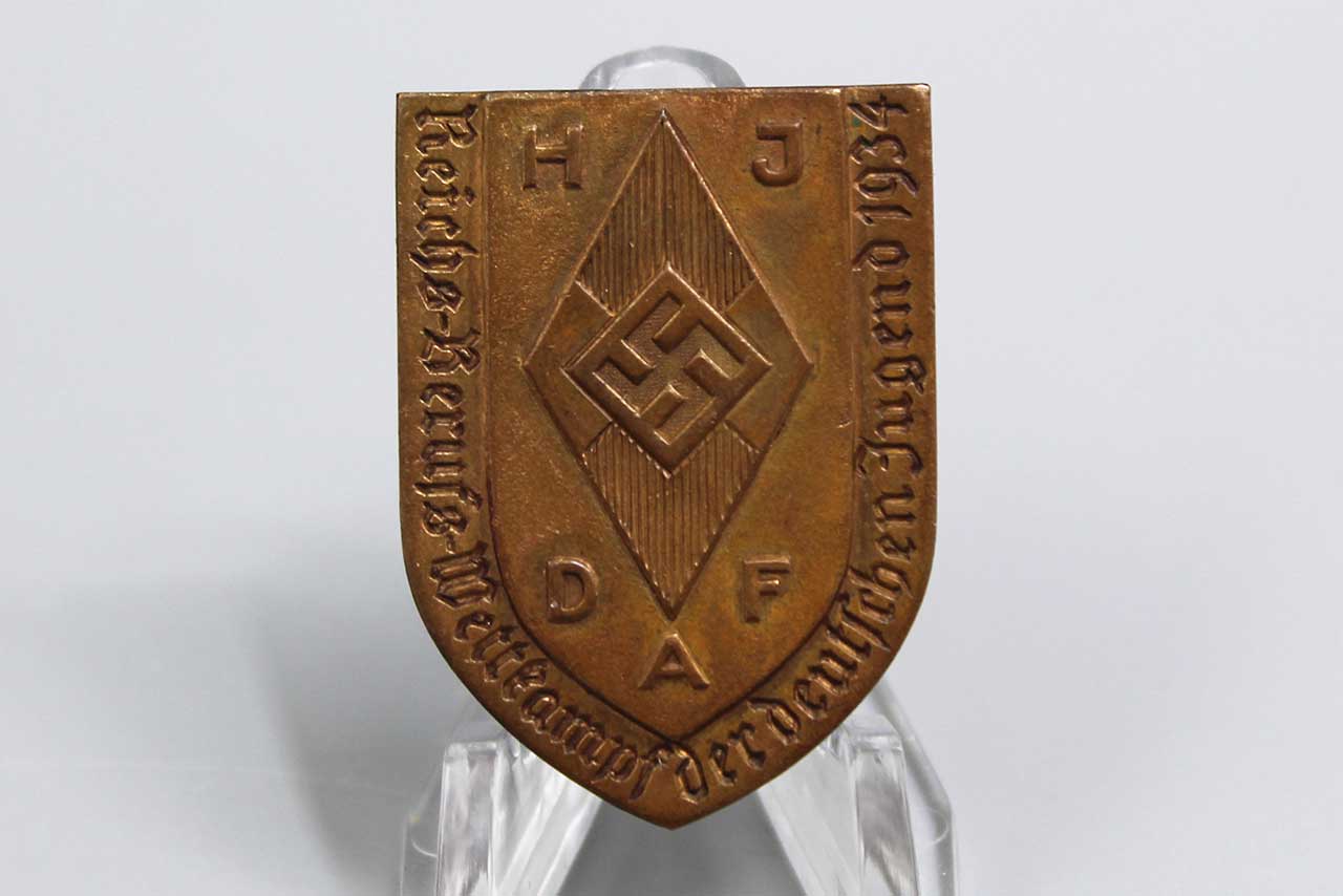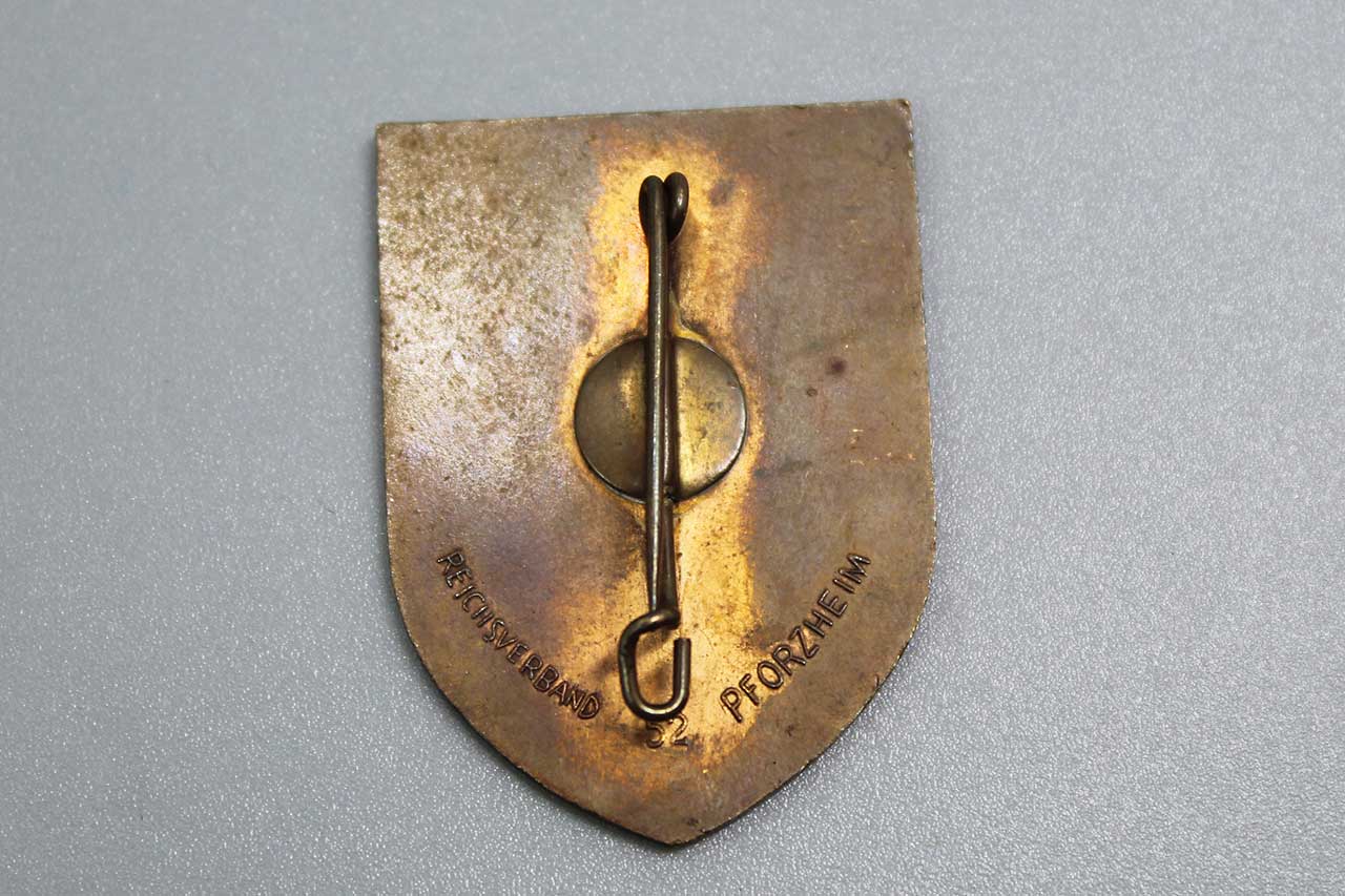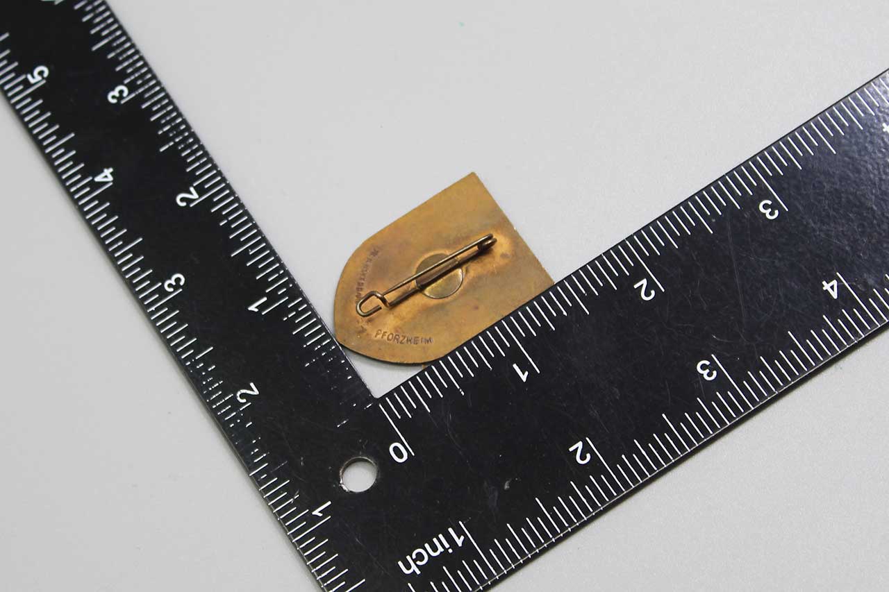WW2 German 1934 HJ DAF Tinnie. Marked on back: Reichsverband 52 Pforzheim. Size approximately 1 3/8 inches x 1 1/8 inches. Worn condition.