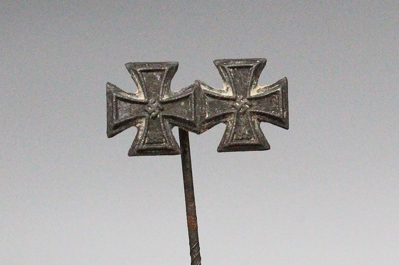 WW2 German Stick pin for the award of the Iron Cross for Bravery 1st and 2nd class. This stick pin has corrosion with all the black center paint worn away on the center of the mini iron crosses.