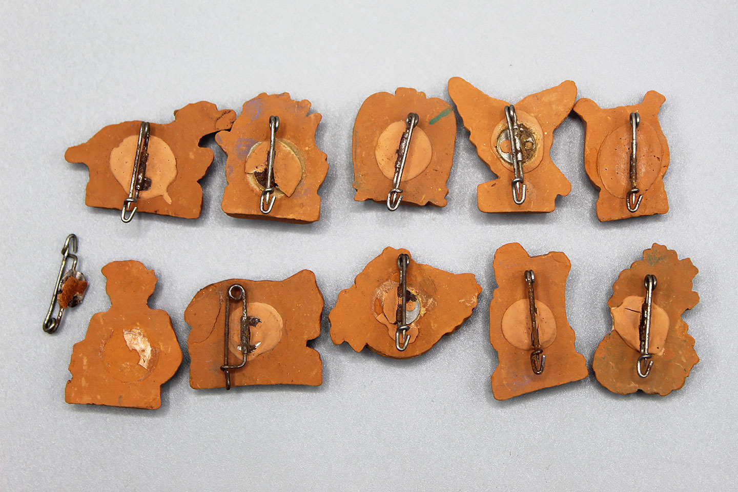 WW2 German Group of WHW (Winterhifswerk) Star Series Donation Tinnies (1944). Appear to be clay based tinnies with safety style pin systems. One of the pins has come loose from one of the tinnies. These WHW tinnies had several different themes and materials. This one done in clay material is different than the typical series and appears to be the full set, I believe there was 10 different tinnies in the Clay Star Series.