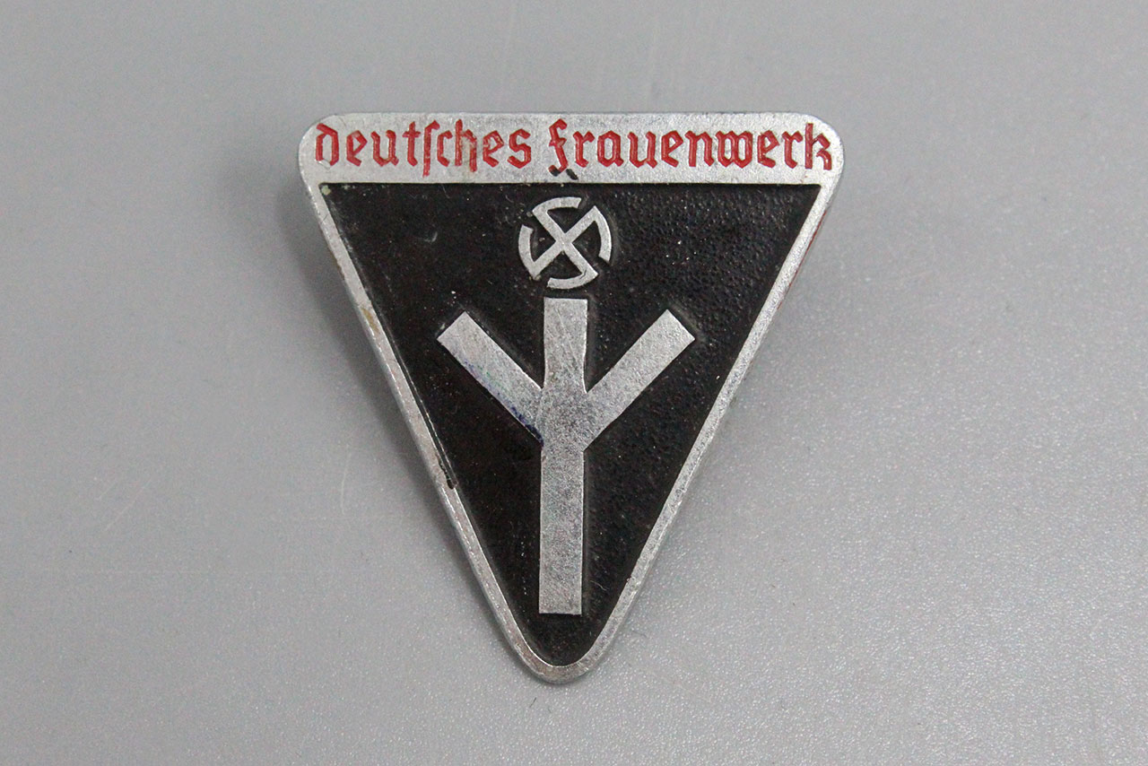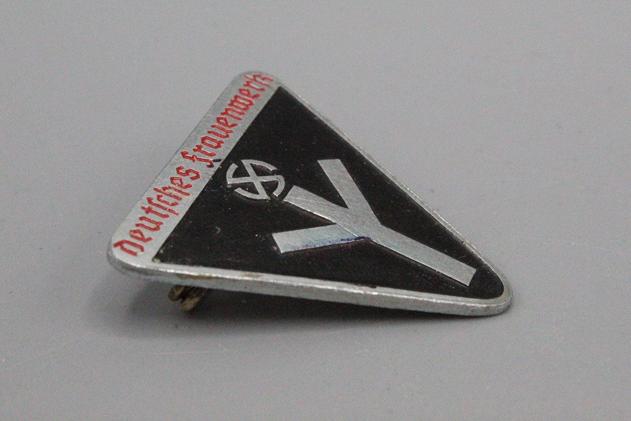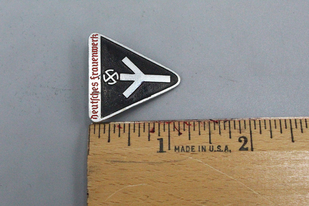 WW2 German Deutsches Frauenwerk pin. Marked RZM M1/63. This is the harder to find painted verison. Size approx 1 1/8 X 1 1/4.