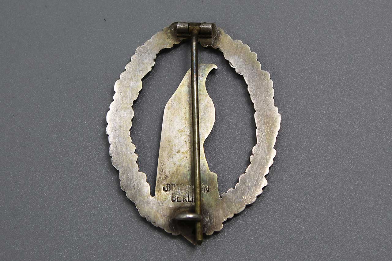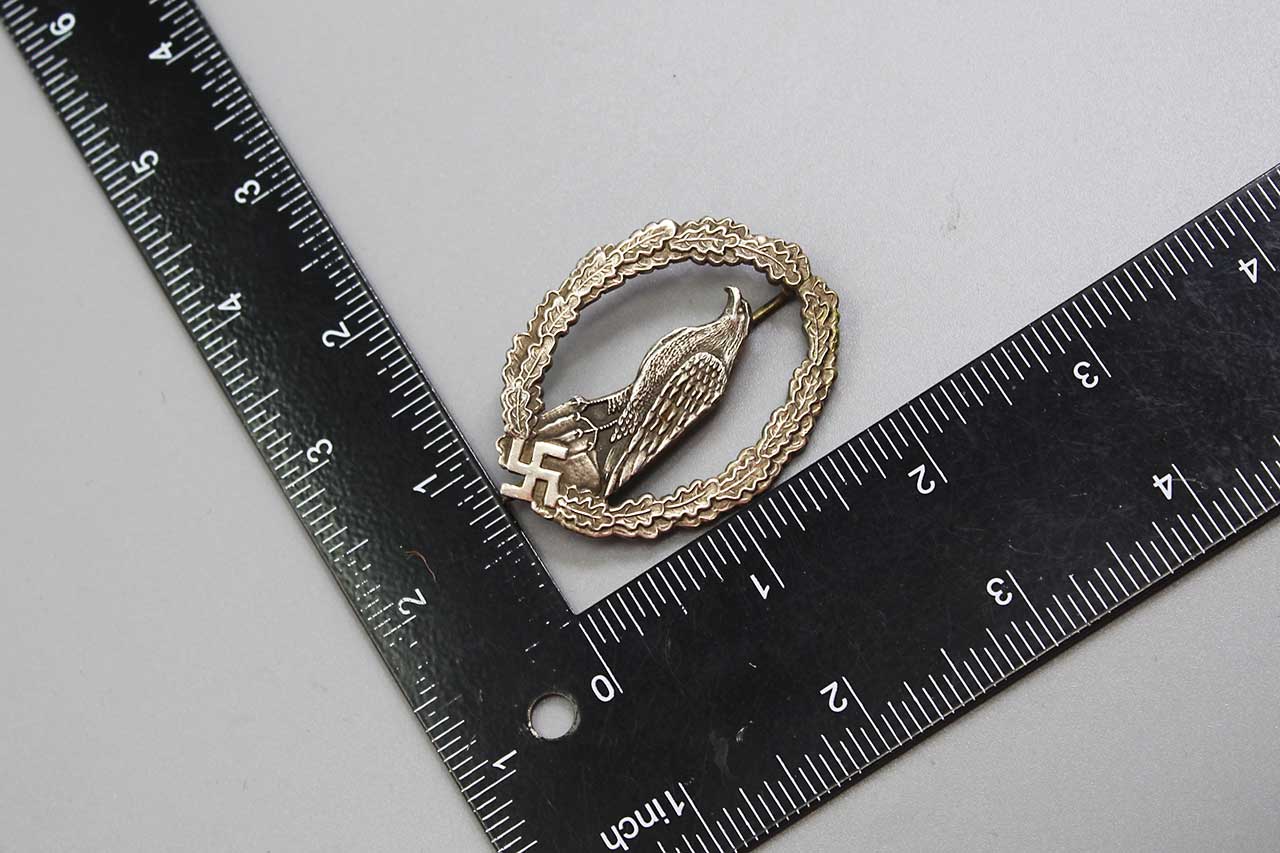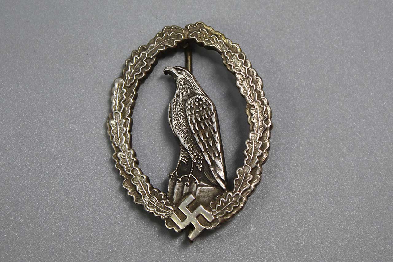 Additional Notes: The WW2 German Luftwaffe Retired Pilot Badge (Luftwaffe Flyer’s Commemorative Badge) was awarded to personnel honorably discharged from their flying duties in the Luftwaffe. Instituted in March of 1936, by the Minister of Aviation and the Commander in Chief of the Luftwaffe, it was given to pilots, observers, air gunners, and paratroopers. The badge features an eagle perched on top of a large rock, surmounted by a wreath of oak leaves. The eagle typically has an oxidized look, while the wreath is usually polished silver. It is estimated that only a small number of these badges were created, and they were awarded only before the outbreak of the war. Typically, these were marker marked C.E. Juncker Berlin.