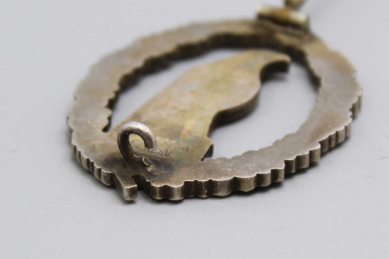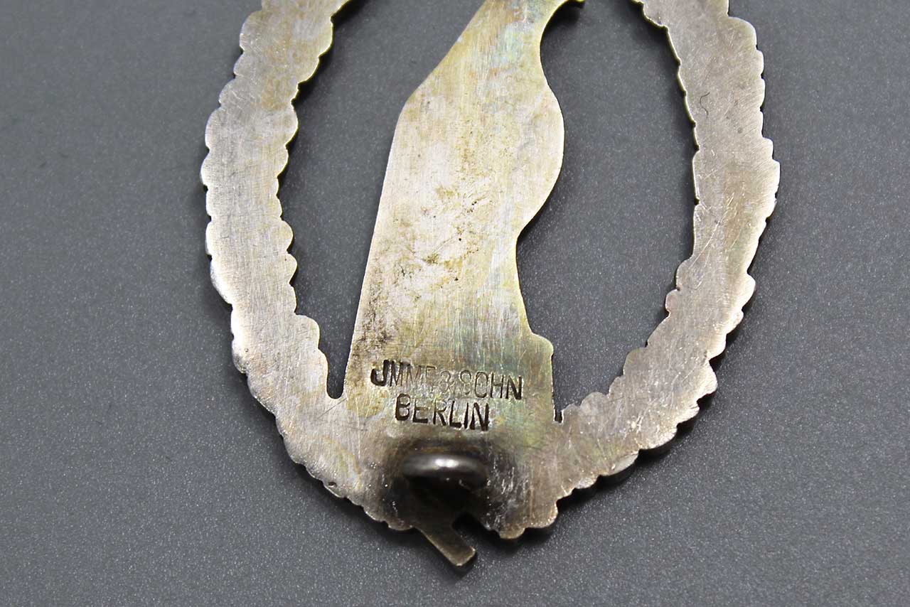 Reproduction WW2 German Luftwaffe Retired Pilot badge. This is a reproduction badge. Marked on back: JMME&SOHN BERLIN (not a known maker of Luftwaffe Retired Pilot Badges). Plus, details are very flat. The original badges are pretty much impossible to find and very expensive when they show up in the market. This may make a good place holder representation piece. Worn condition. Reproduction badge.