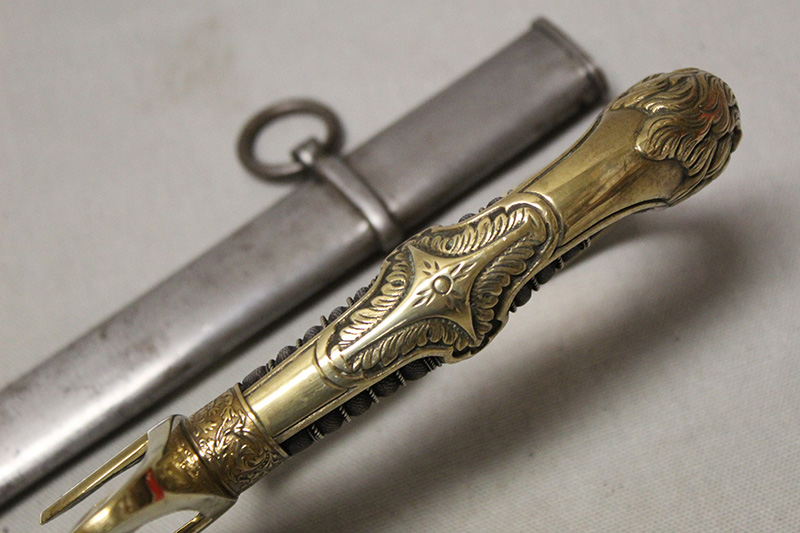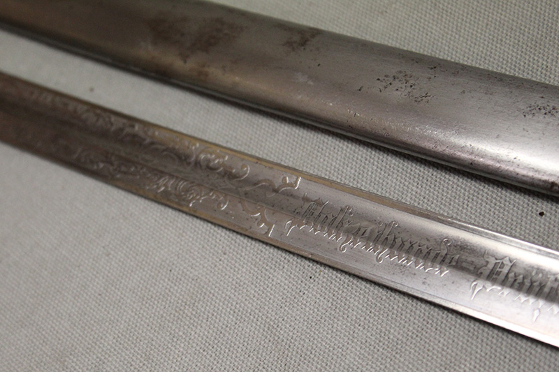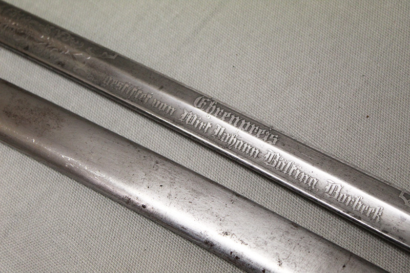 Imperial German lion head presentation Honor Prize Sword for Police Dog Championship. Factory double-engraved sword with the events name engraved on blade. The engraved Police Honor Prize sword was awarded for 1st Place in Police Dog Championship 1908. The other side is engraved Honor Prize and name of the city. Worn condition.