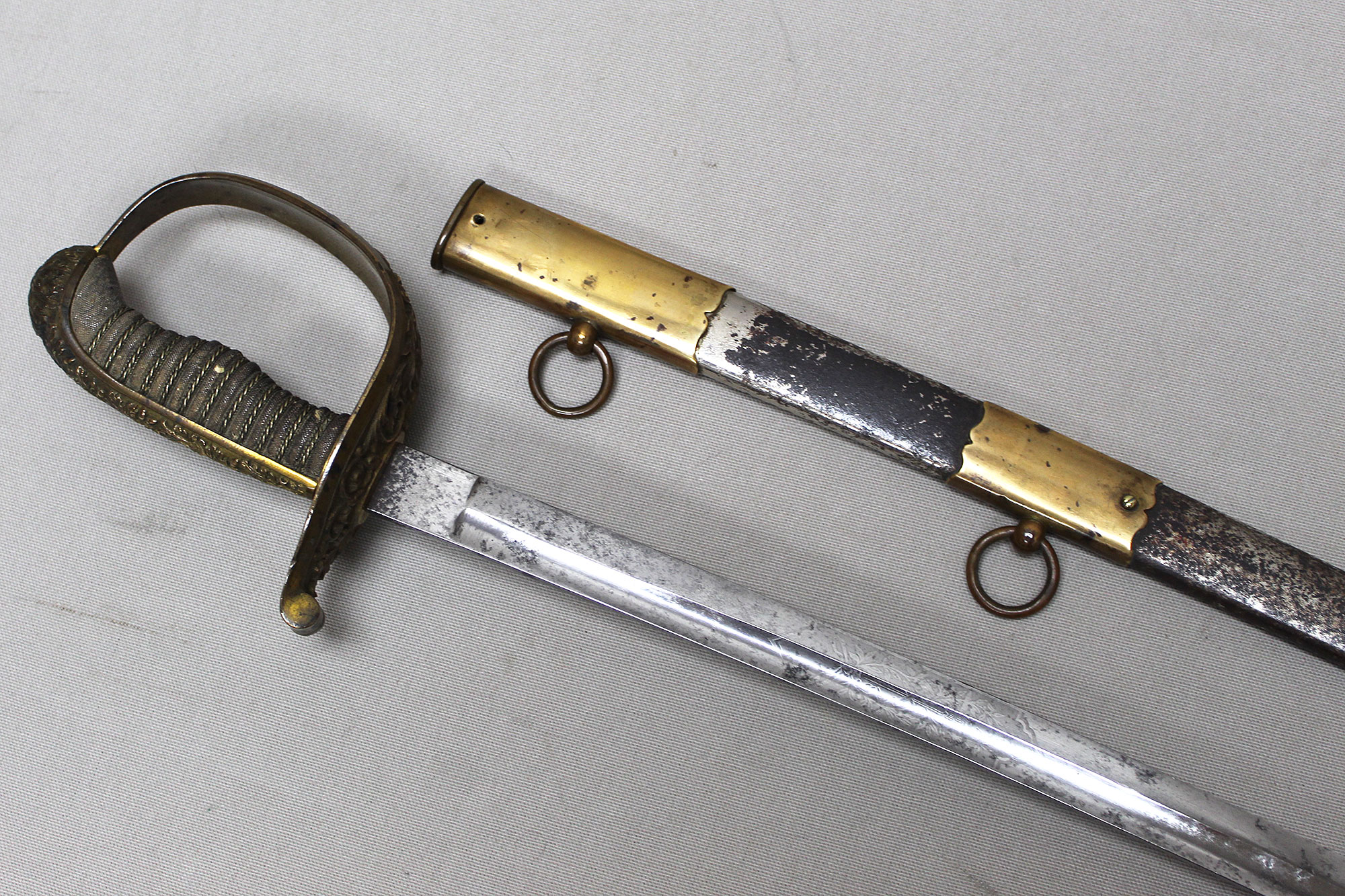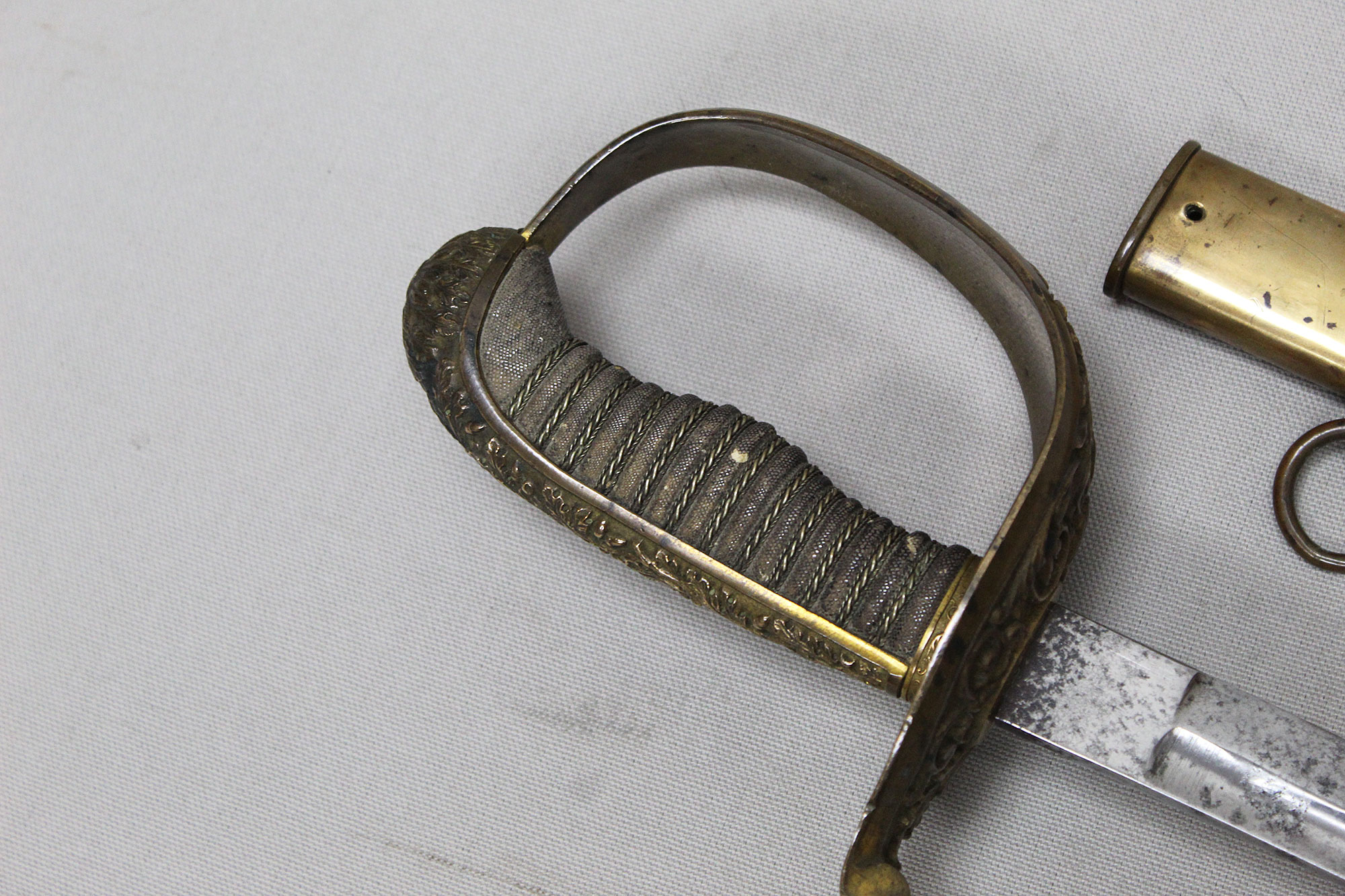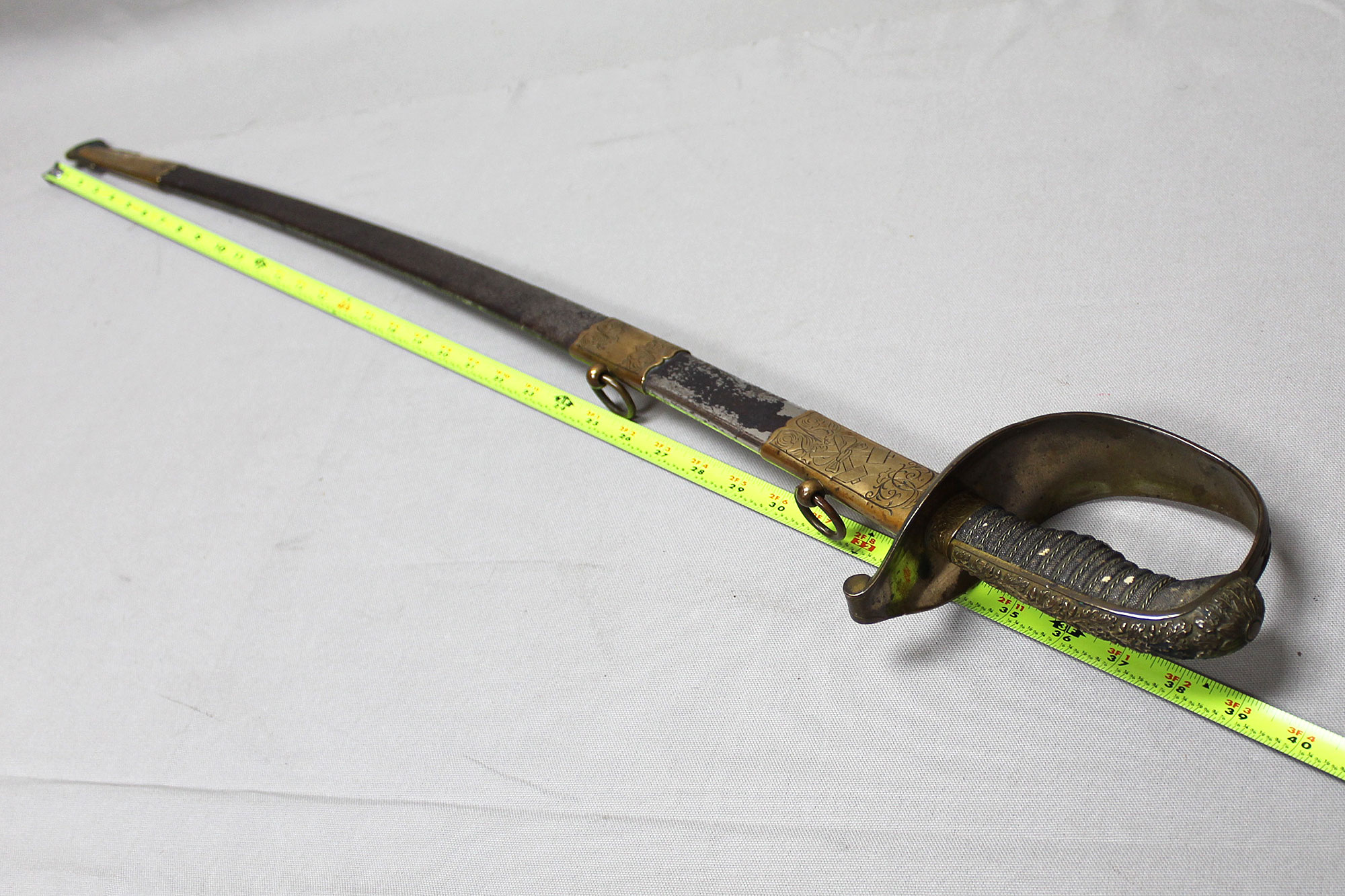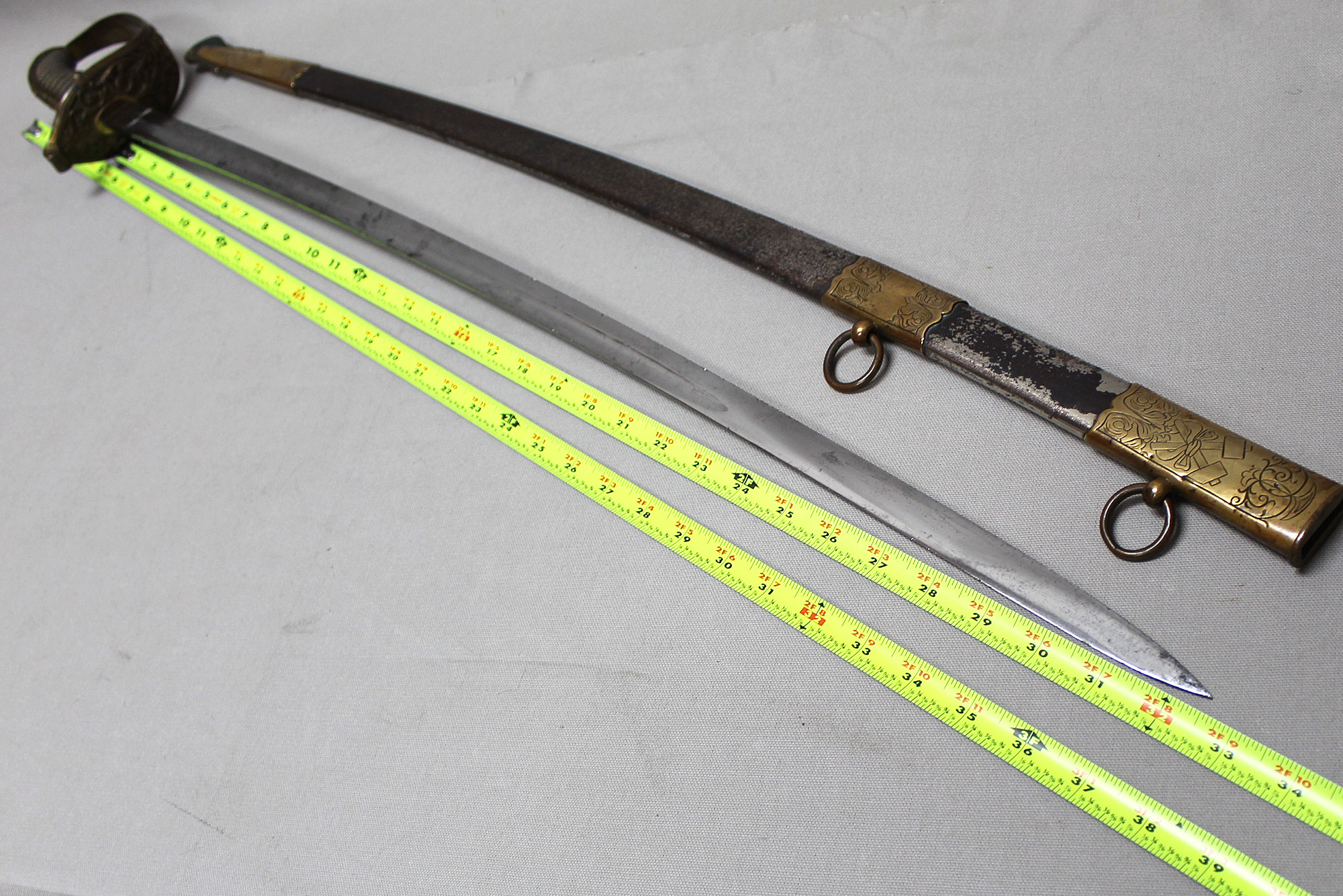 German Deluxe Miner’s Sword. Most likely Weimer era (1919-1933). Scabbard missing upper throat brass screw, also, a wear to black paint with good portions of paint missing on metal scabbard. Double ring scabbard. The brass uppers section of the scabbard has a nice miner’s type design. Grip appears to be a shark skin wrapped wood core grip with triple wire wrap. Brass hilt with nice miner logo type design. Blade has graying and is in average condition, blade etching is very light and hard to clearly make out through the graying. The motto on the one side of the blade is “Gluck Auf” (meaning: Good Luck), there is also Miner’s hammers on the sides of motto. Blade length approximately 32 1/2 inches, about 37 3/4 inches overall, and about 39 inches in scabbard. A very hard sword to find.