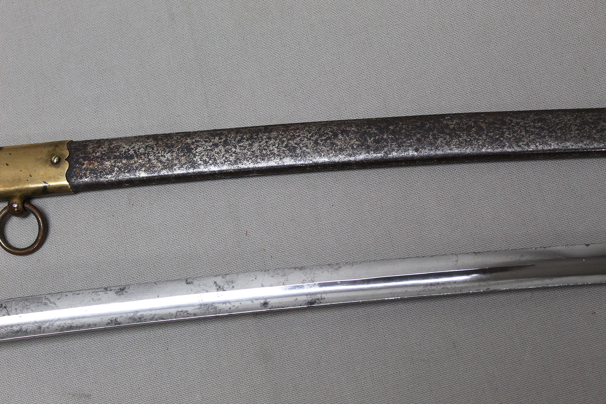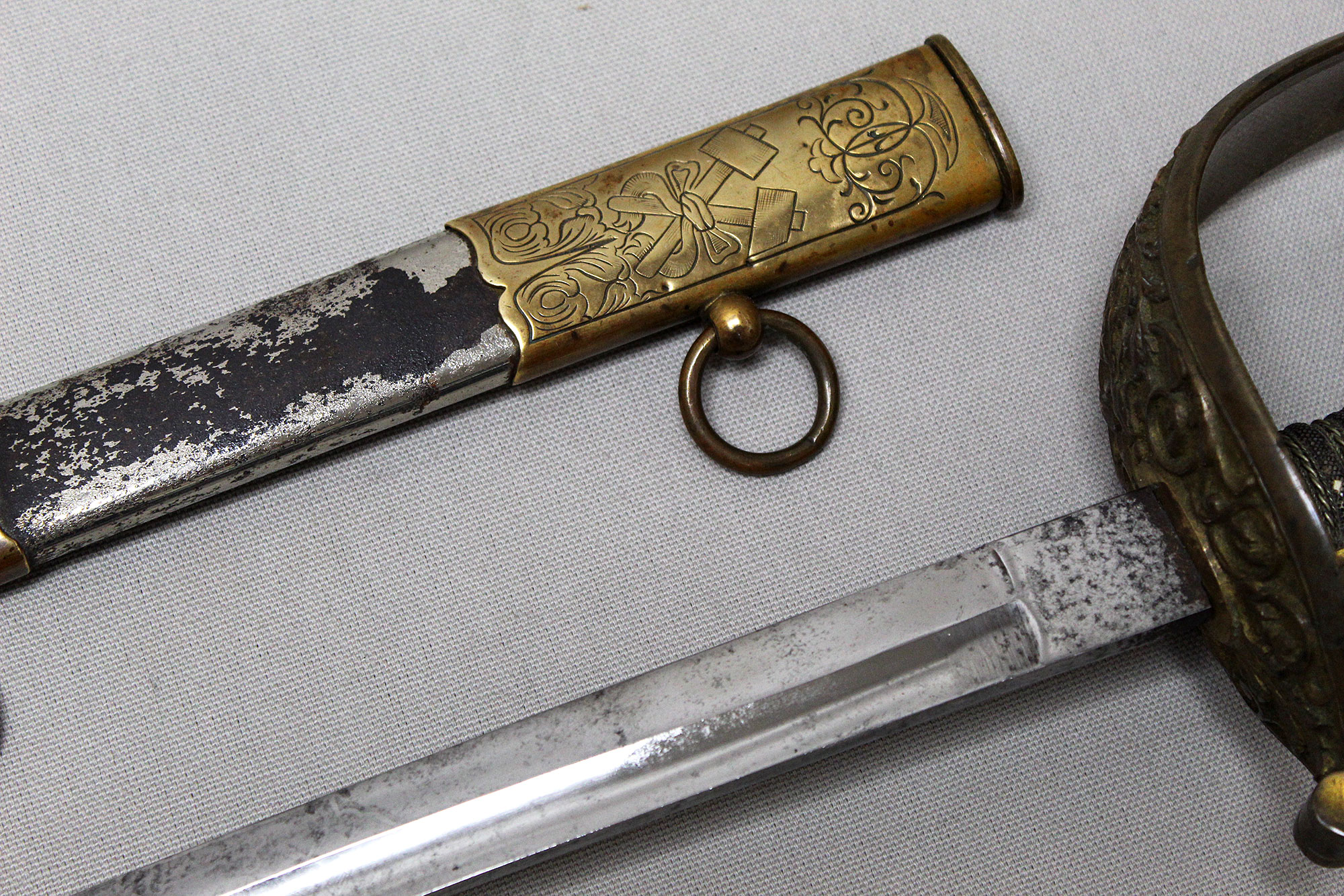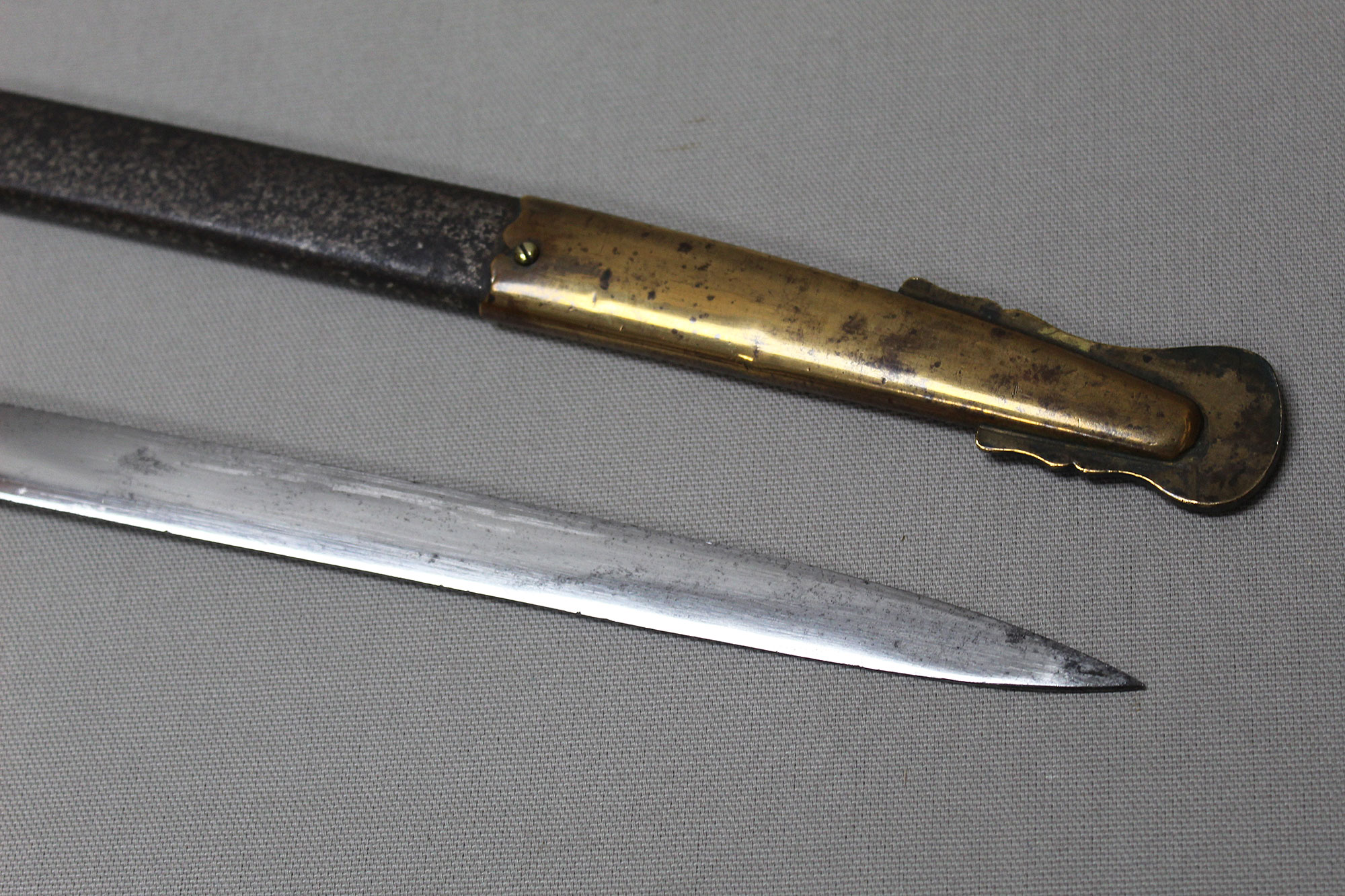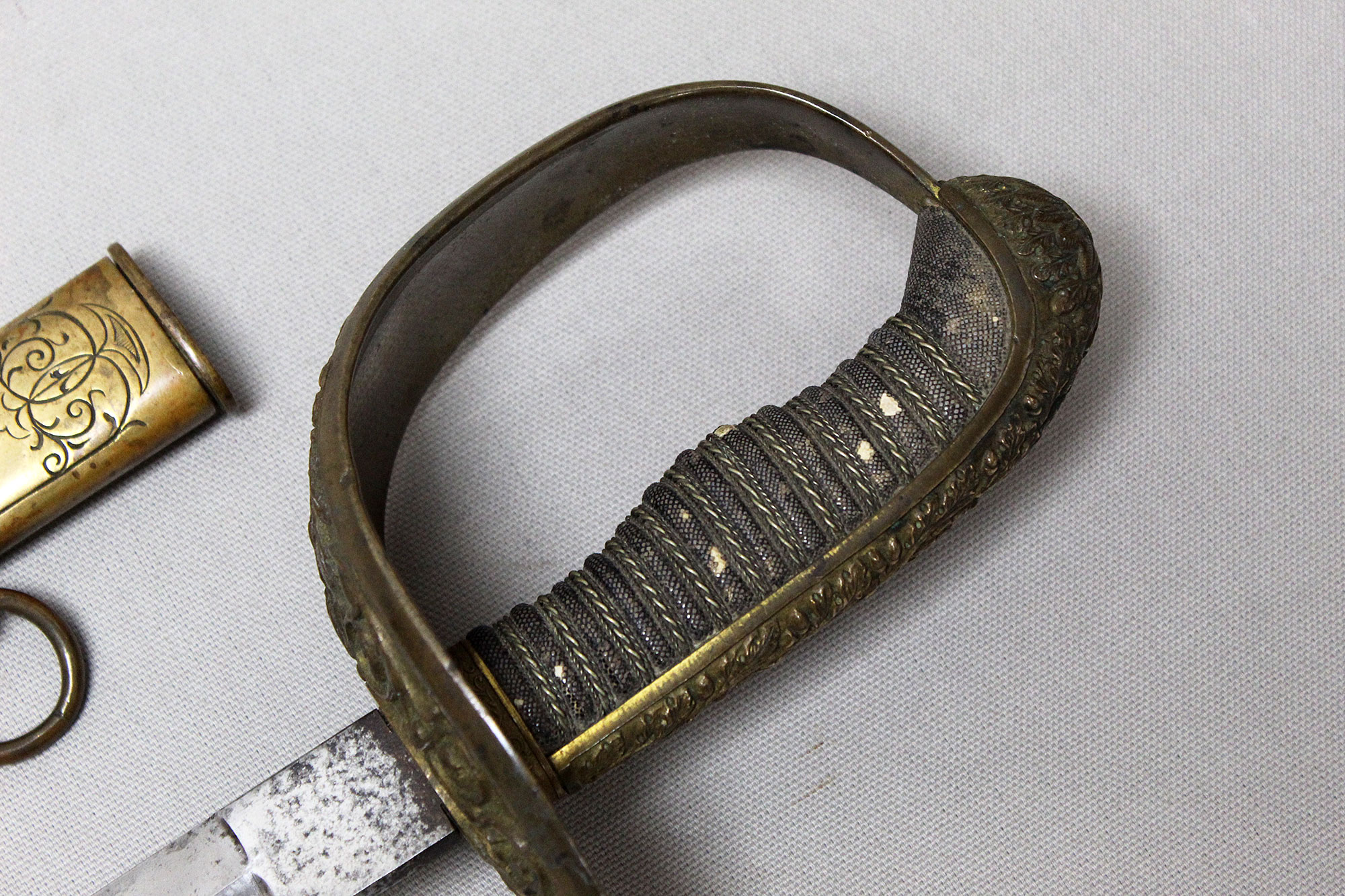 German Deluxe Miner’s Sword. Most likely Weimer era (1919-1933). Scabbard missing upper throat brass screw, also, a wear to black paint with good portions of paint missing on metal scabbard. Double ring scabbard. The brass uppers section of the scabbard has a nice miner’s type design. Grip appears to be a shark skin wrapped wood core grip with triple wire wrap. Brass hilt with nice miner logo type design. Blade has graying and is in average condition, blade etching is very light and hard to clearly make out through the graying. The motto on the one side of the blade is “Gluck Auf” (meaning: Good Luck), there is also Miner’s hammers on the sides of motto. Blade length approximately 32 1/2 inches, about 37 3/4 inches overall, and about 39 inches in scabbard. A very hard sword to find.
