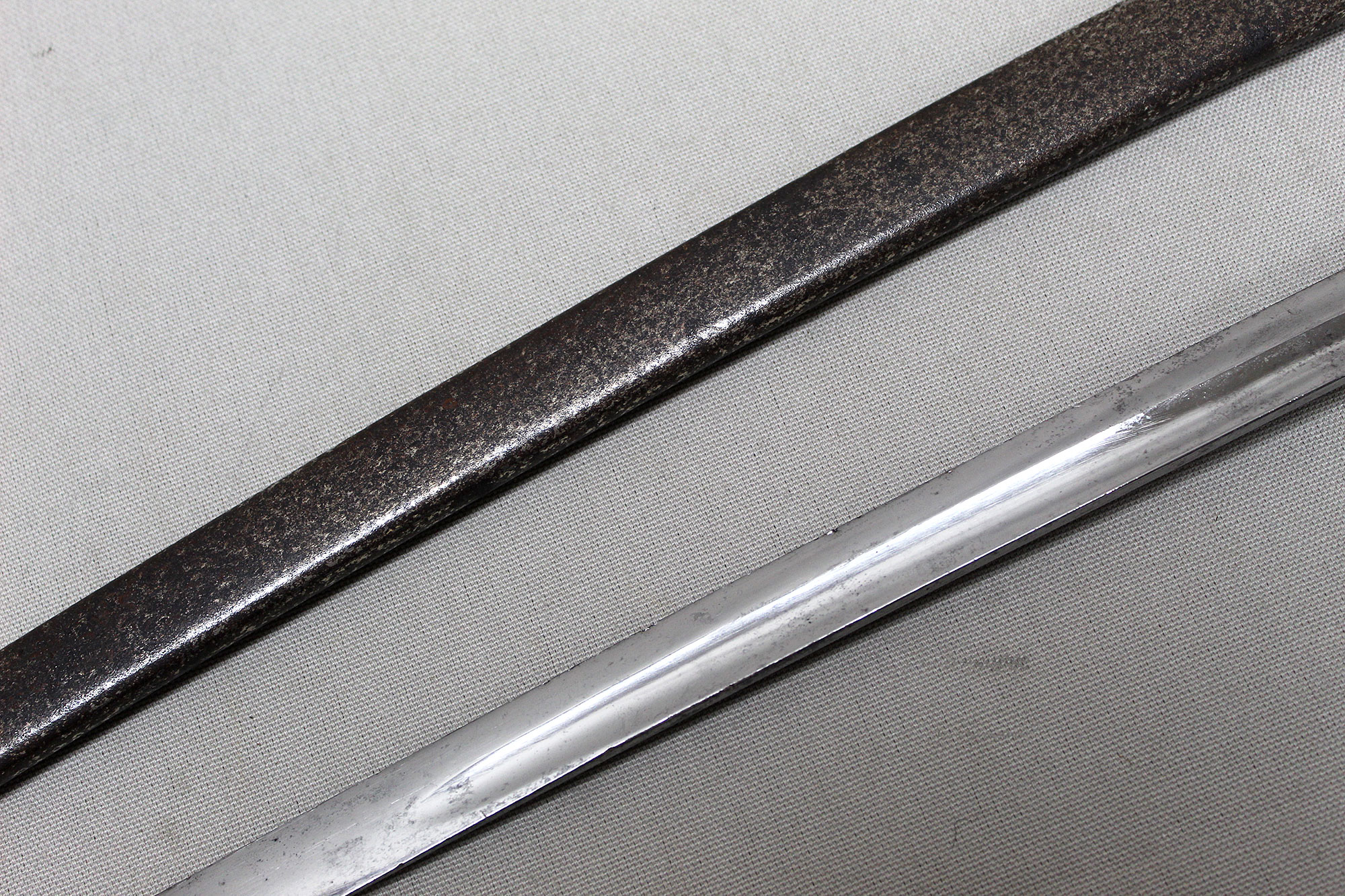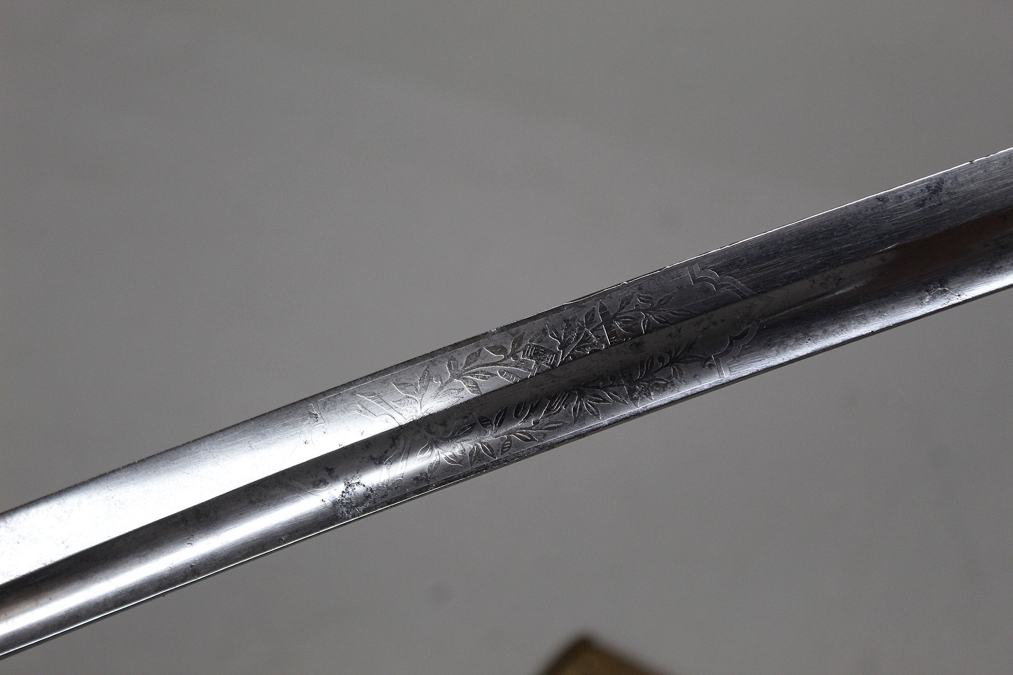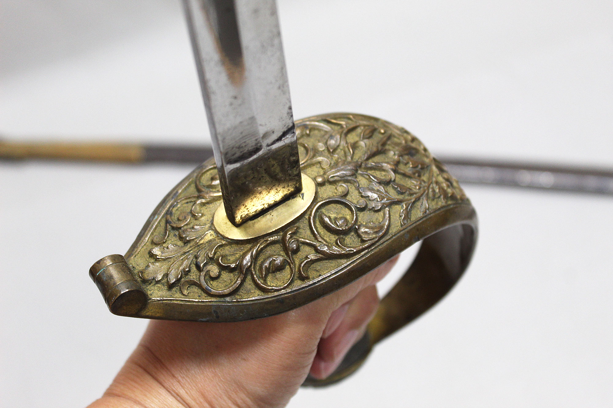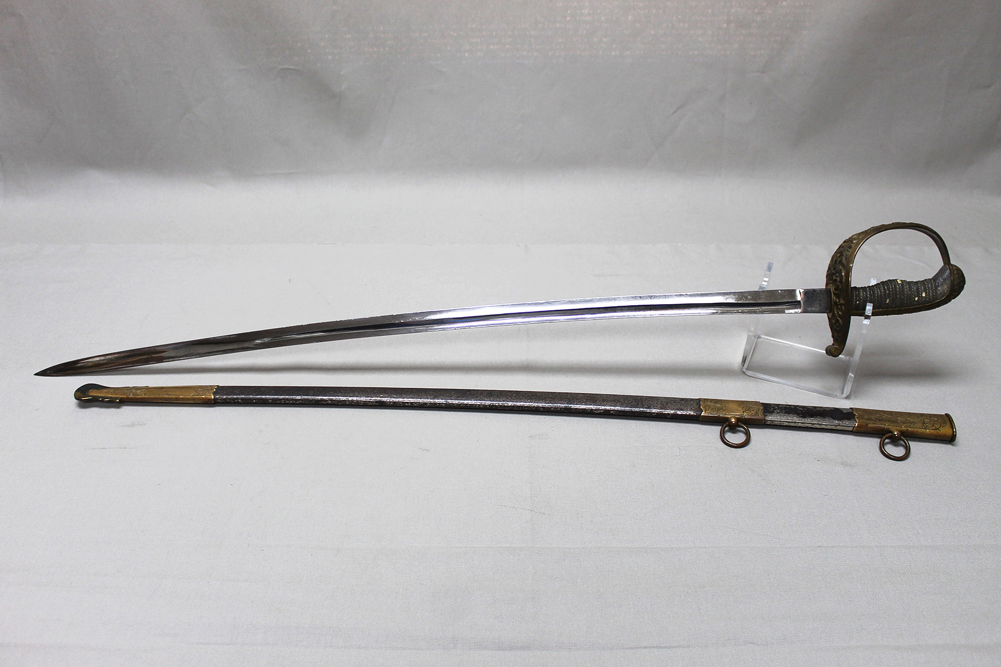 German Deluxe Miner’s Sword. Most likely Weimer era (1919-1933). Scabbard missing upper throat brass screw, also, a wear to black paint with good portions of paint missing on metal scabbard. Double ring scabbard. The brass uppers section of the scabbard has a nice miner’s type design. Grip appears to be a shark skin wrapped wood core grip with triple wire wrap. Brass hilt with nice miner logo type design. Blade has graying and is in average condition, blade etching is very light and hard to clearly make out through the graying. The motto on the one side of the blade is “Gluck Auf” (meaning: Good Luck), there is also Miner’s hammers on the sides of motto. Blade length approximately 32 1/2 inches, about 37 3/4 inches overall, and about 39 inches in scabbard. A very hard sword to find.