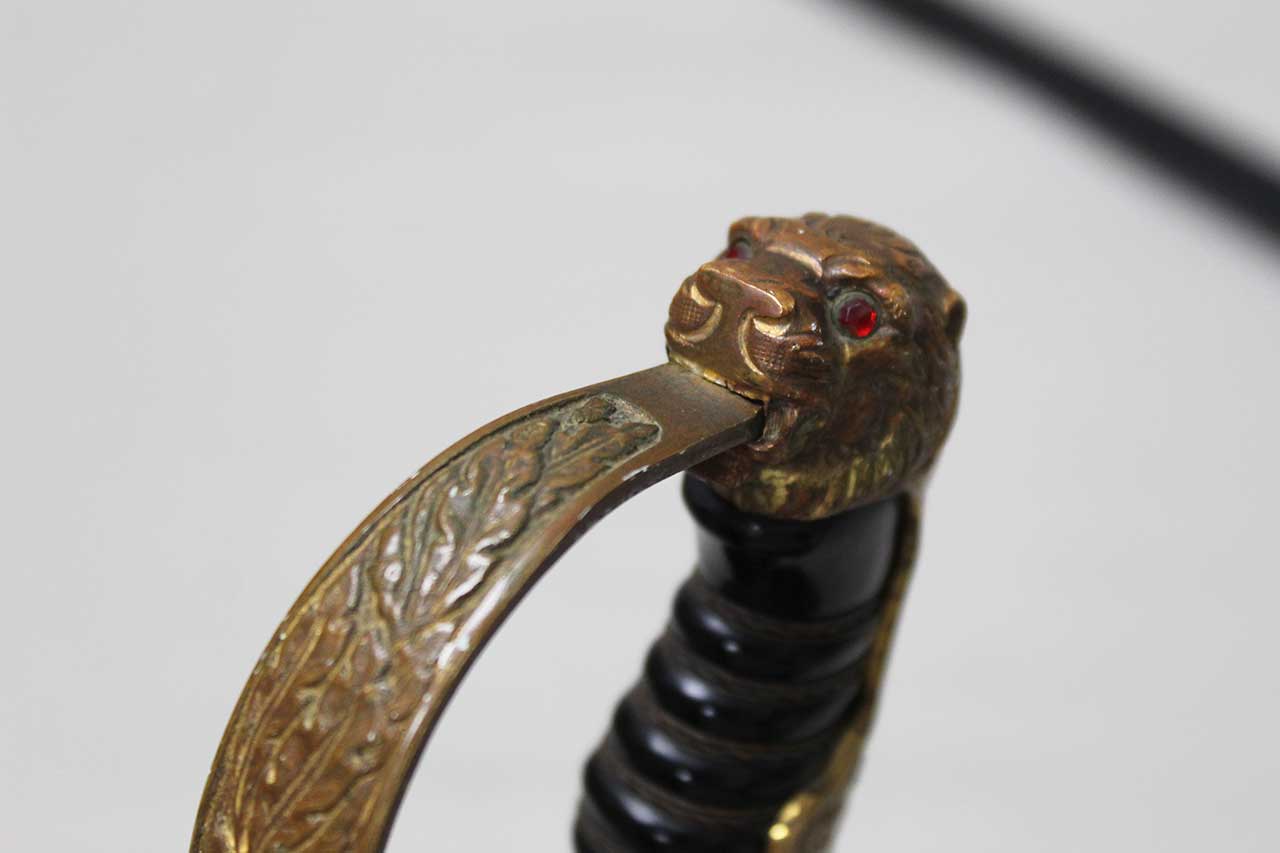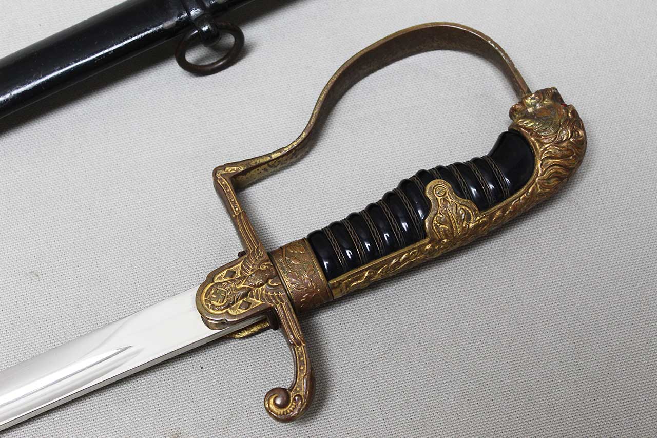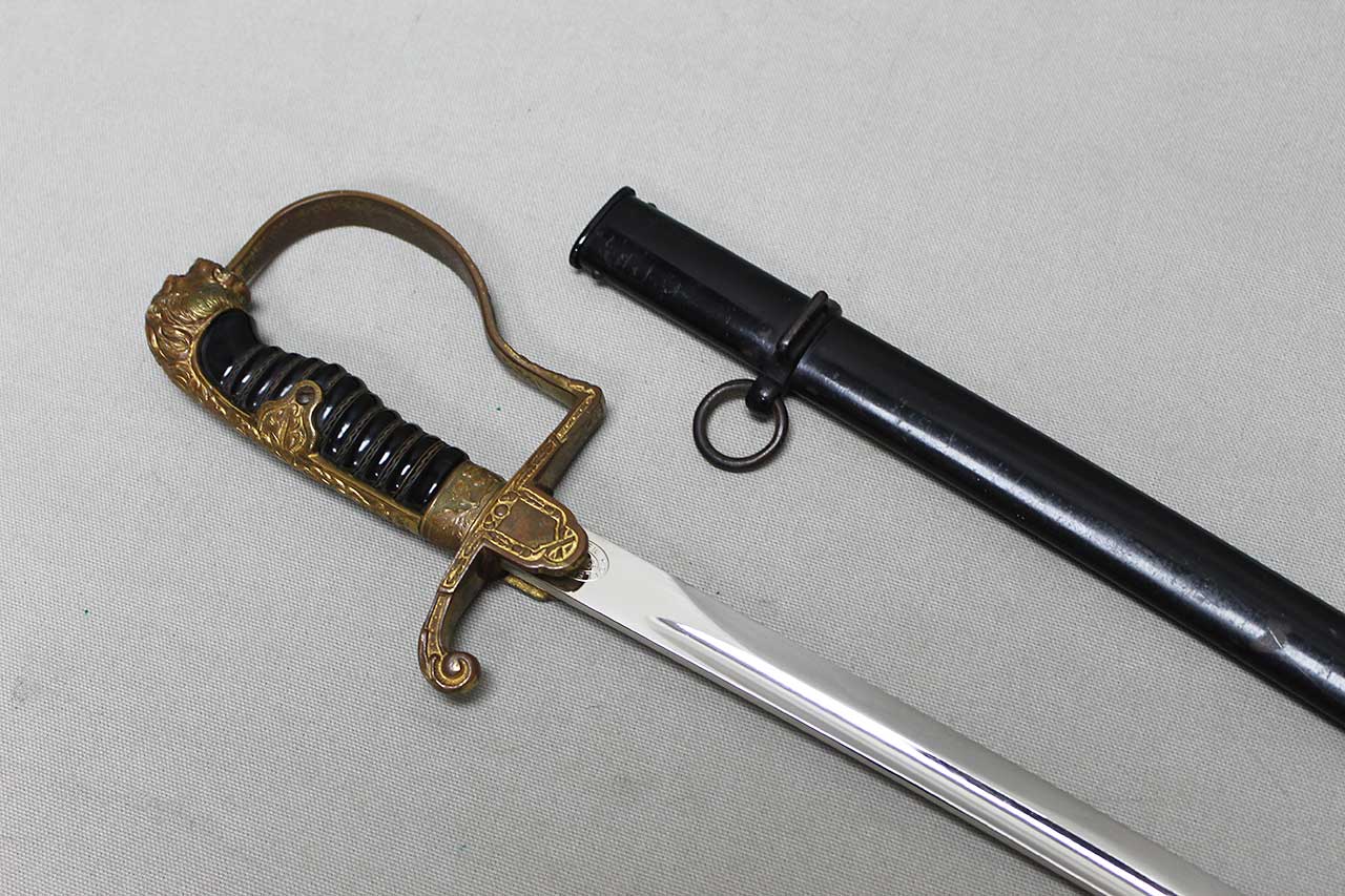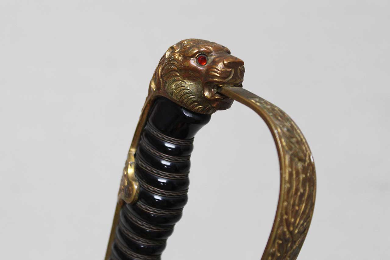 WW2 German Army Officer Lion Head Sword. Blade celluloid grip in good condition with nice, twisted wire wrap. Brass based hilt with nice gilding and lion head with 2 red glass eyes still in place. Blade ricasso marked with FW Holler Solingen logo under cross guard langet. The cross guard langet also has a ww2 German Army eagle design in the center. Blade in good overall condition and scabbard with a bit of wear and scratches to the black paint. Blade leather buffer pad still in place. Blade length approximately 33 inches, about 38 inches overall length. Worn condition.