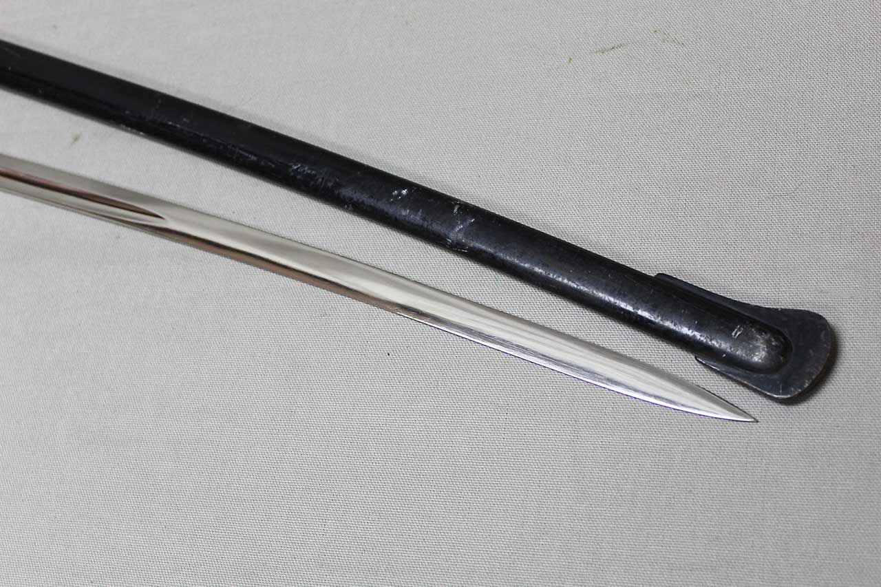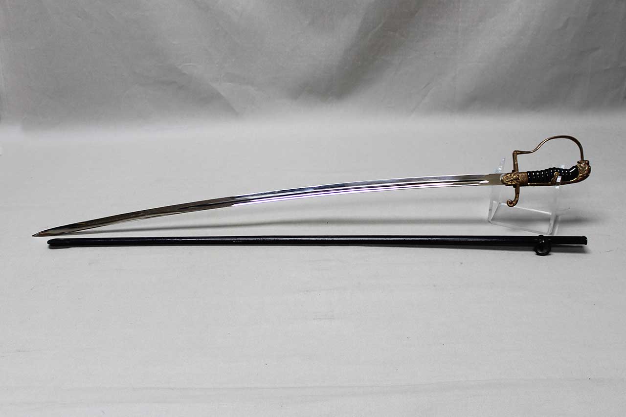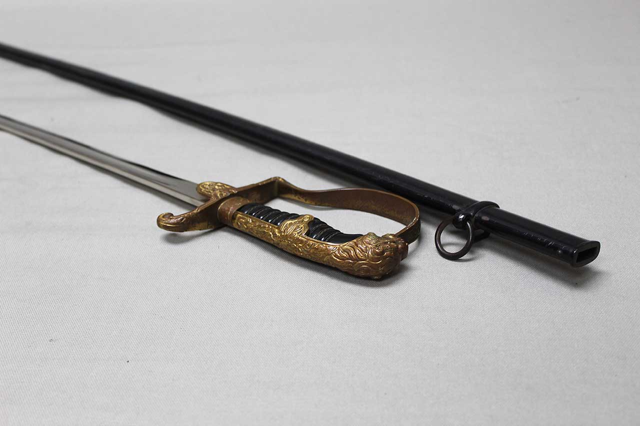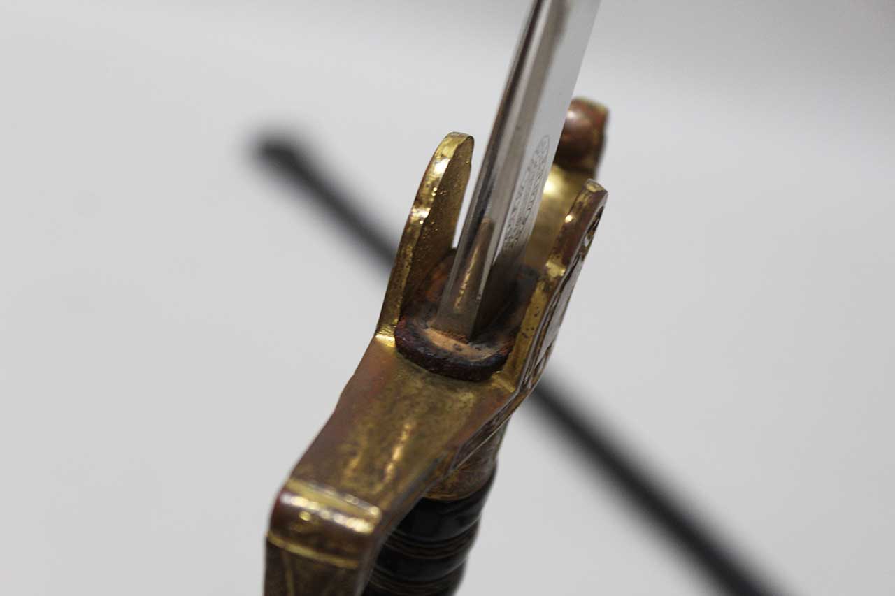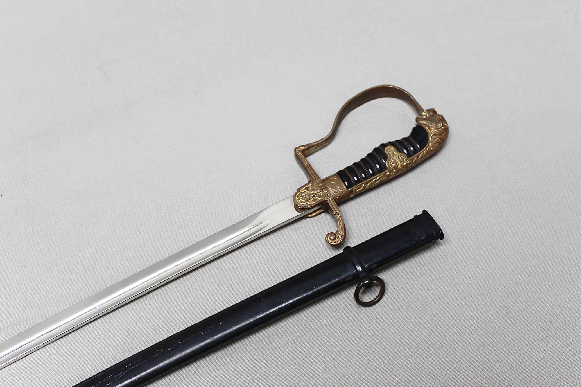 WW2 German Army Officer Lion Head Sword. Blade celluloid grip in good condition with nice, twisted wire wrap. Brass based hilt with nice gilding and lion head with 2 red glass eyes still in place. Blade ricasso marked with FW Holler Solingen logo under cross guard langet. The cross guard langet also has a ww2 German Army eagle design in the center. Blade in good overall condition and scabbard with a bit of wear and scratches to the black paint. Blade leather buffer pad still in place. Blade length approximately 33 inches, about 38 inches overall length. Worn condition.