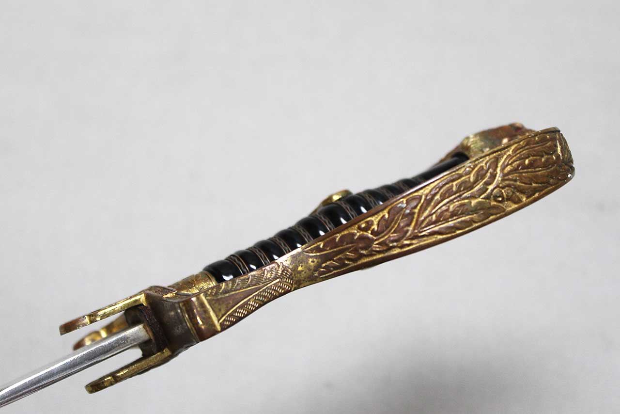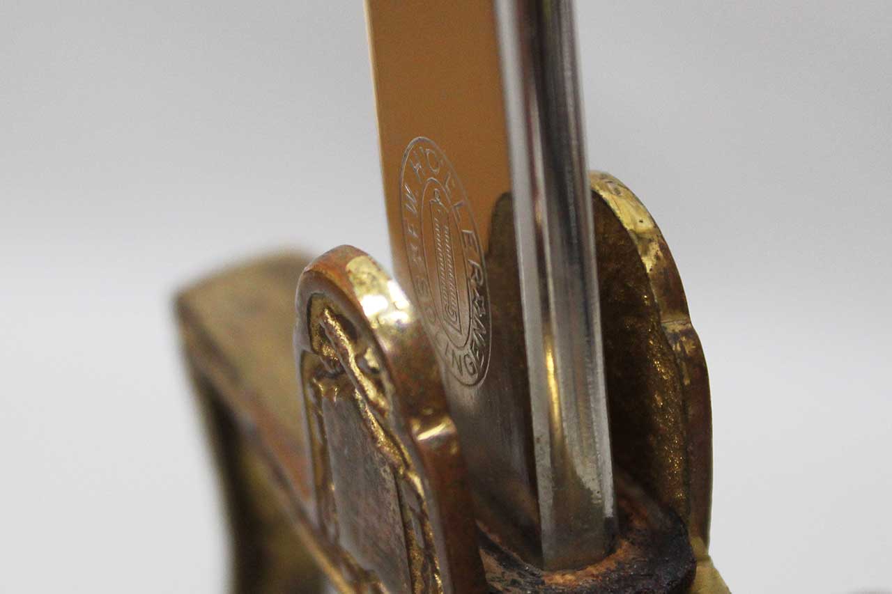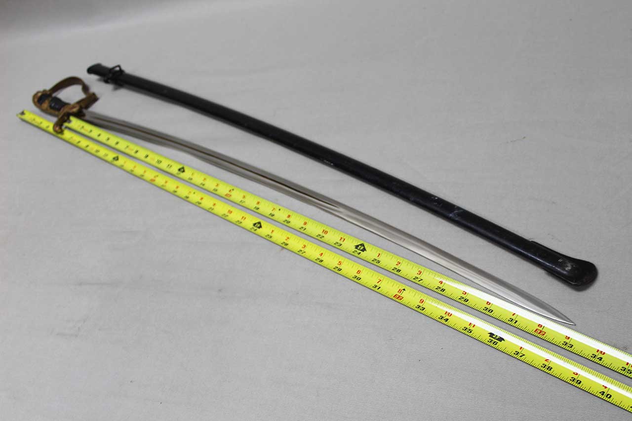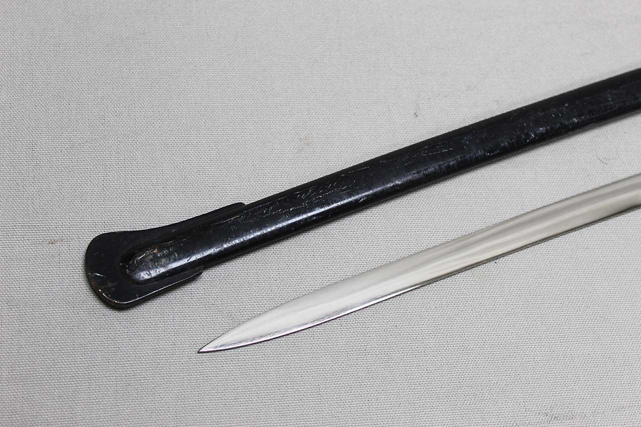 WW2 German Army Officer Lion Head Sword. Blade celluloid grip in good condition with nice, twisted wire wrap. Brass based hilt with nice gilding and lion head with 2 red glass eyes still in place. Blade ricasso marked with FW Holler Solingen logo under cross guard langet. The cross guard langet also has a ww2 German Army eagle design in the center. Blade in good overall condition and scabbard with a bit of wear and scratches to the black paint. Blade leather buffer pad still in place. Blade length approximately 33 inches, about 38 inches overall length. Worn condition.