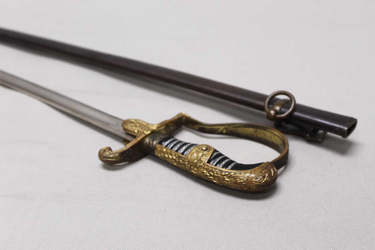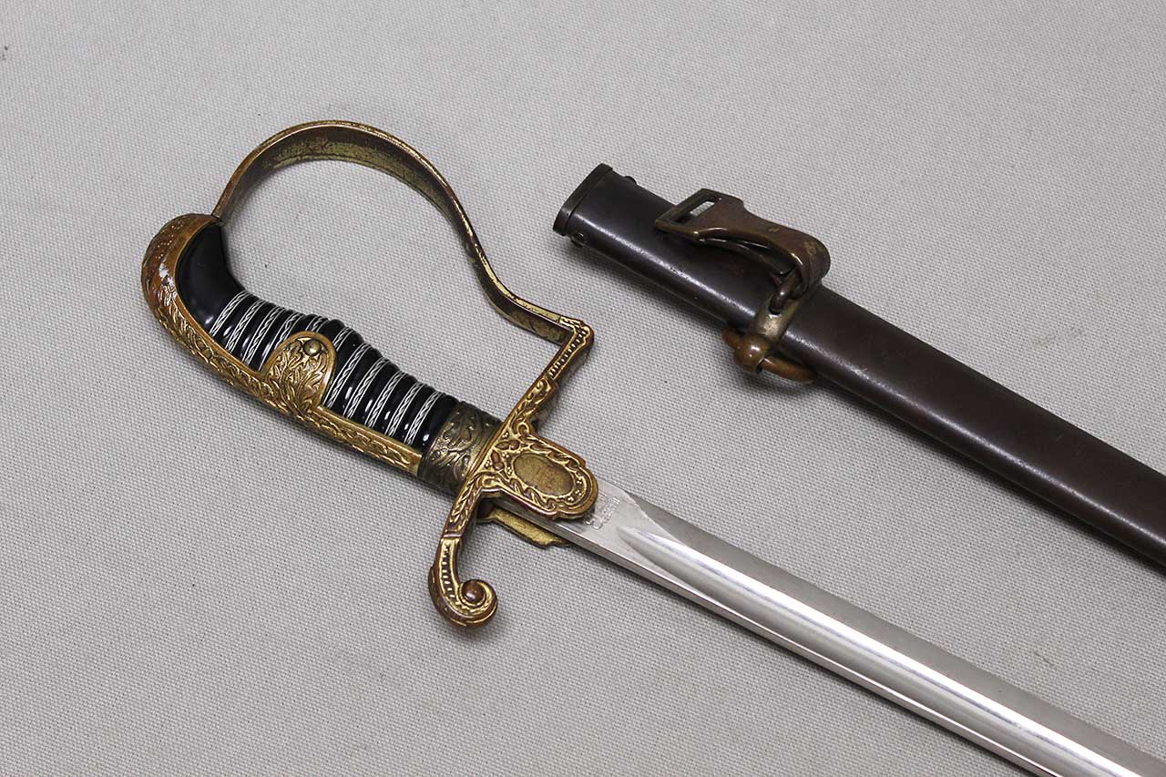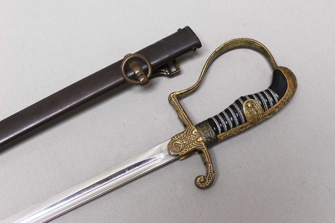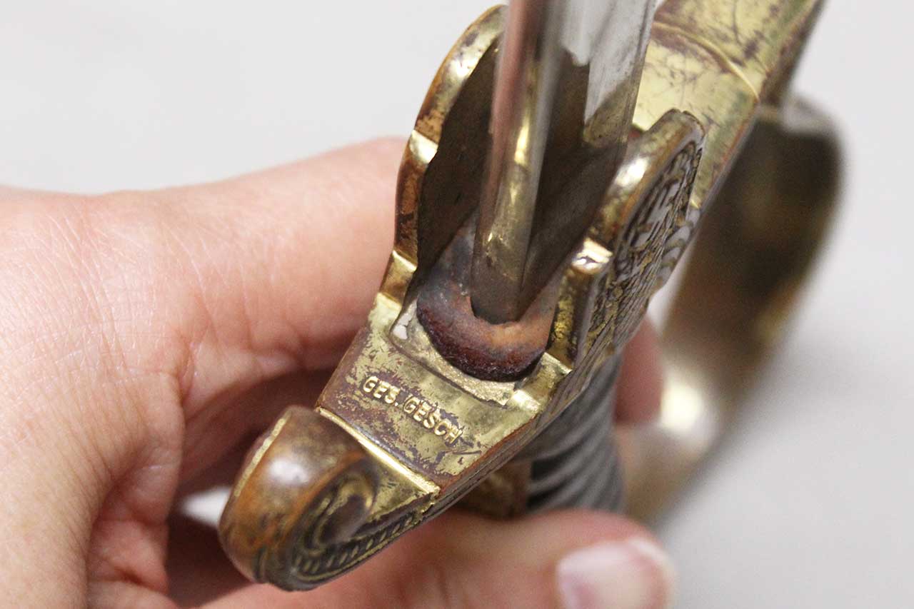 WW2 German Army Officer Sword. Sword black celluloid grip in good condition with nice, triple wire wrap. Gilded brass based hilt with decent gilding and marked Ges Gesch under cross guard. Blade ricasso marked with Eickhorn Solingen logo. The cross guard langet also has a ww2 German Army eagle design in the center. Eickhorn Field Marshall Series, Pattern 1693, Wrangel with left facing Eagle. Blade in decent condition overall, however, does has bend near tip and scabbard with some wear to black anodization and has metal clip attached as well. Blade leather buffer pad still in place. Blade length approximately 31 inches. Worn condition.