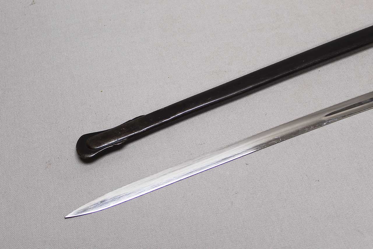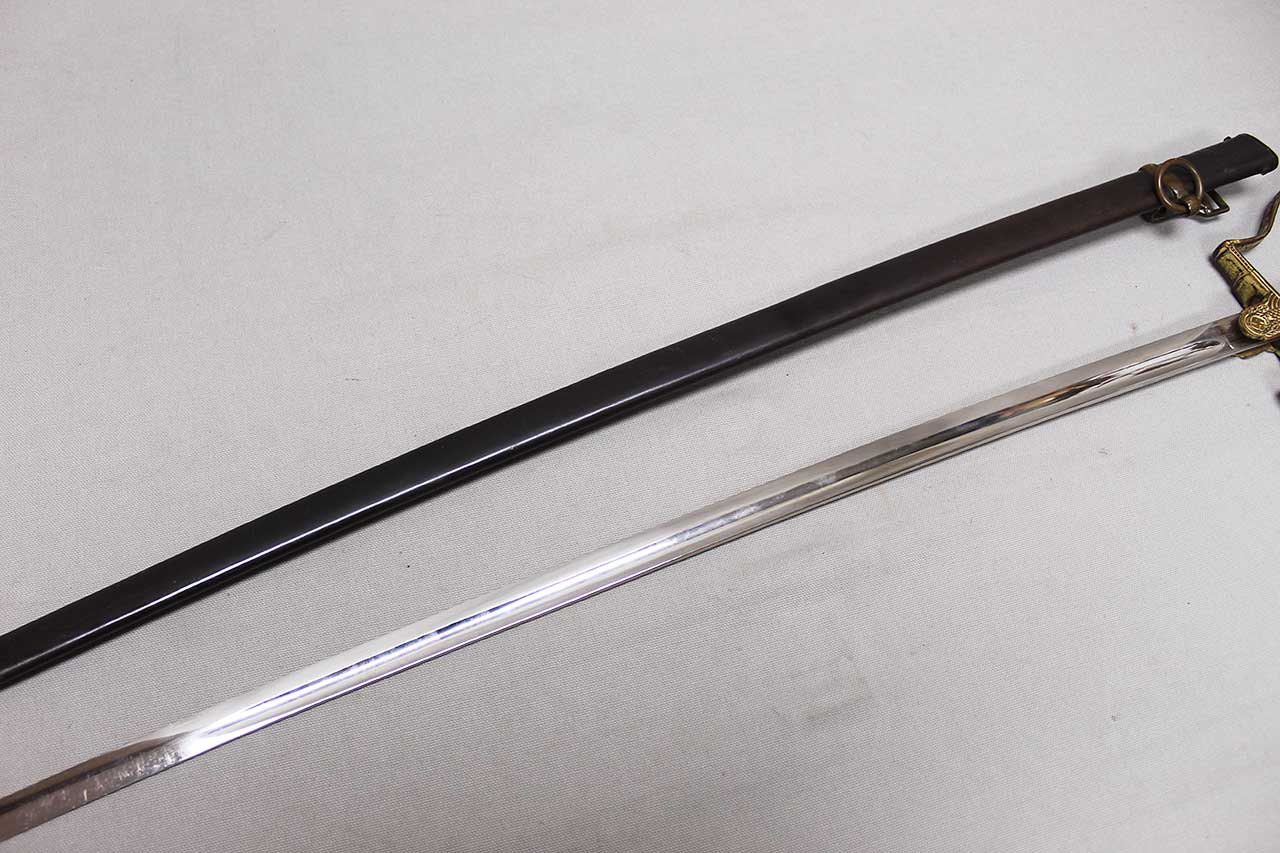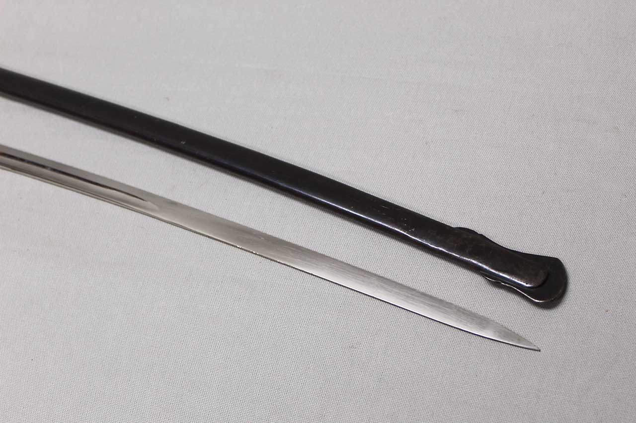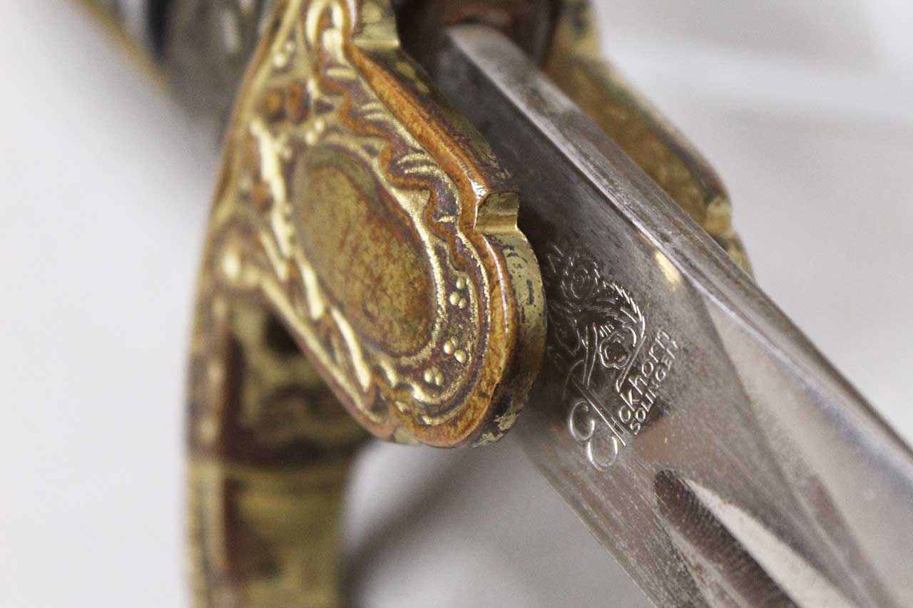WW2 German Army Officer Sword. Sword black celluloid grip in good condition with nice, triple wire wrap. Gilded brass based hilt with decent gilding and marked Ges Gesch under cross guard. Blade ricasso marked with Eickhorn Solingen logo. The cross guard langet also has a ww2 German Army eagle design in the center. Eickhorn Field Marshall Series, Pattern 1693, Wrangel with left facing Eagle. Blade in decent condition overall, however, does has bend near tip and scabbard with some wear to black anodization and has metal clip attached as well. Blade leather buffer pad still in place. Blade length approximately 31 inches. Worn condition.