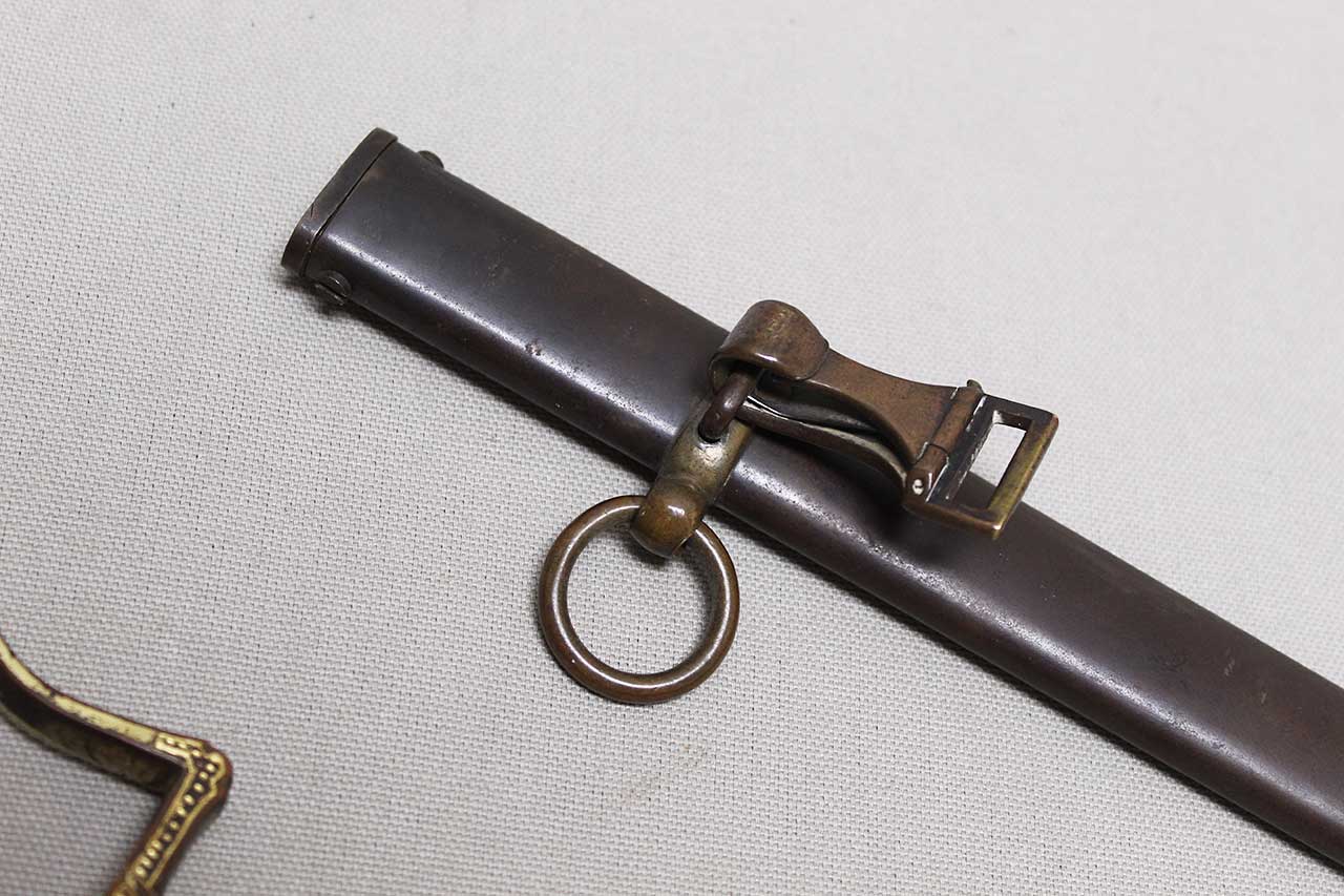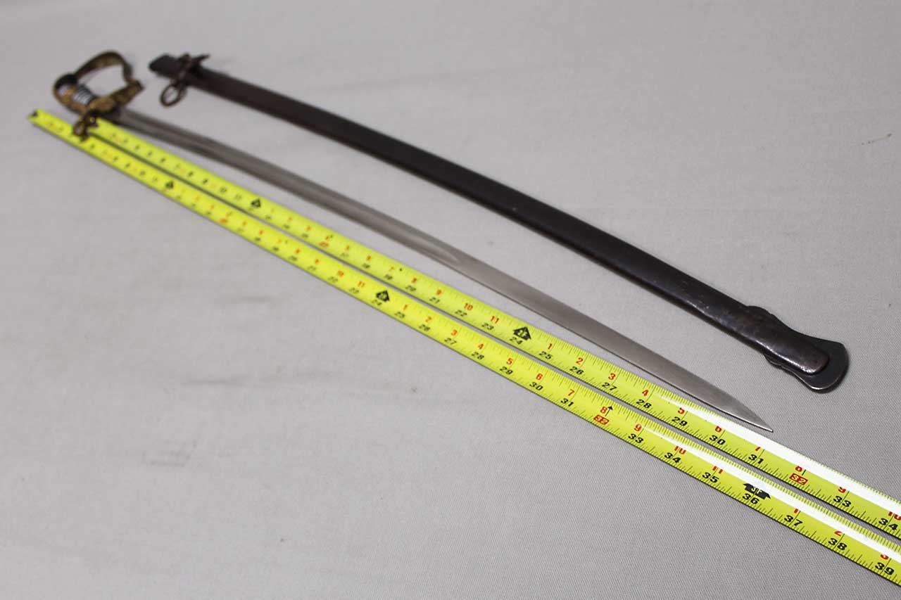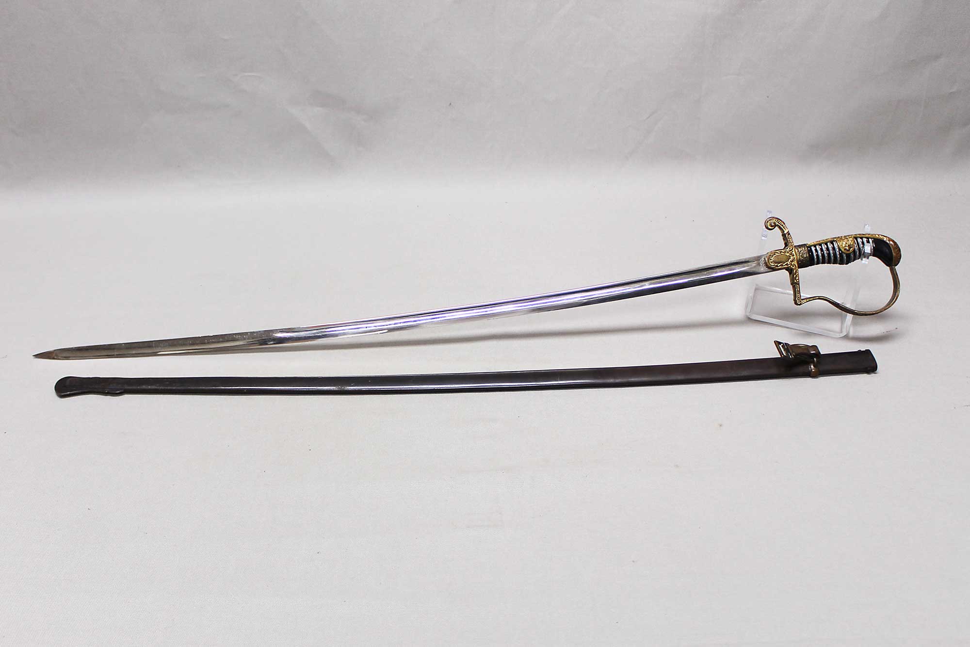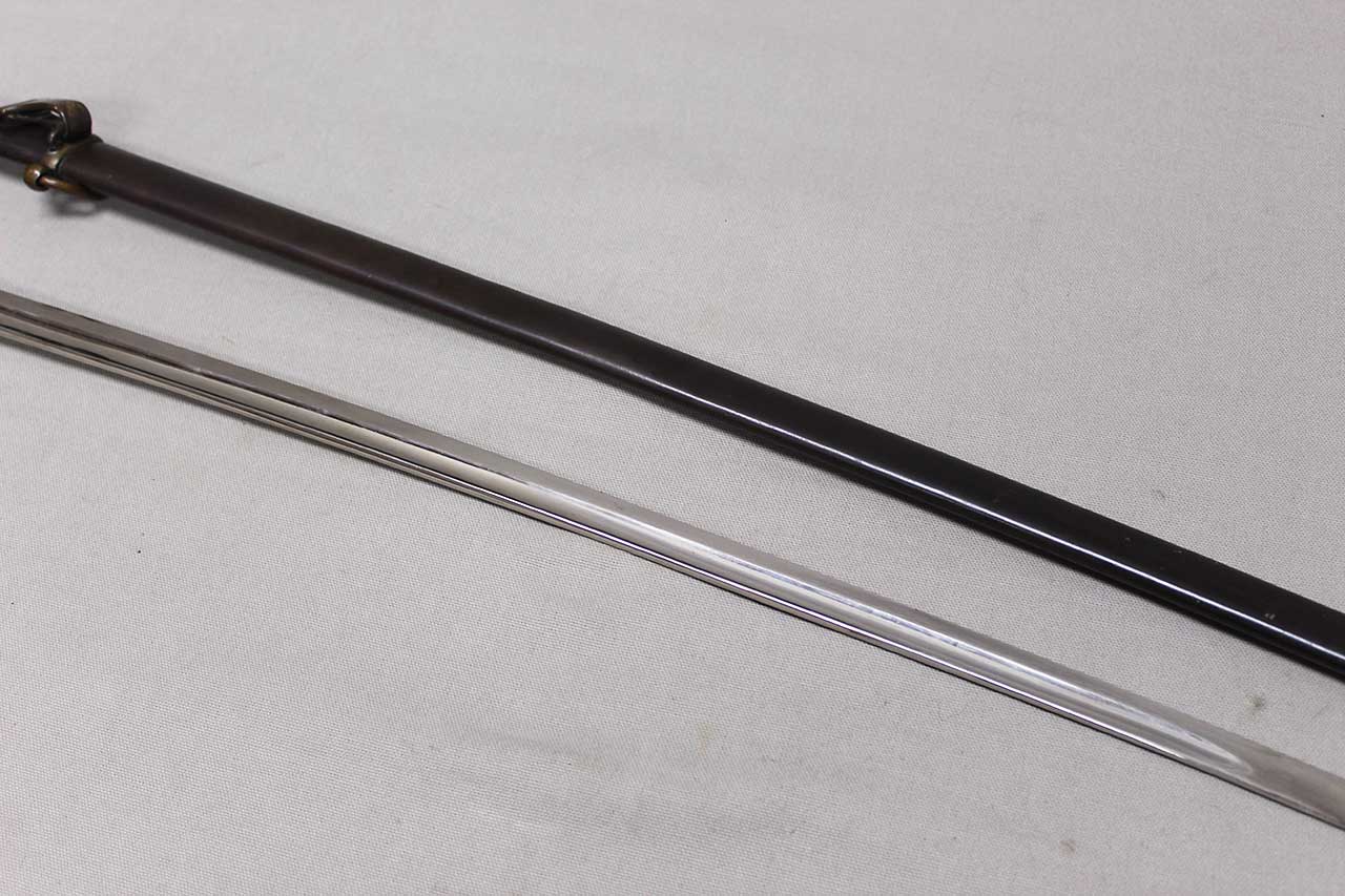WW2 German Army Officer Sword. Sword black celluloid grip in good condition with nice, triple wire wrap. Gilded brass based hilt with decent gilding and marked Ges Gesch under cross guard. Blade ricasso marked with Eickhorn Solingen logo. The cross guard langet also has a ww2 German Army eagle design in the center. Eickhorn Field Marshall Series, Pattern 1693, Wrangel with left facing Eagle. Blade in decent condition overall, however, does has bend near tip and scabbard with some wear to black anodization and has metal clip attached as well. Blade leather buffer pad still in place. Blade length approximately 31 inches. Worn condition.