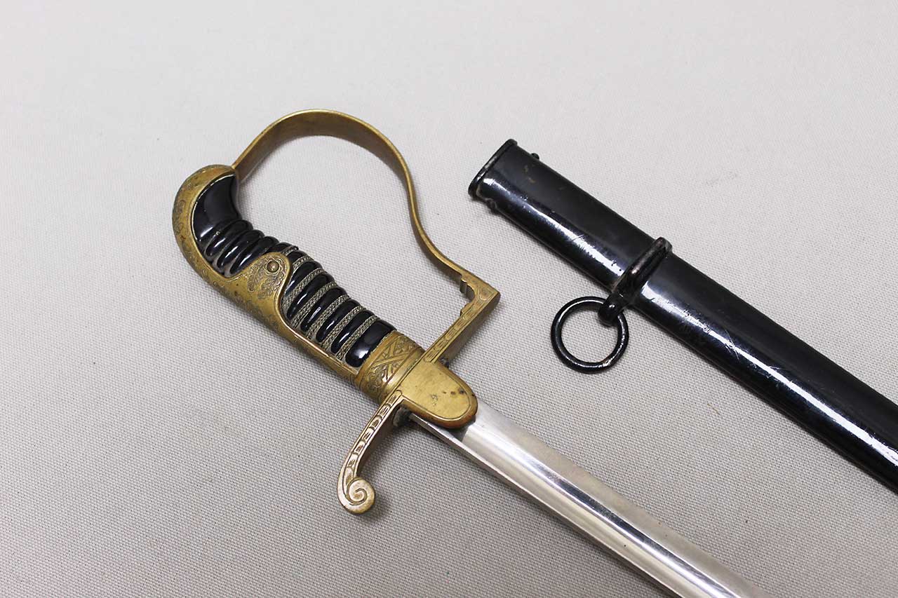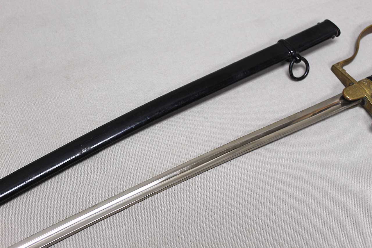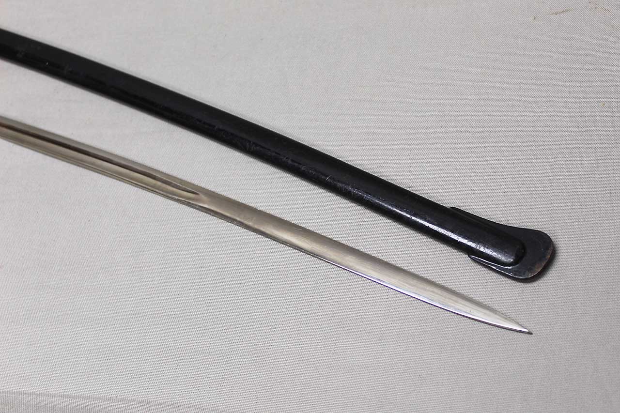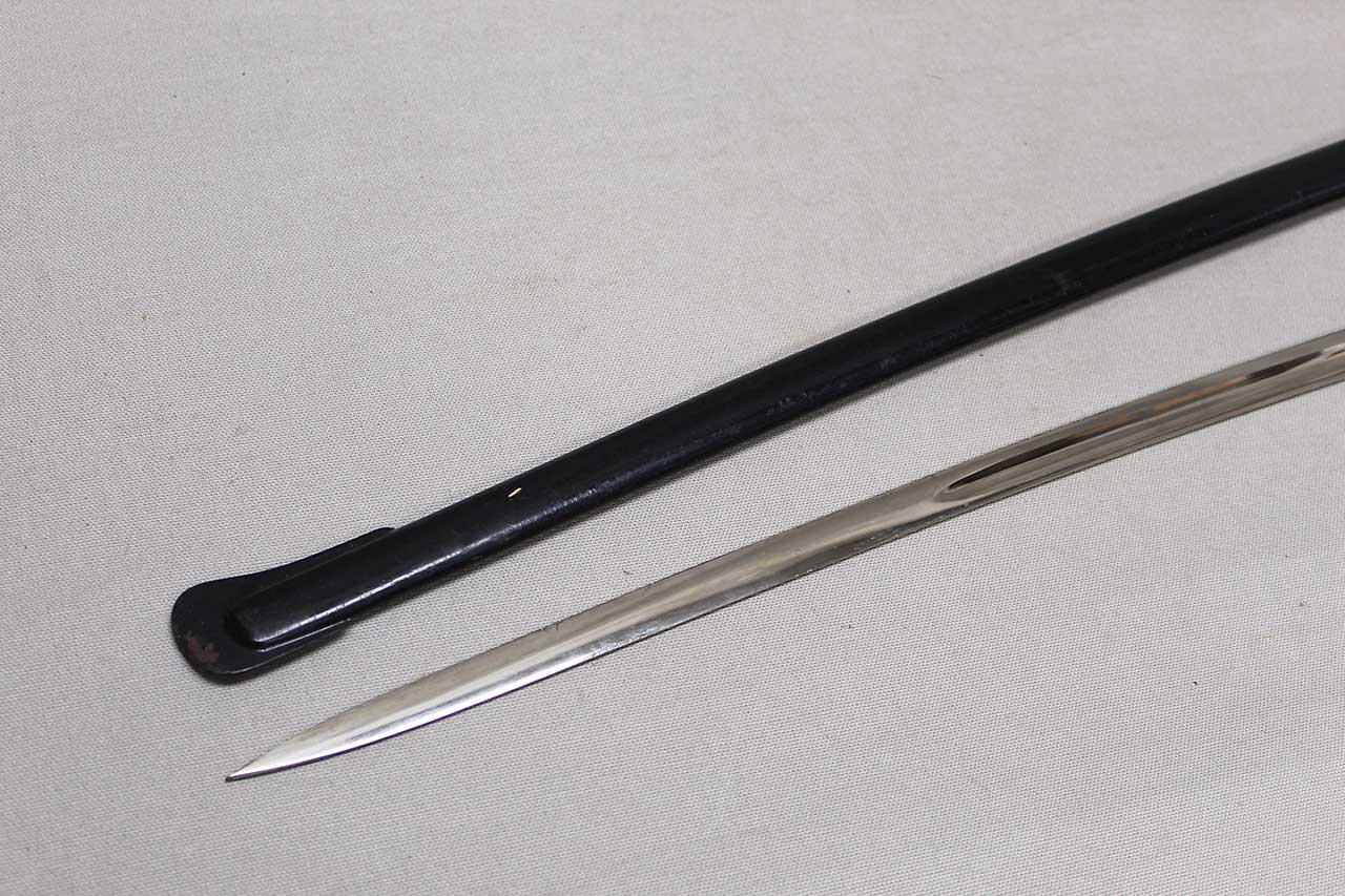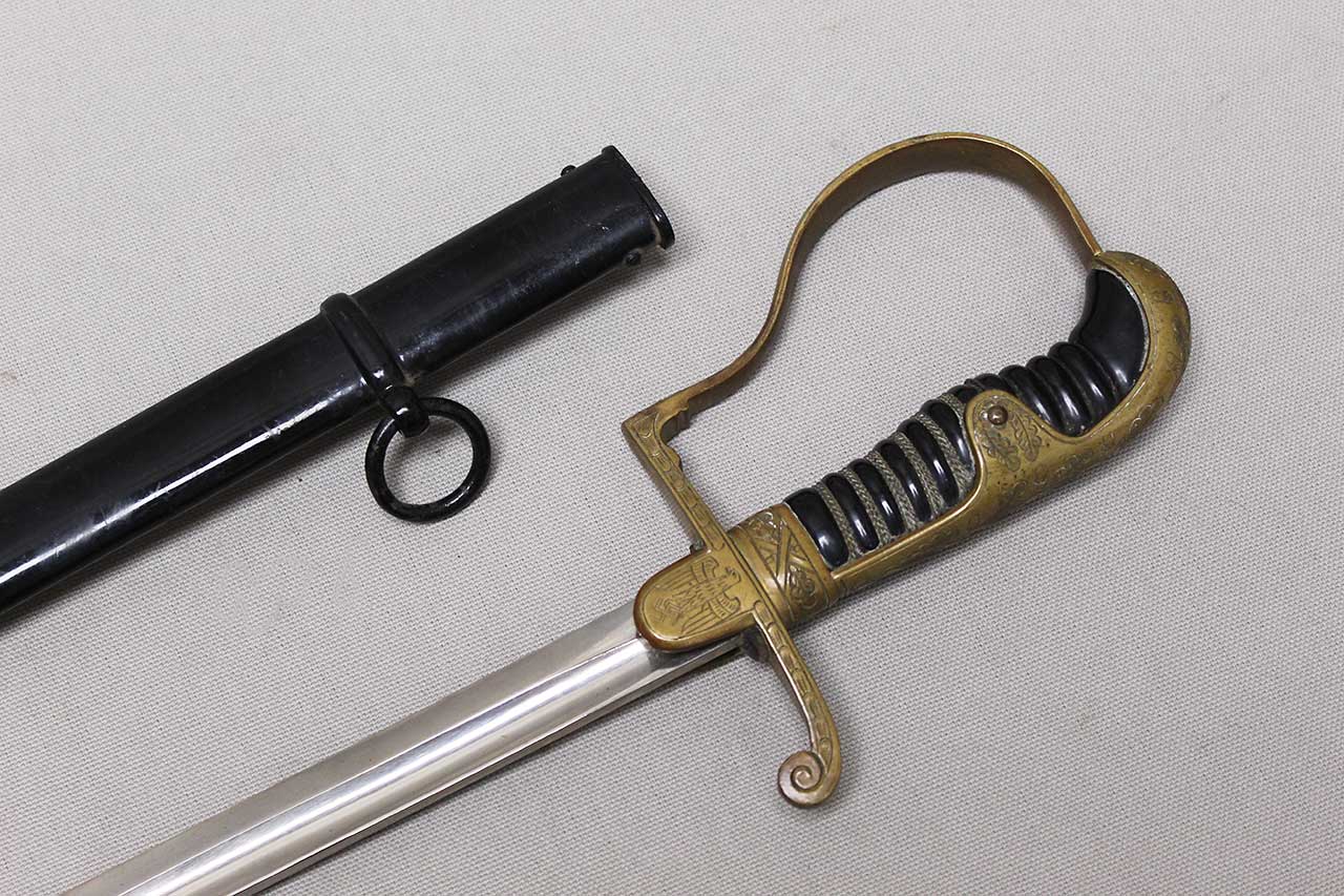 WW2 German Army Officer sword. This is a “Dove Head” style sword hilt. Marker marked on the blade ricaso with the logo for E&F Horster Solingen. Brass based hilt and fittings with German eagle on cross guard. The sword black celluliod (plastic) grip in decent condition with triple wire wrap, however, about half of the wire wrap is missing. Leather buffer pad still in place. Overall decent condition blade. Scabbard with some wear to the paint. Blade approximately 30 inches in length. Worn condition.