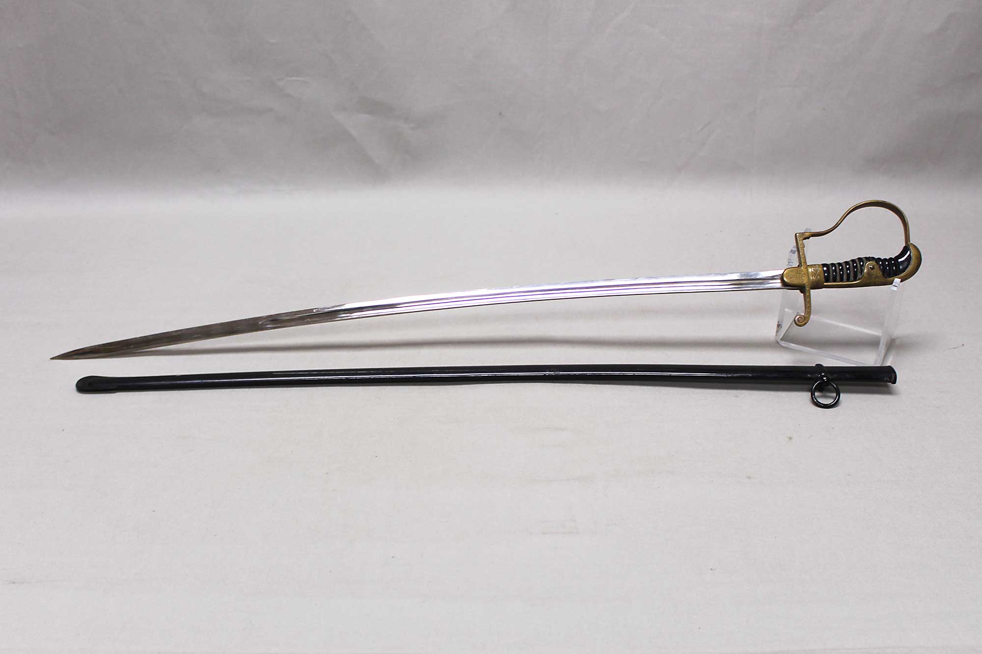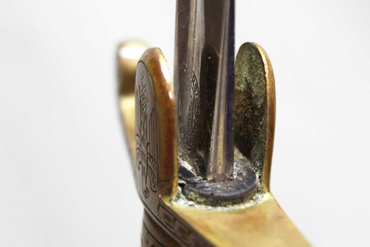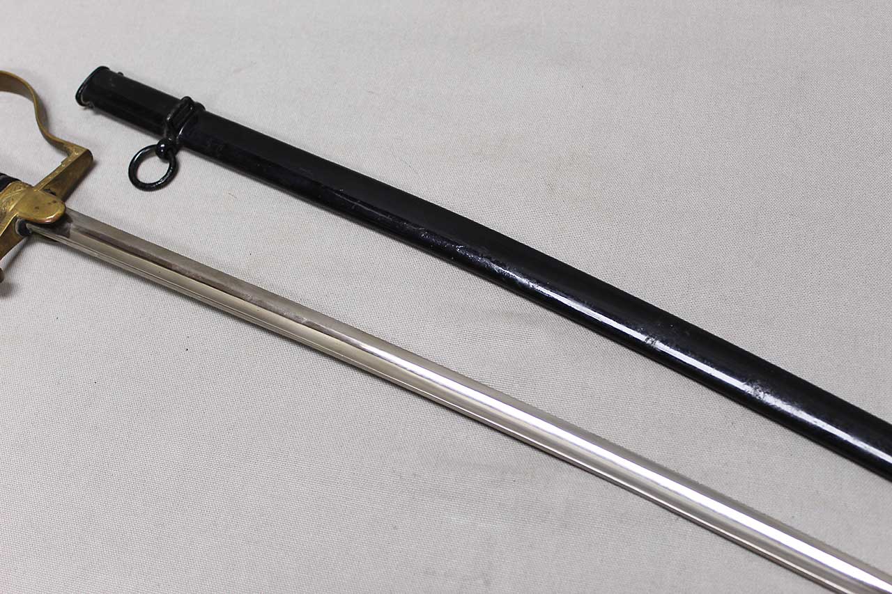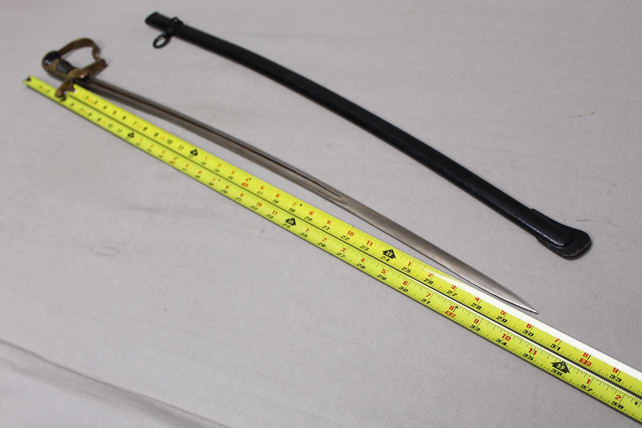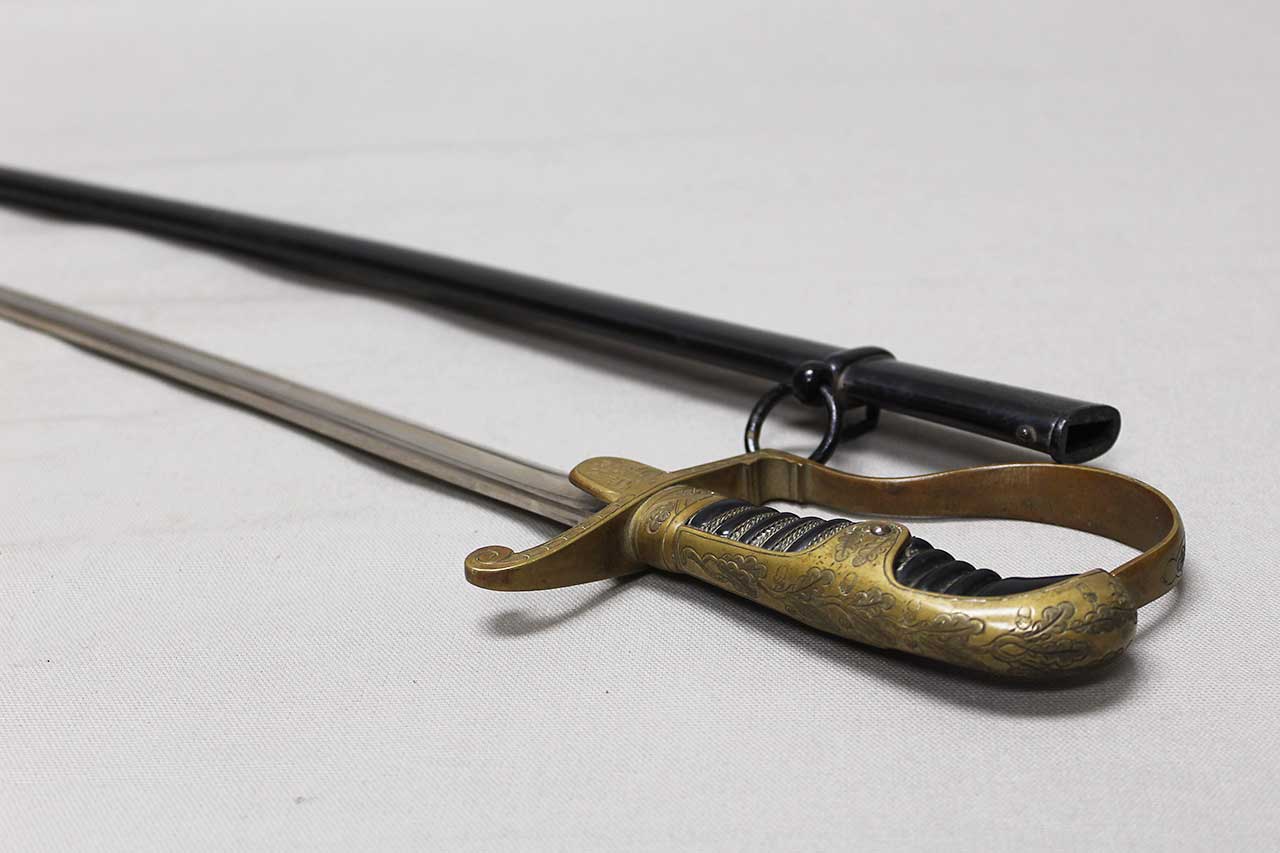 WW2 German Army Officer sword. This is a “Dove Head” style sword hilt. Marker marked on the blade ricaso with the logo for E&F Horster Solingen. Brass based hilt and fittings with German eagle on cross guard. The sword black celluliod (plastic) grip in decent condition with triple wire wrap, however, about half of the wire wrap is missing. Leather buffer pad still in place. Overall decent condition blade. Scabbard with some wear to the paint. Blade approximately 30 inches in length. Worn condition.