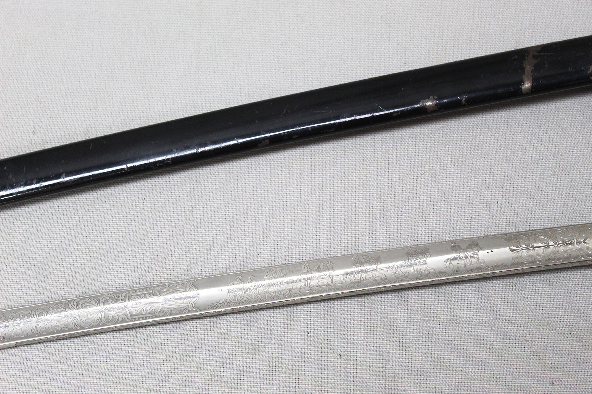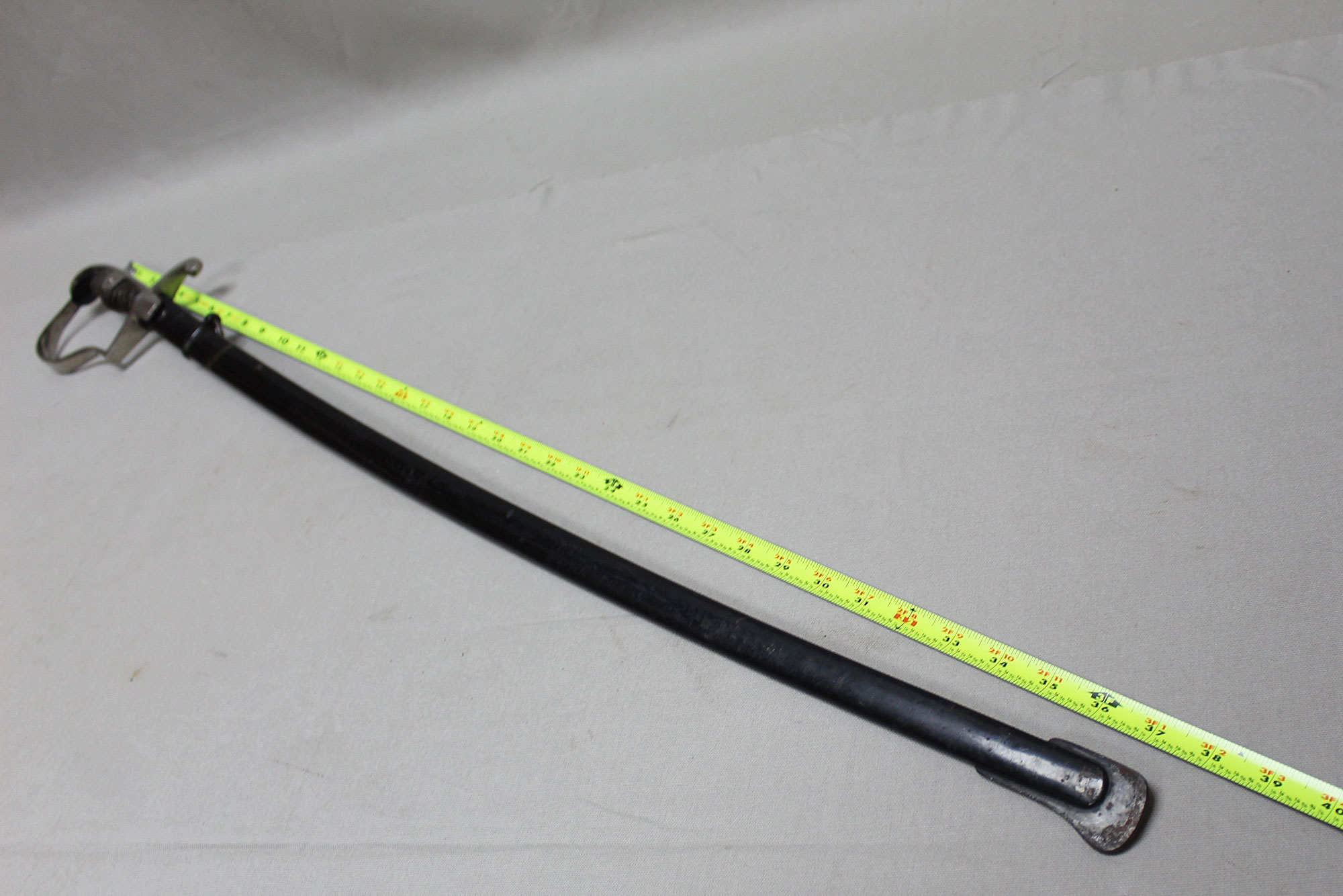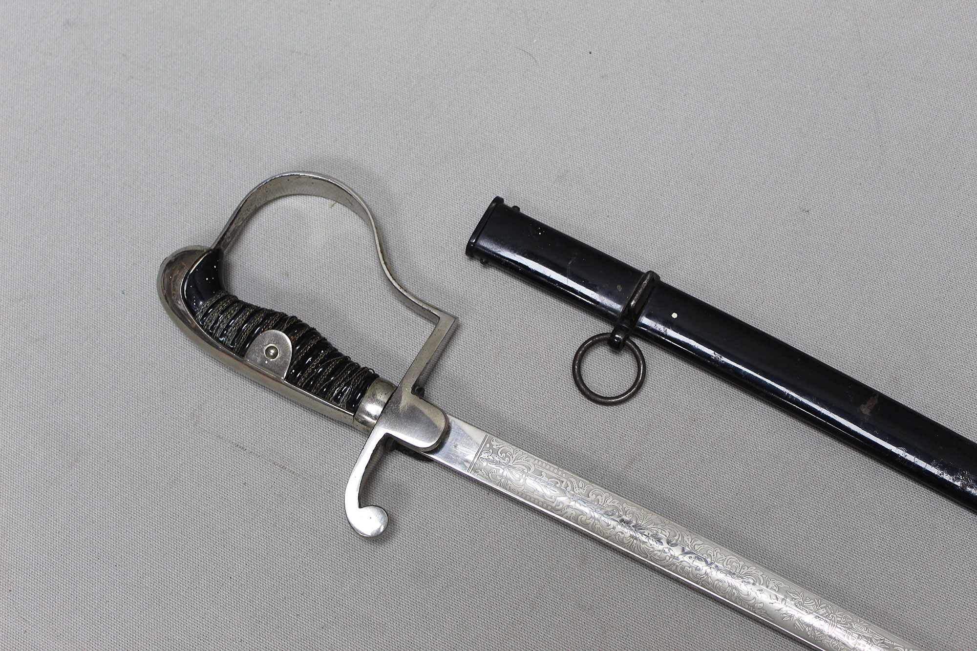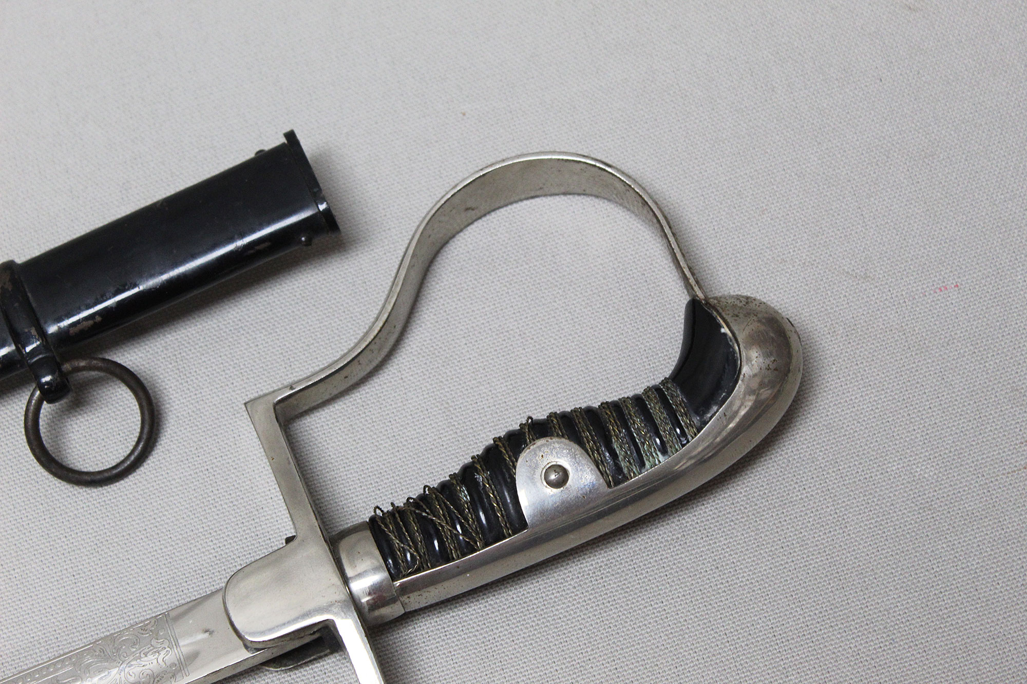 German Artillery NCO/Officer Sword. Triple engraved blade with artillery type scenes (soldiers on horseback pulling cannons, crossed cannons, etc.) Marker marked on blade ricasso with the WKC knight’s head logo. Blade in average condition and still has leather blade buffer pad in place. Black bakelite (plastic) covered wood core grip with triple wire wrap, the wire wrap is loose in several places. The nickel-plated steel hilt fittings in worn condition. Black painted single ring scabbard with some wear, scratches, and paint loss in areas. Blade length approximately 32 inches, approximately 38 inches overall length in scabbard. Most likely 1920s-1940s (Wiemar-WW2) era. Worn condition with loose wire wrap on grip.