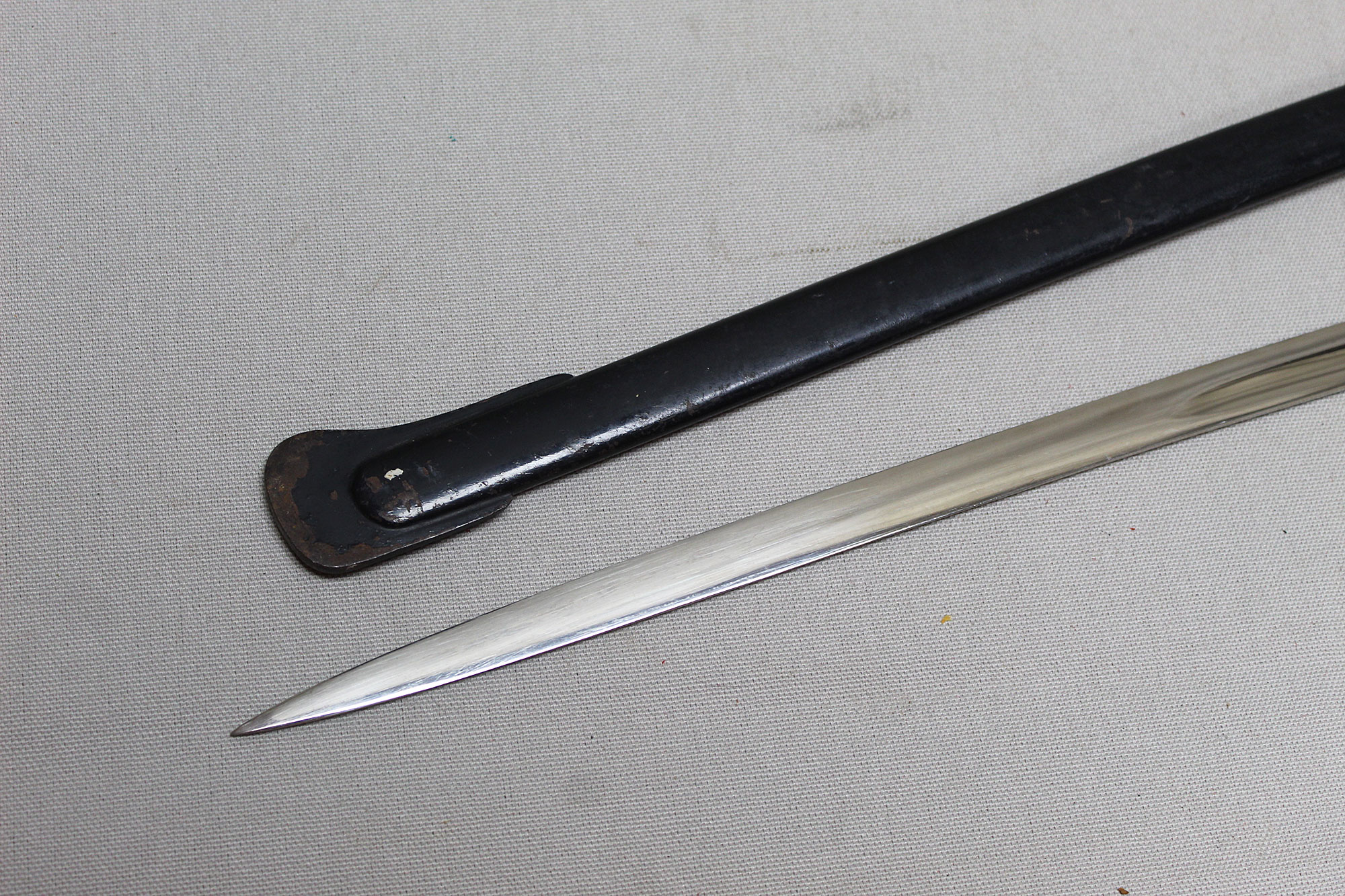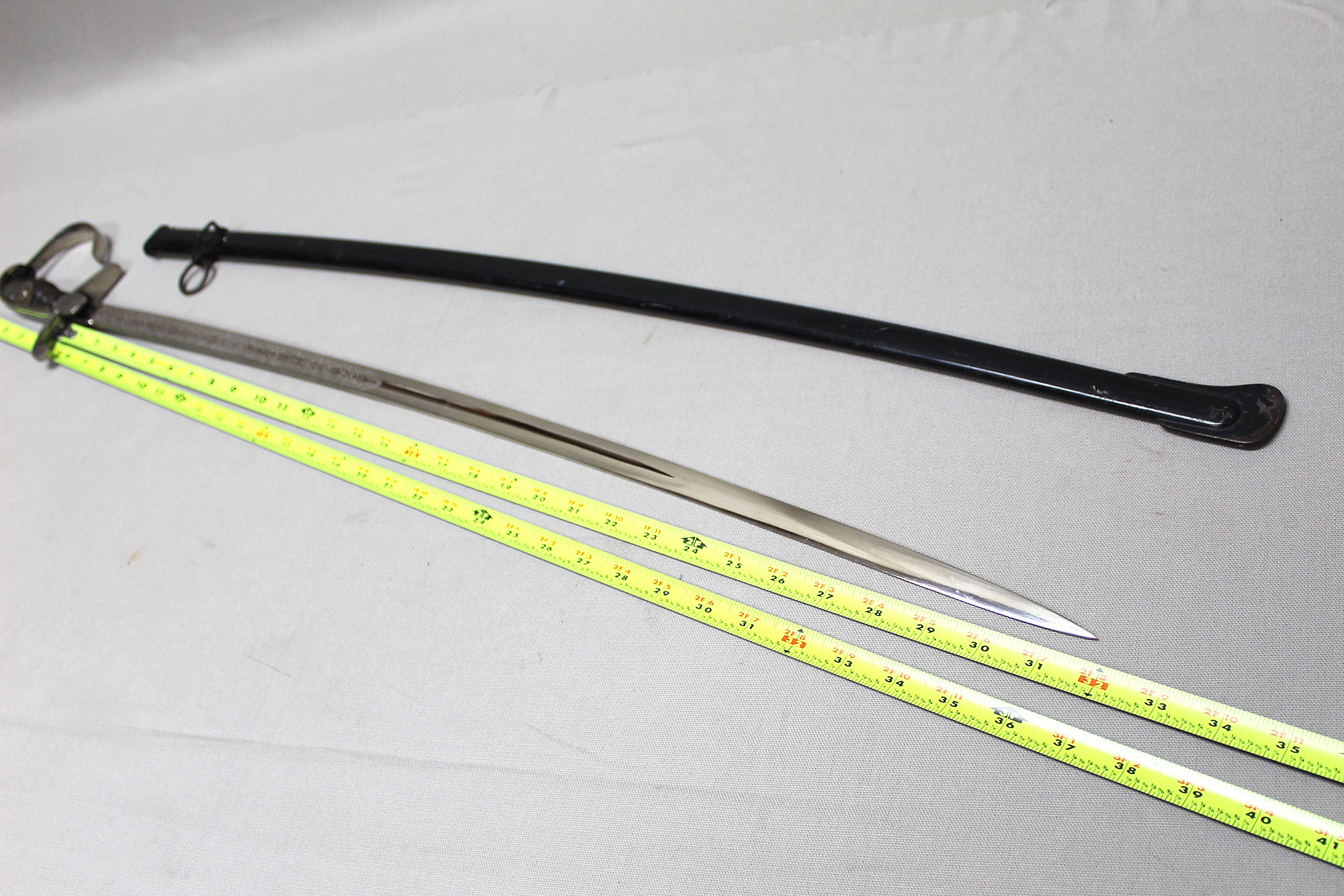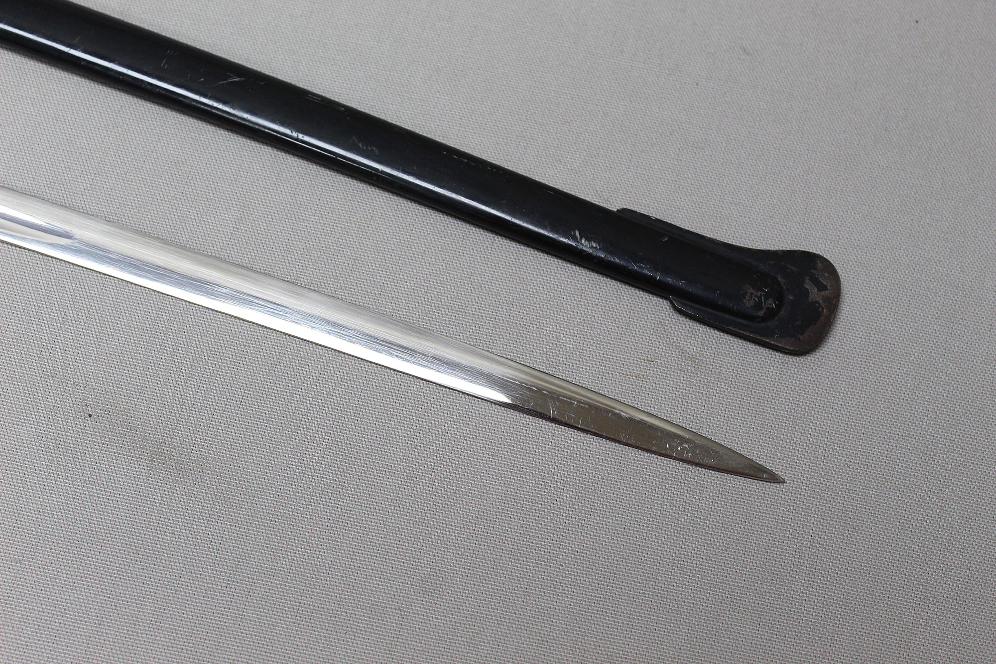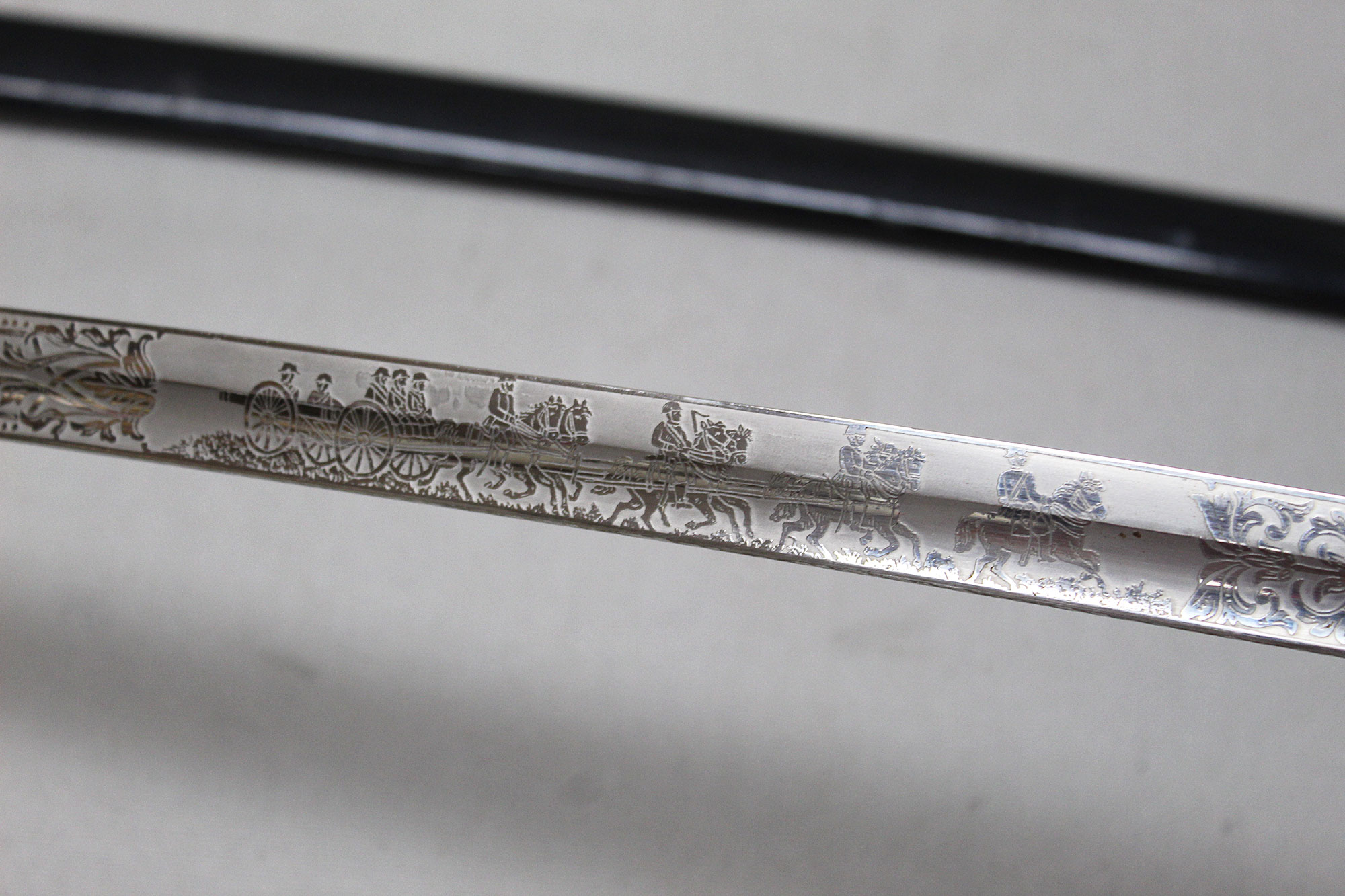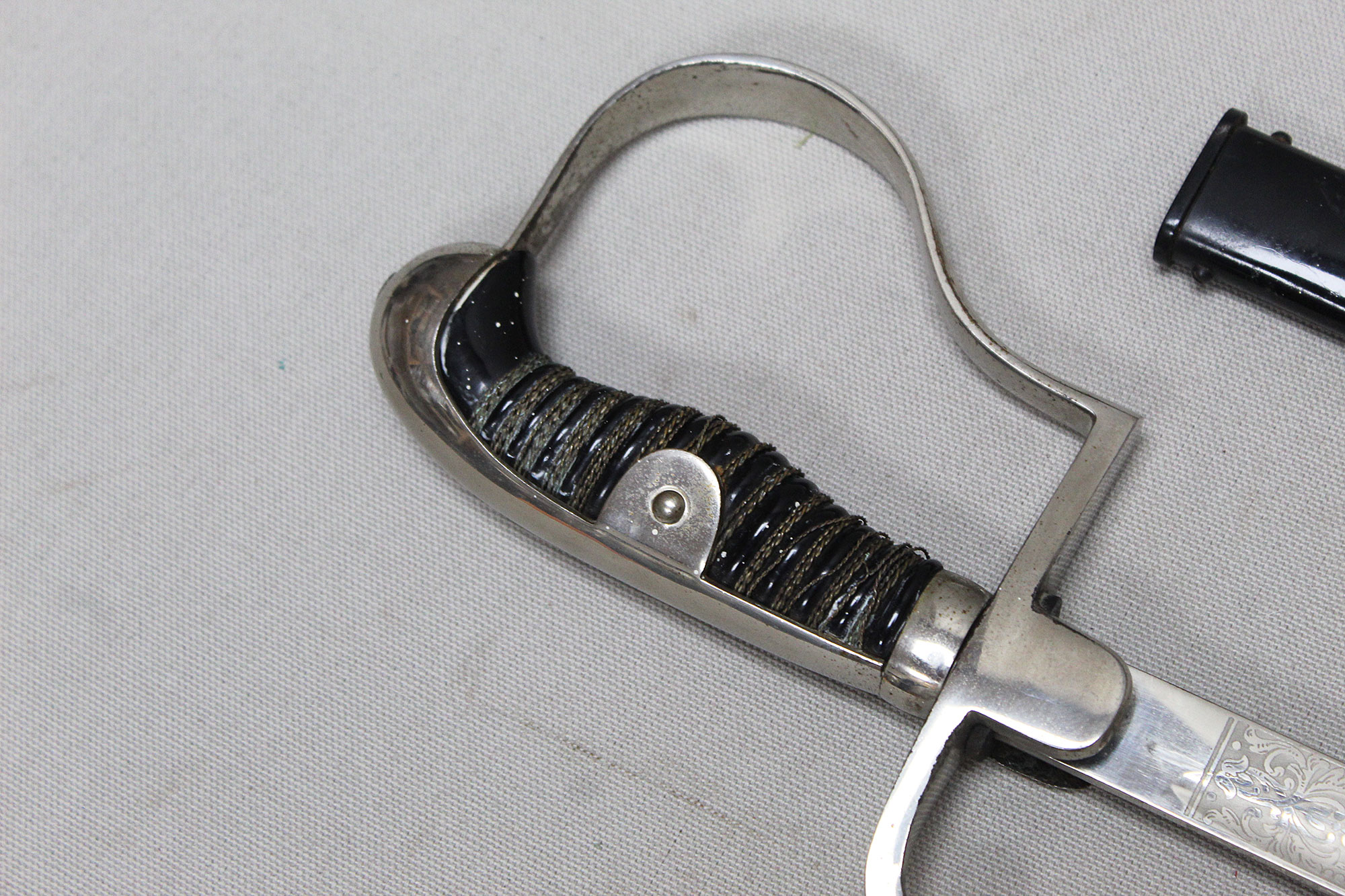 German Artillery NCO/Officer Sword. Triple engraved blade with artillery type scenes (soldiers on horseback pulling cannons, crossed cannons, etc.) Marker marked on blade ricasso with the WKC knight’s head logo. Blade in average condition and still has leather blade buffer pad in place. Black bakelite (plastic) covered wood core grip with triple wire wrap, the wire wrap is loose in several places. The nickel-plated steel hilt fittings in worn condition. Black painted single ring scabbard with some wear, scratches, and paint loss in areas. Blade length approximately 32 inches, approximately 38 inches overall length in scabbard. Most likely 1920s-1940s (Wiemar-WW2) era. Worn condition with loose wire wrap on grip.