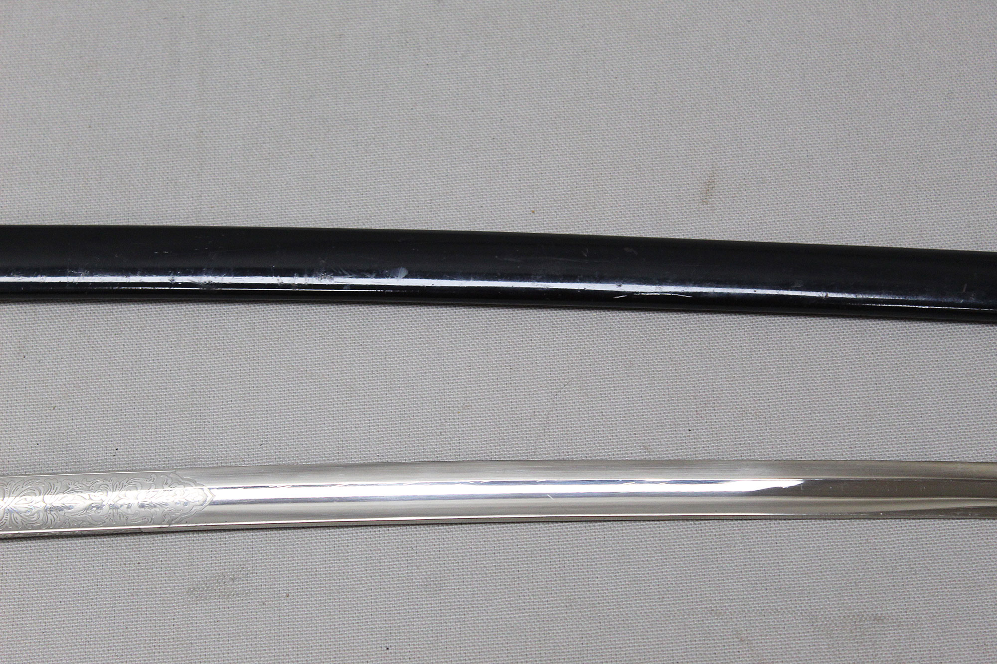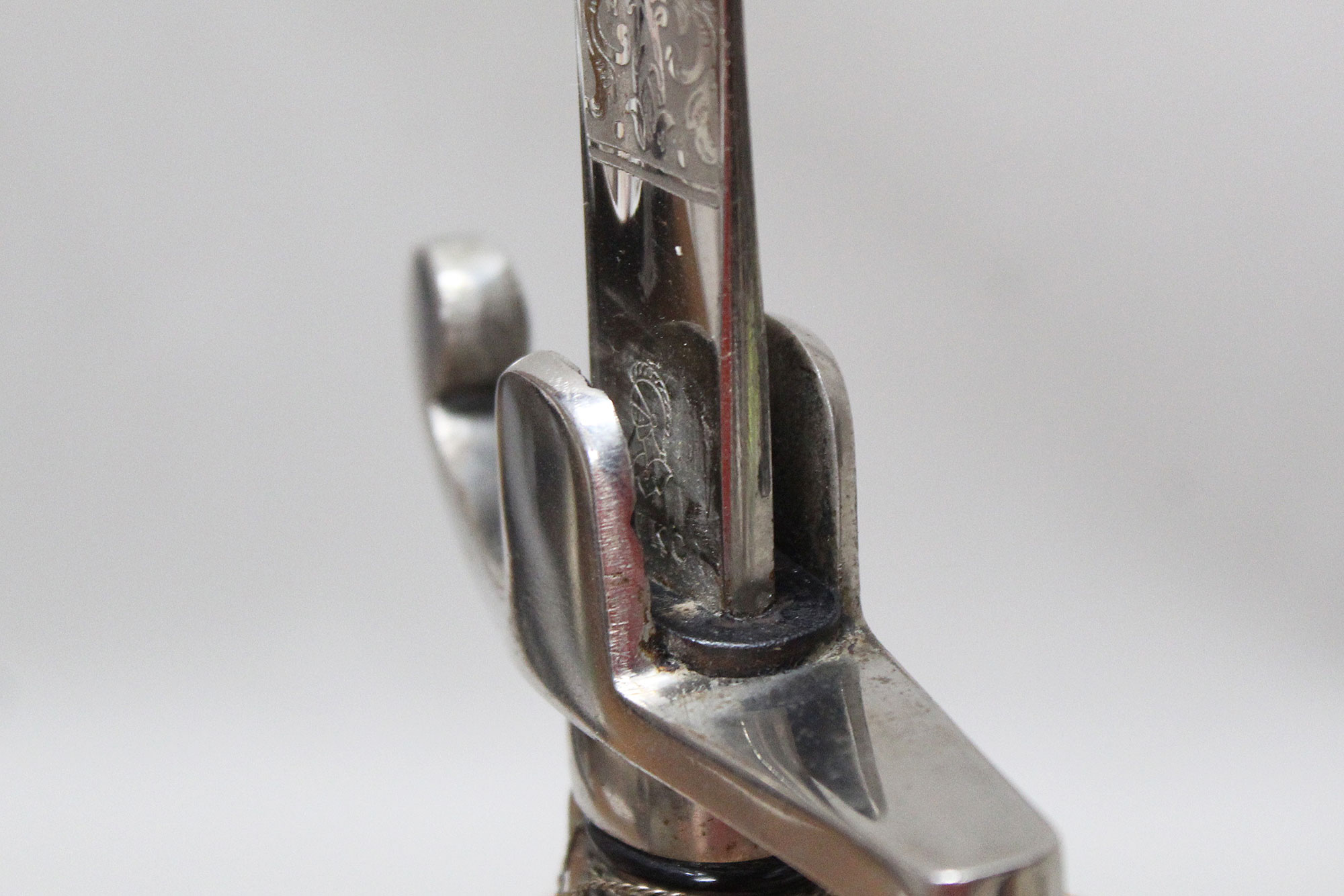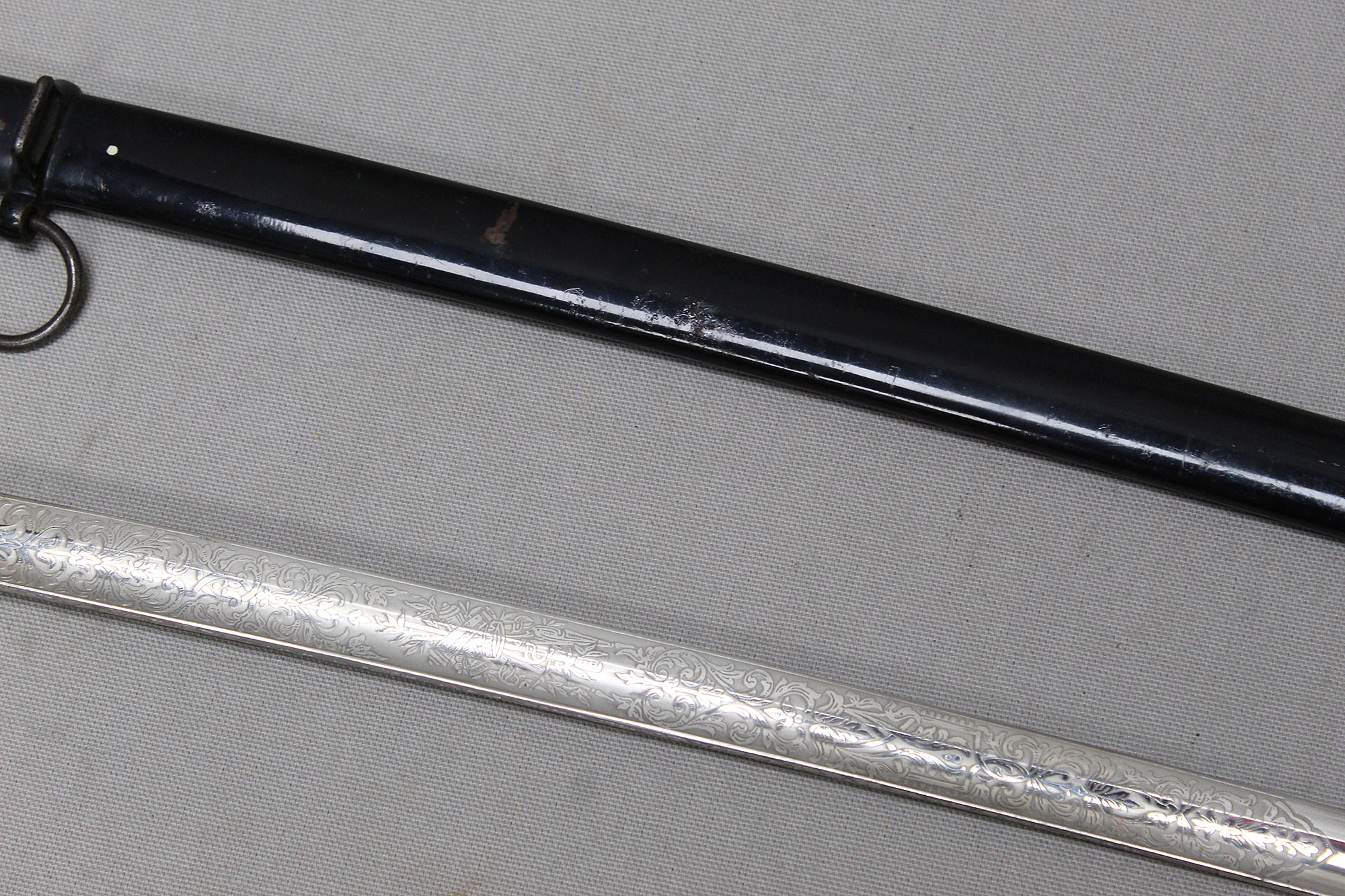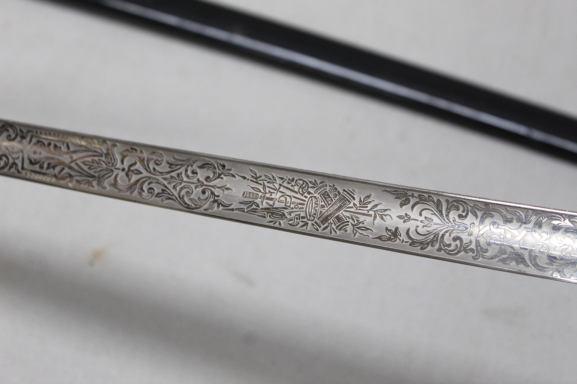 German Artillery NCO/Officer Sword. Triple engraved blade with artillery type scenes (soldiers on horseback pulling cannons, crossed cannons, etc.) Marker marked on blade ricasso with the WKC knight’s head logo. Blade in average condition and still has leather blade buffer pad in place. Black bakelite (plastic) covered wood core grip with triple wire wrap, the wire wrap is loose in several places. The nickel-plated steel hilt fittings in worn condition. Black painted single ring scabbard with some wear, scratches, and paint loss in areas. Blade length approximately 32 inches, approximately 38 inches overall length in scabbard. Most likely 1920s-1940s (Wiemar-WW2) era. Worn condition with loose wire wrap on grip.