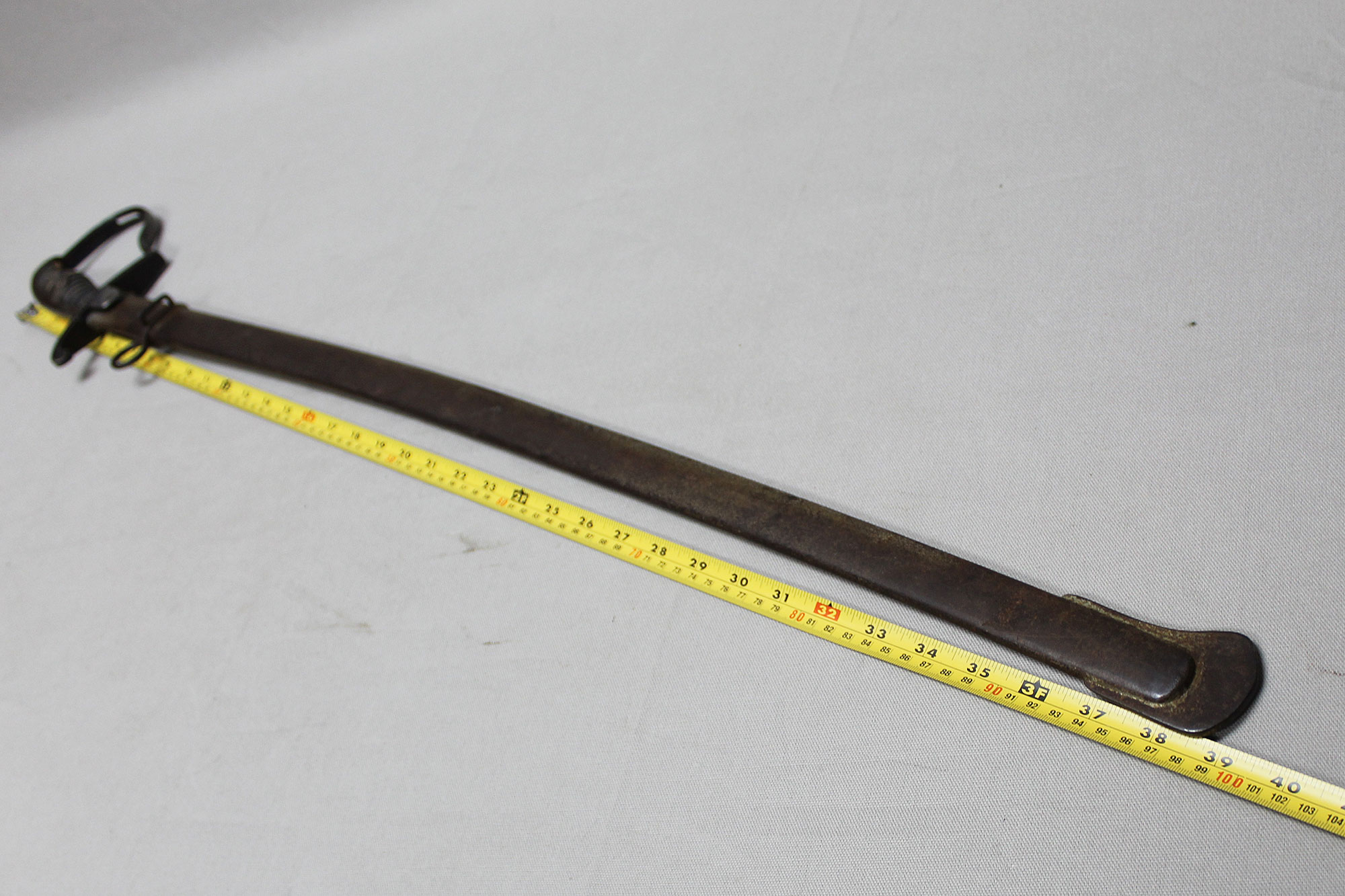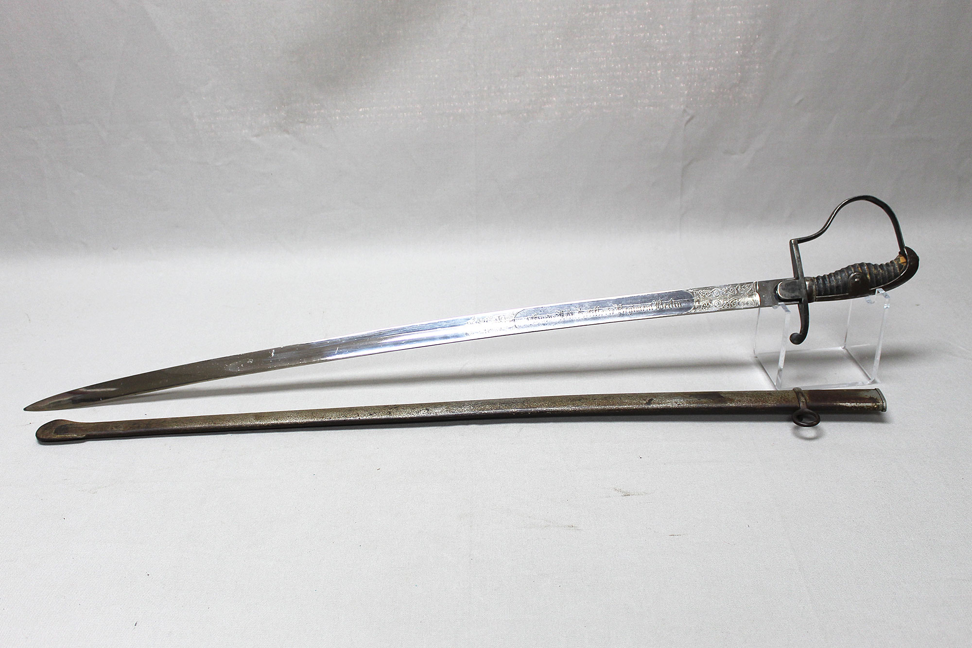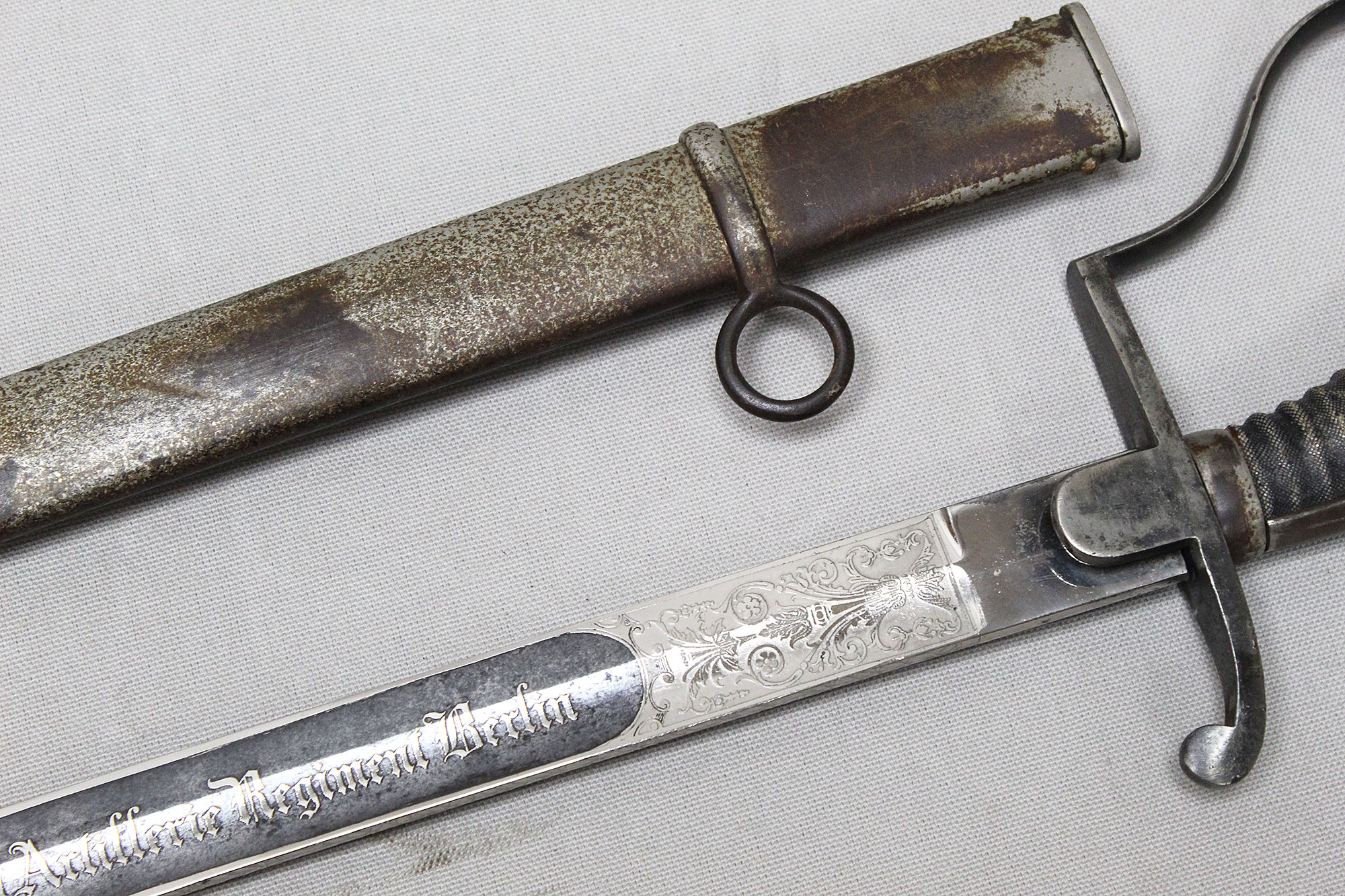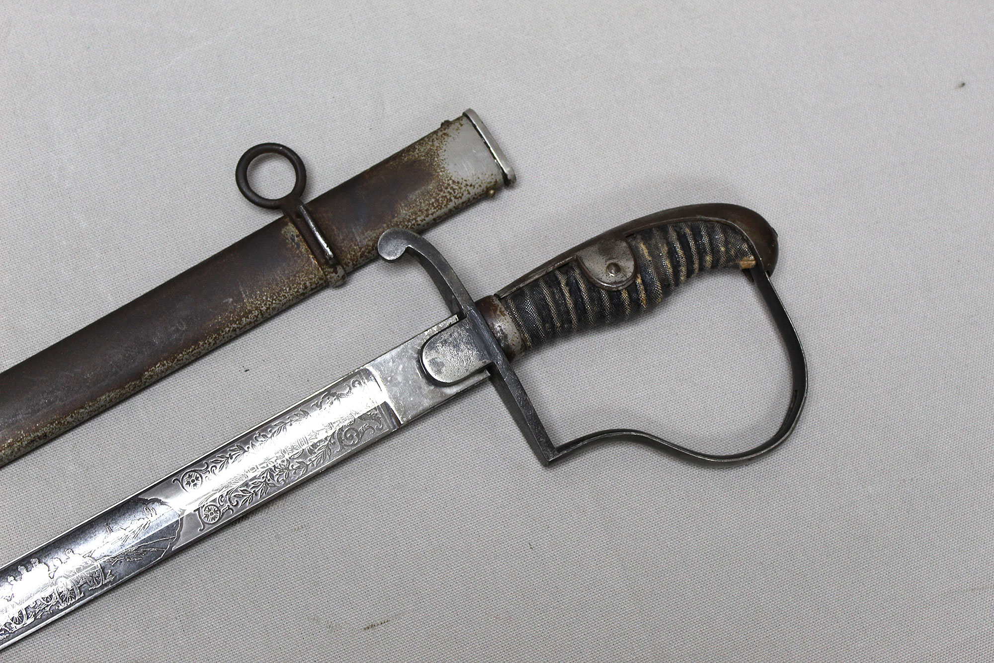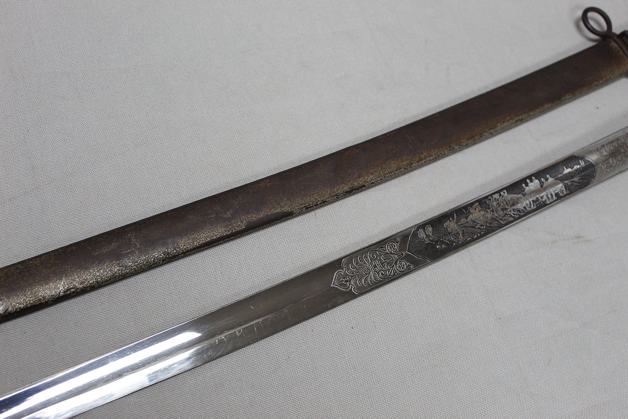 Imperial German Triple Engraved Sword. I do not see any maker logo or marks on this one. Engraved on darkened blade panel to: “1.Guarde Feld Artillerie Regiment Berlin” on one side and on the other side of blade the other darkened panel has an artillery scene. Worn condition ray skin type covering over wood core grip, no wire wrap left. A lot of wear to hilt and fittings. Also, scabbard is heavily worn condition as well. Blade length approximately 33 inches.