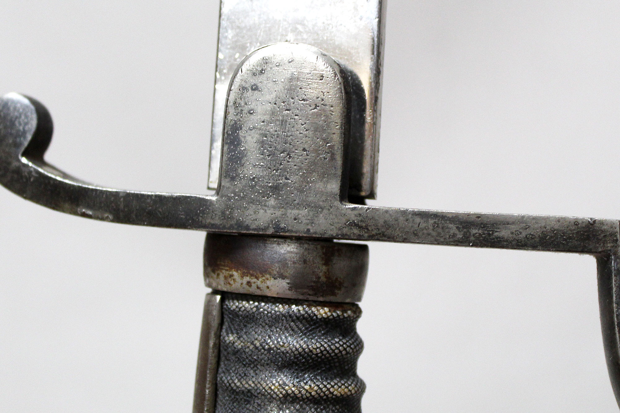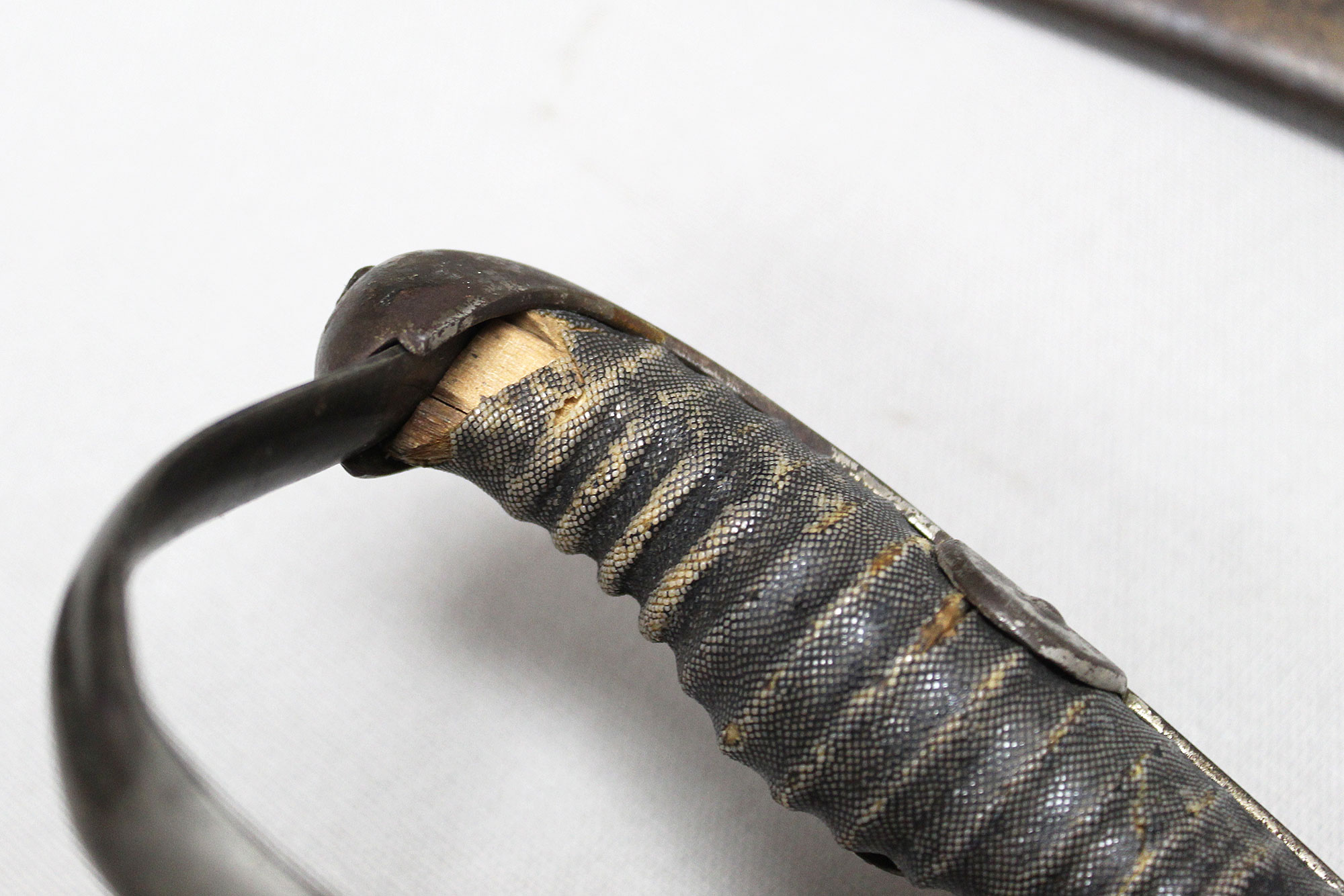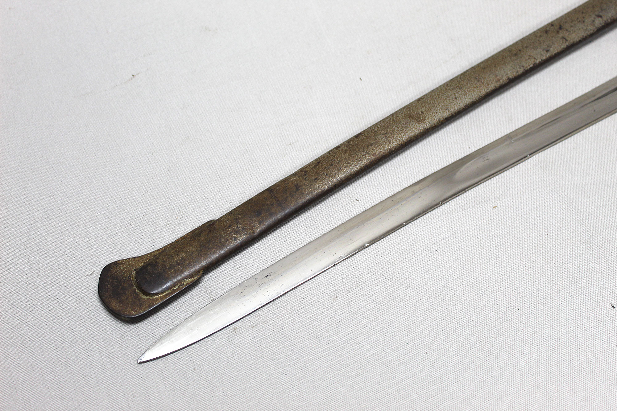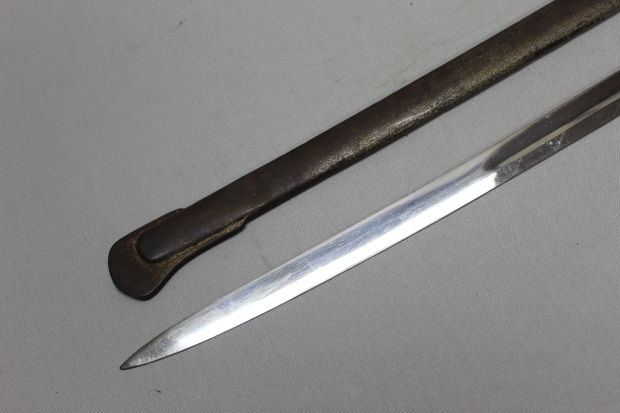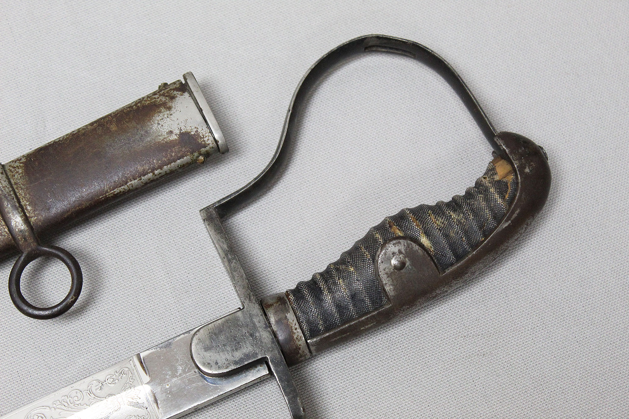 Imperial German Triple Engraved Sword. I do not see any maker logo or marks on this one. Engraved on darkened blade panel to: “1.Guarde Feld Artillerie Regiment Berlin” on one side and on the other side of blade the other darkened panel has an artillery scene. Worn condition ray skin type covering over wood core grip, no wire wrap left. A lot of wear to hilt and fittings. Also, scabbard is heavily worn condition as well. Blade length approximately 33 inches.
