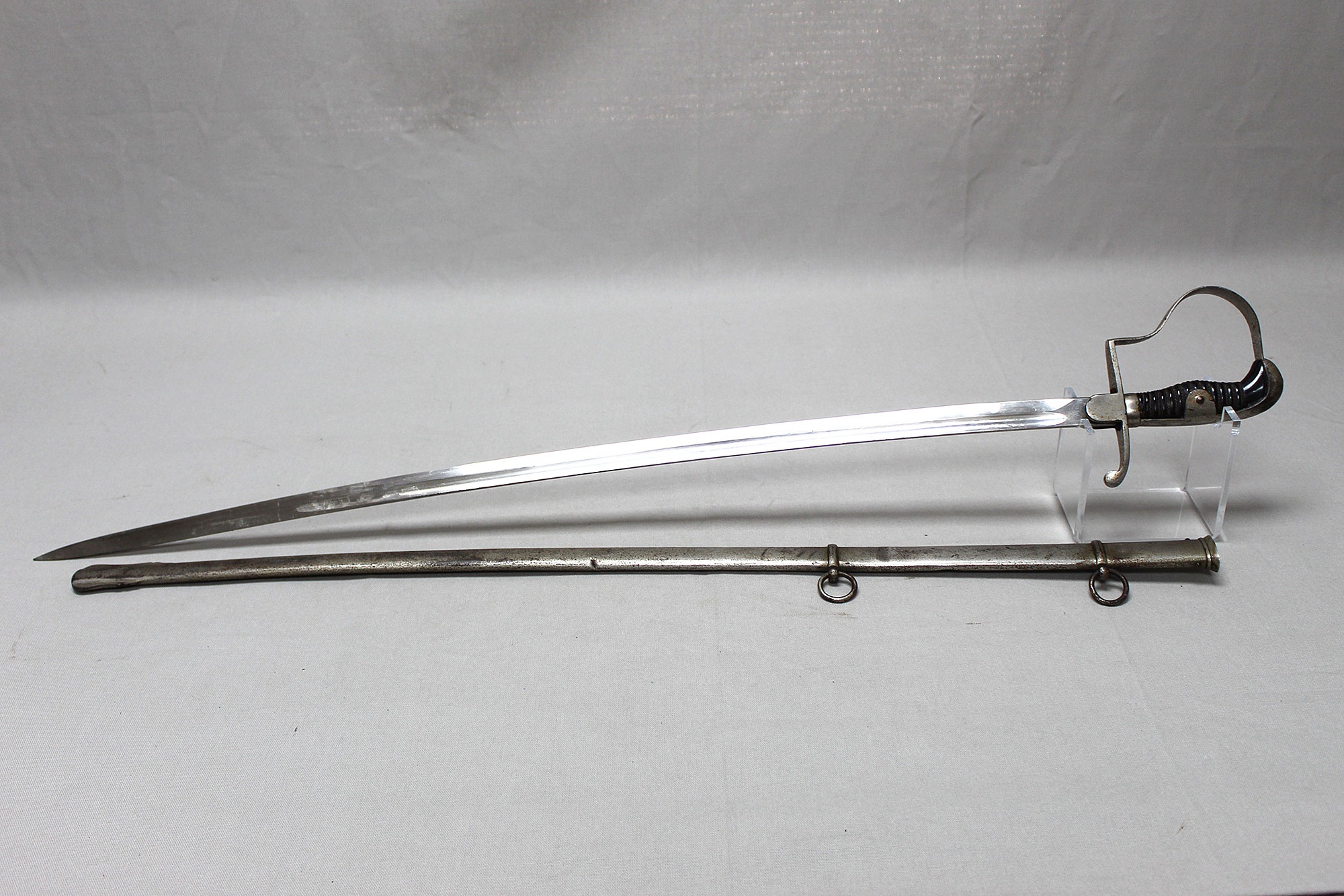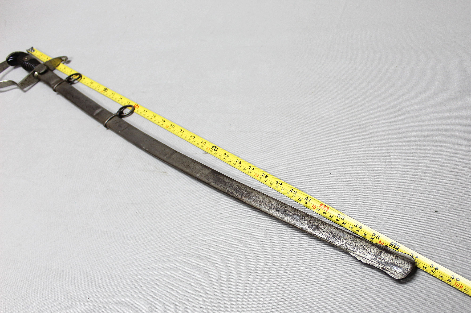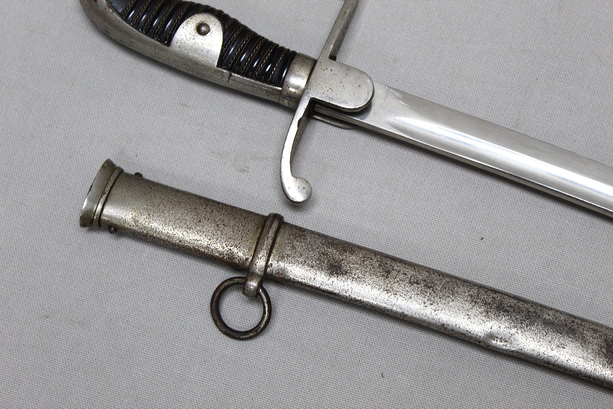 WW2 German Officers Sword. Blade marker marked with the ACS scales logo (for Alcoso Werks Solingen). Black bakelite covered wood core grip with triple wire wrap in decent condition with some wear. Nickel plated steel fittings in very worn condition. Also, the nickel-plated steel scabbard with two ring bands also in very worn condition with several hits to the scabbard. Blade length approximately 32 inches.
