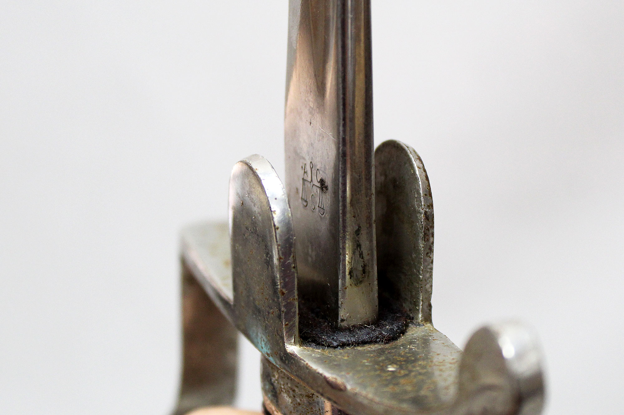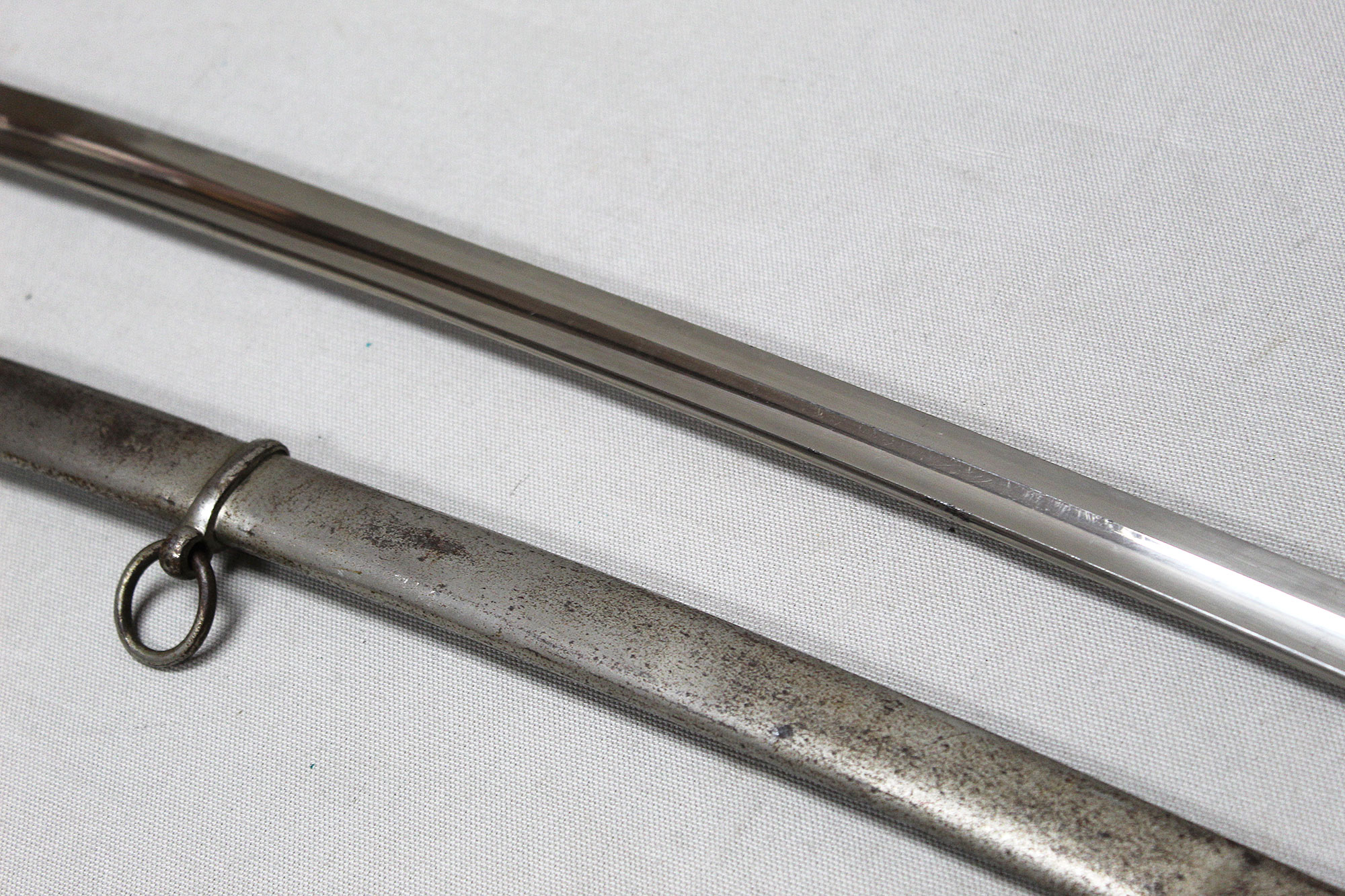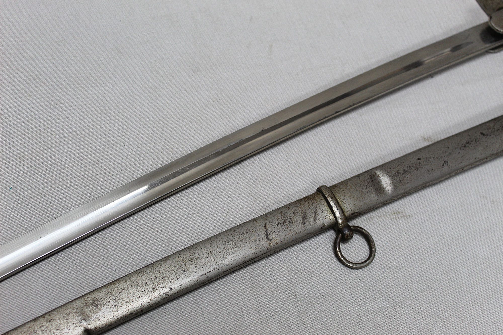 WW2 German Officers Sword. Blade marker marked with the ACS scales logo (for Alcoso Werks Solingen). Black bakelite covered wood core grip with triple wire wrap in decent condition with some wear. Nickel plated steel fittings in very worn condition. Also, the nickel-plated steel scabbard with two ring bands also in very worn condition with several hits to the scabbard. Blade length approximately 32 inches.