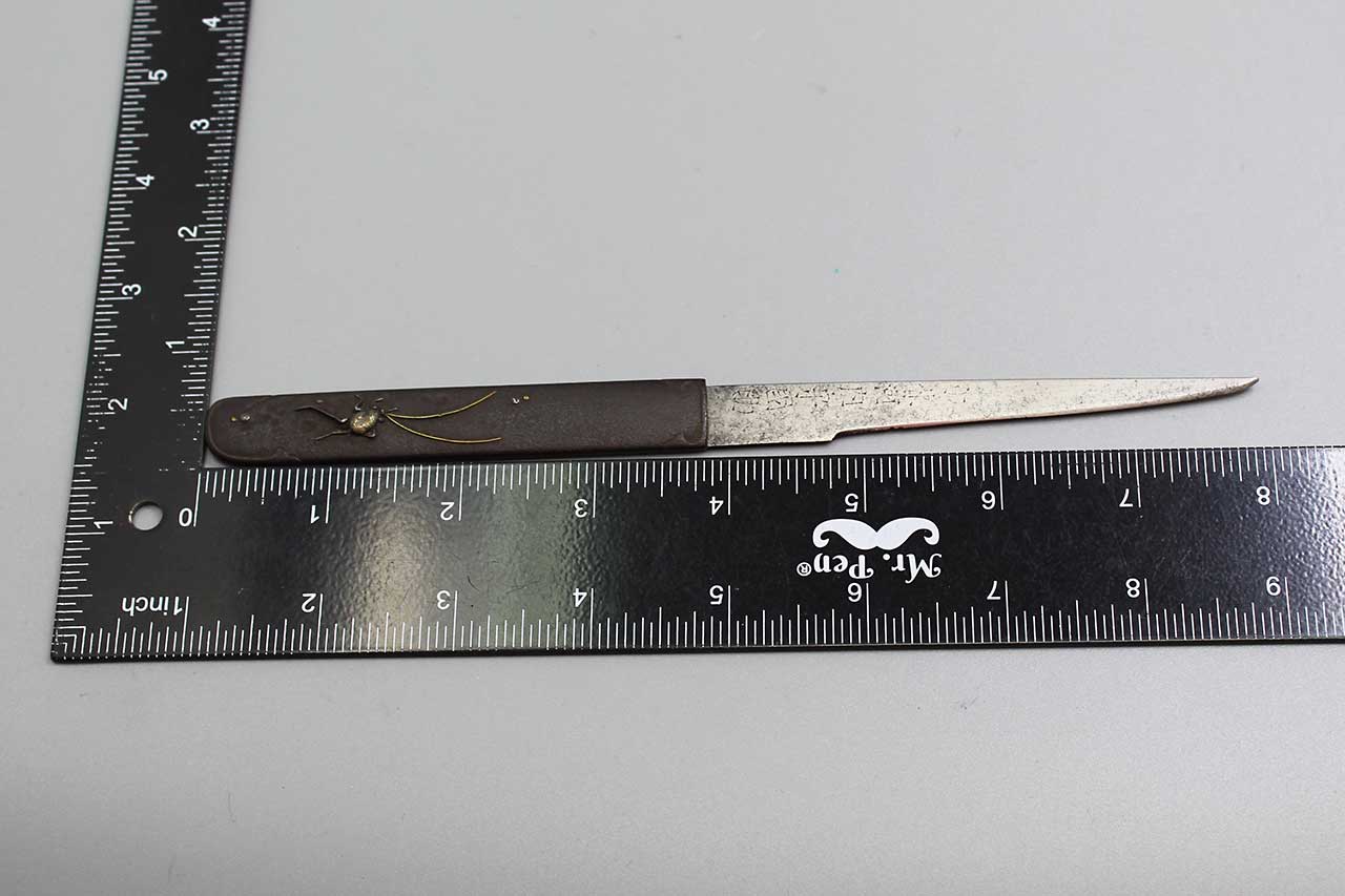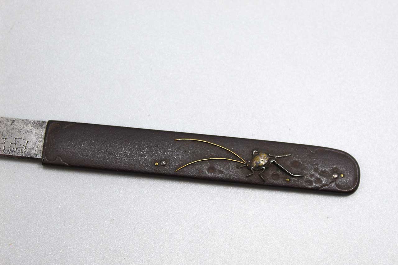 Japanese Antique Kozuka with blade. Insect type design with gold and silver highlights on handle. Blade with kanji. Most likely Early to Mid Edo period. Handle length approximately 3 3/4 inches, approximately 8 inches overall length. Worn condition.