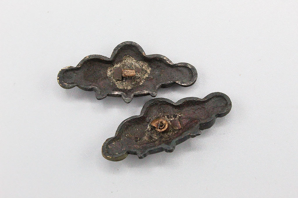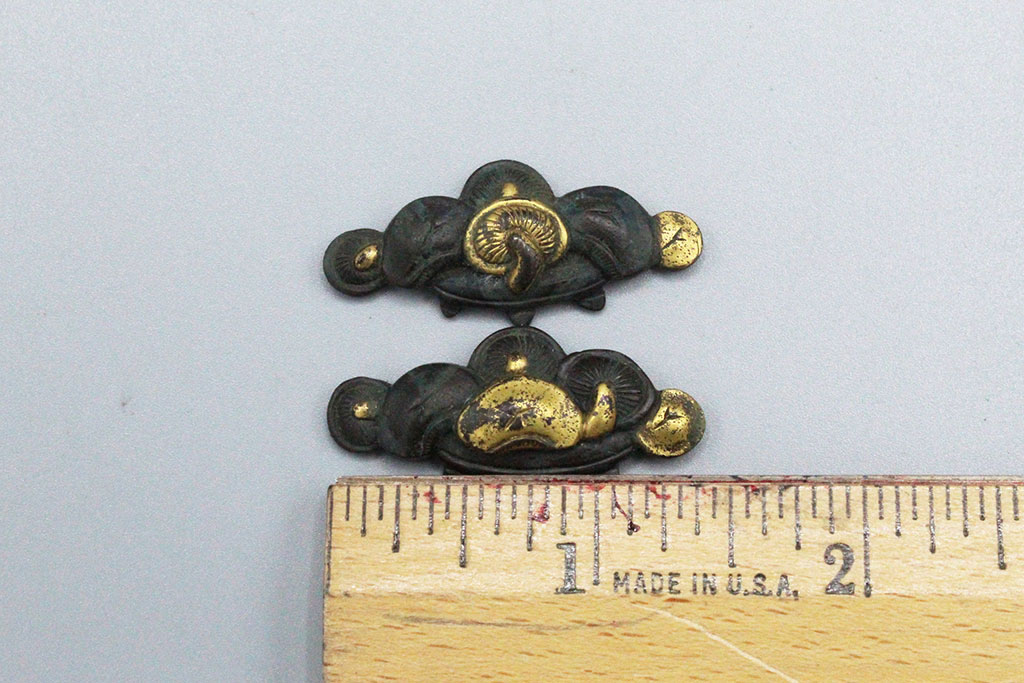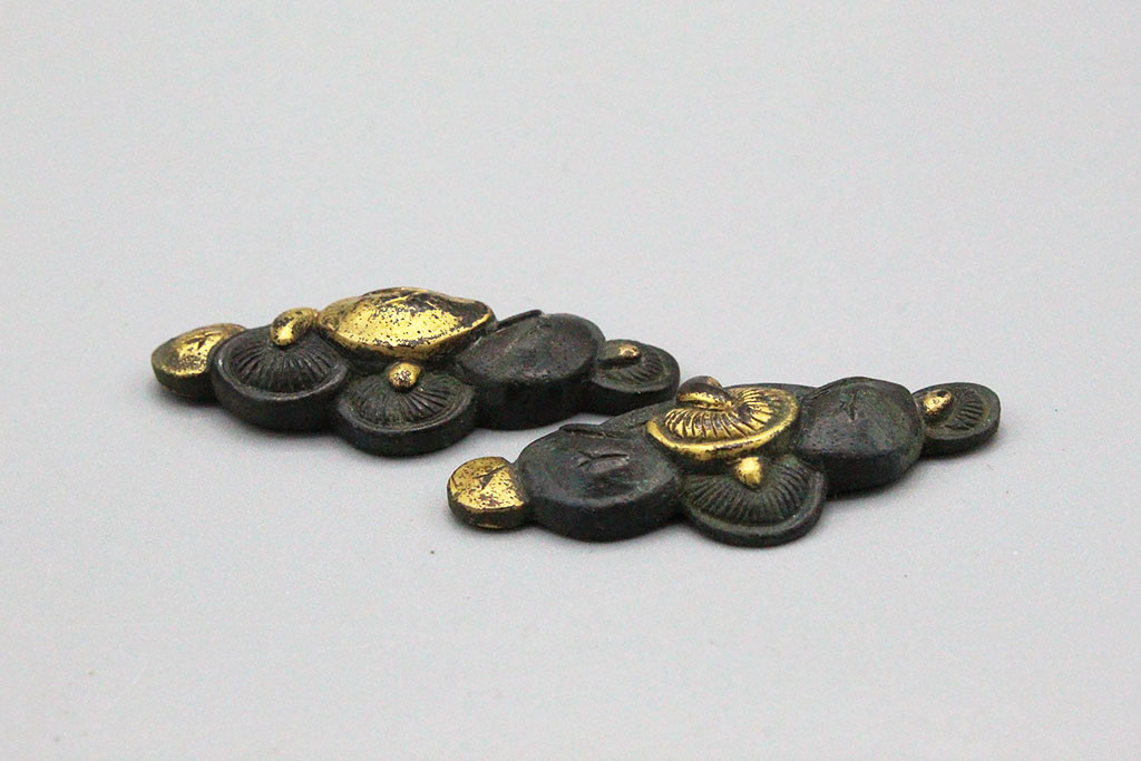 Japanese set of menuki. The menuki are the decorative metal ornaments that are woven under the handle wrapping. These ornaments were originally made to hide the mekugi pins that secure the tsuka to the tang of the blade. Edo period. Worn condition.